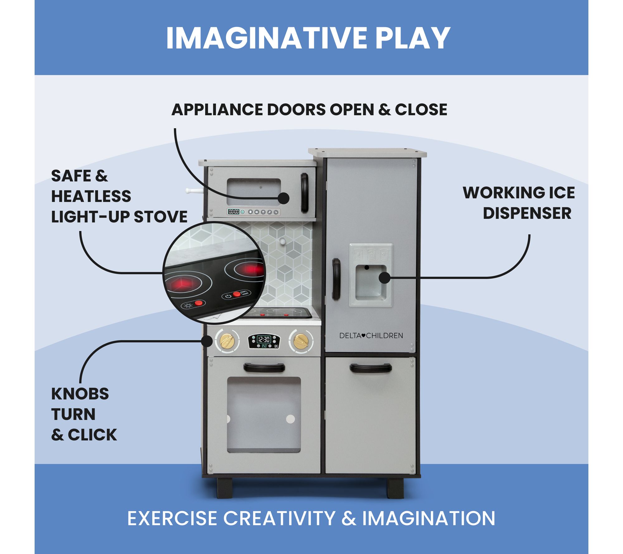 Little ones will love cooking up fun with the Delta Children Gourmet All-in-One Corner Play Kitchen. This sleek play kitchen features all the modern-day conveniences, like stovetop burners with lights and knobs that turn and click. From Delta Children.