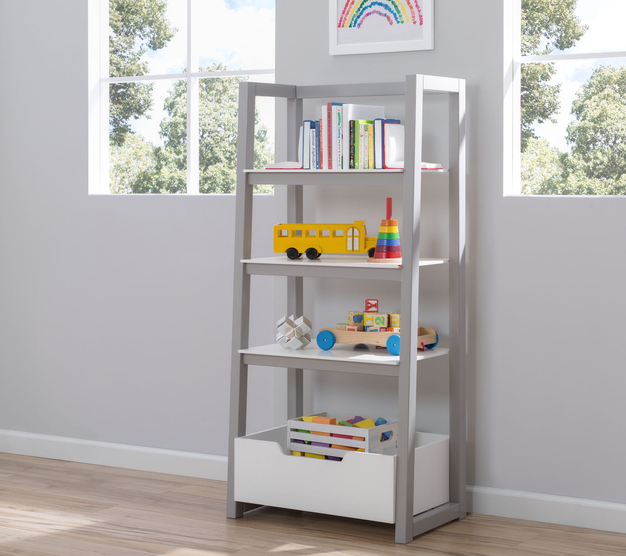 A fun and functional way to store books, toys, and more, this ladder shelf features a sleek and modern design that works well in any space. From Delta Children.