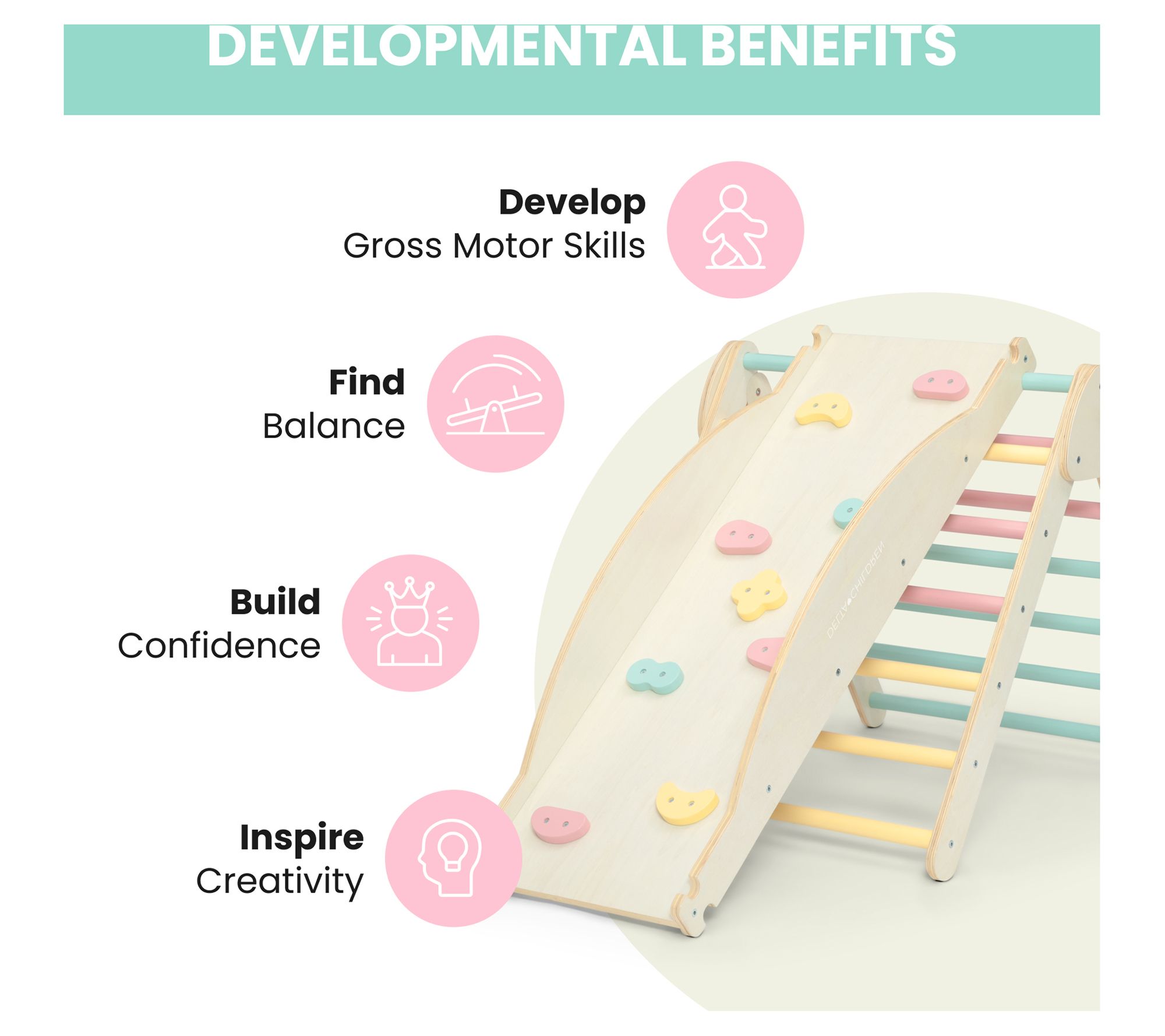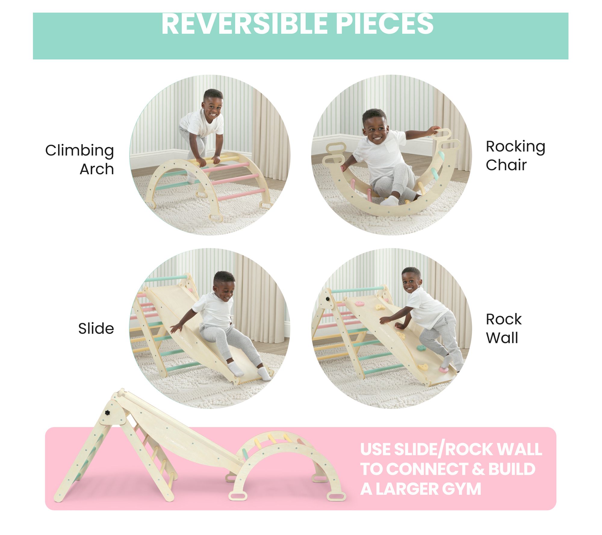 • Includes reversible arch, reversible rock wall/slide ramp, and Pikler triangle