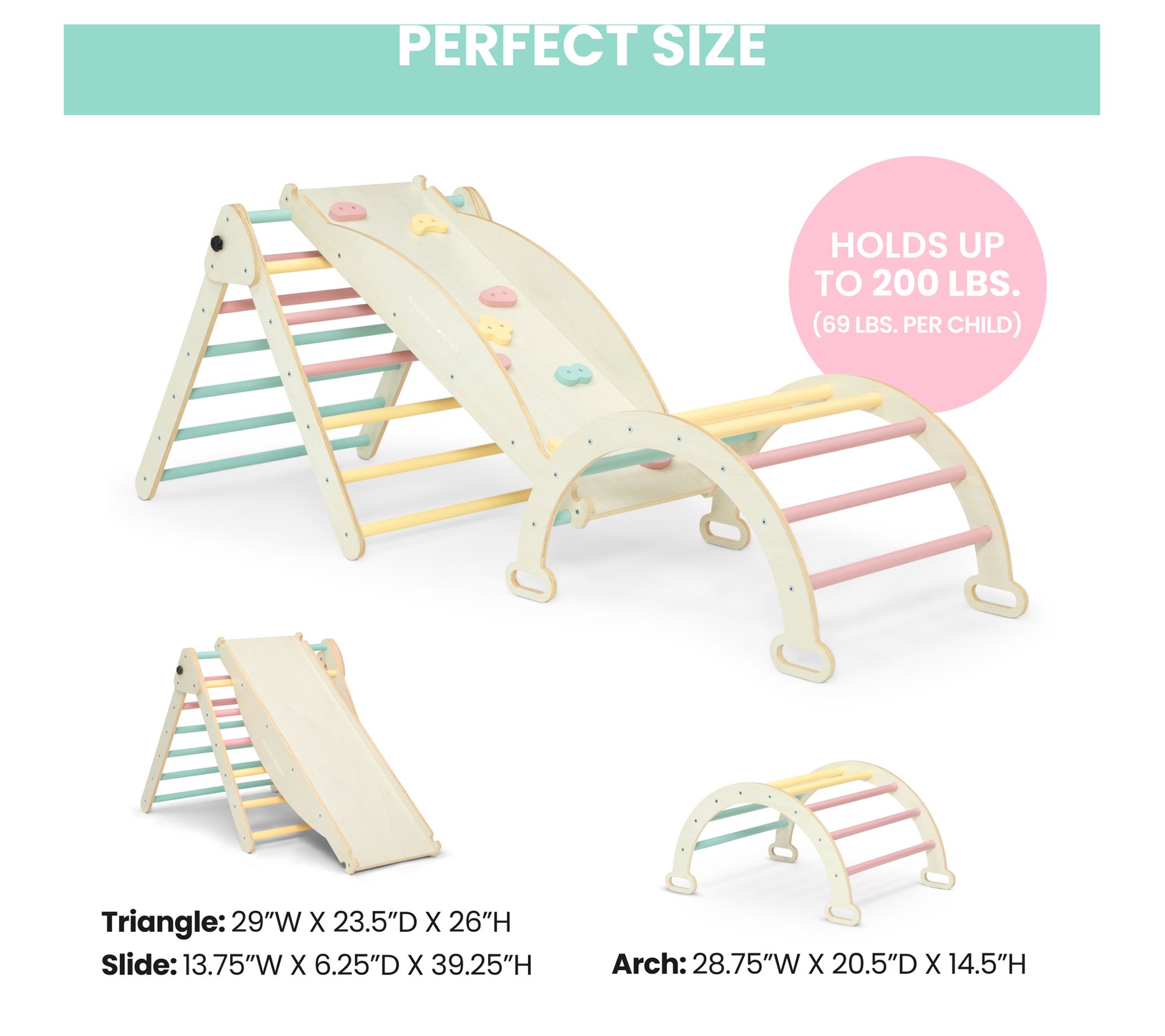 • Measures Arch: 28.75"W x 20.5"D x 14.5"H; Triangle: 29"W x 23.5"D x 26"H; Slide: 13.75"W x 6.25"D x 39.25"H; holds up to 200 lbs (69 lbs per child)