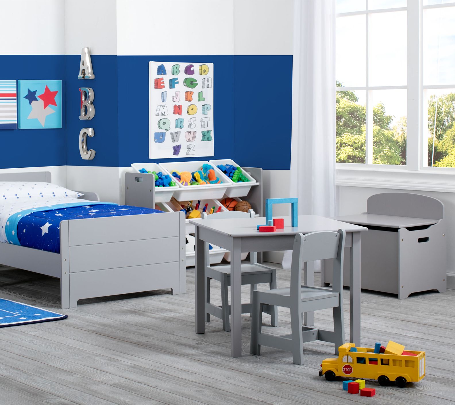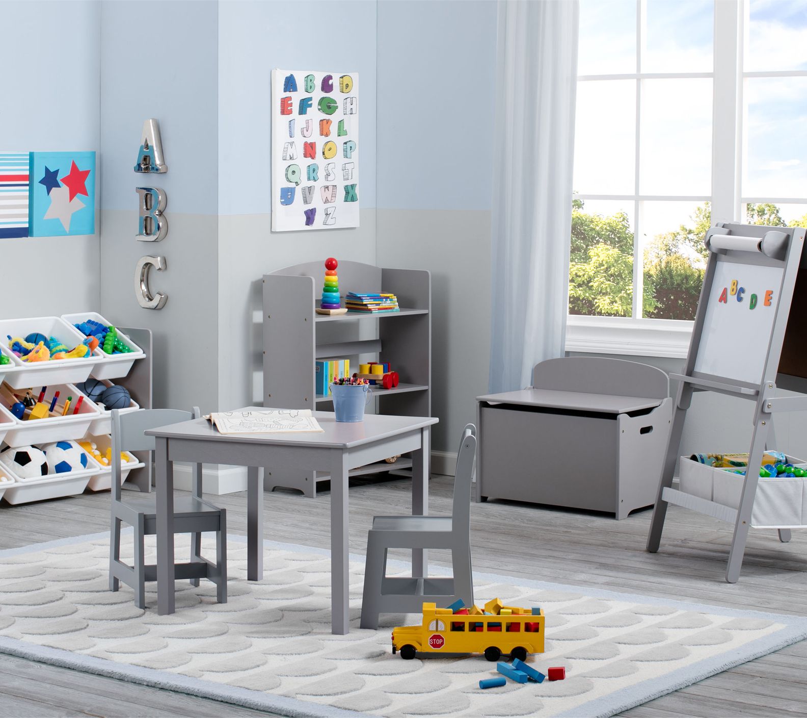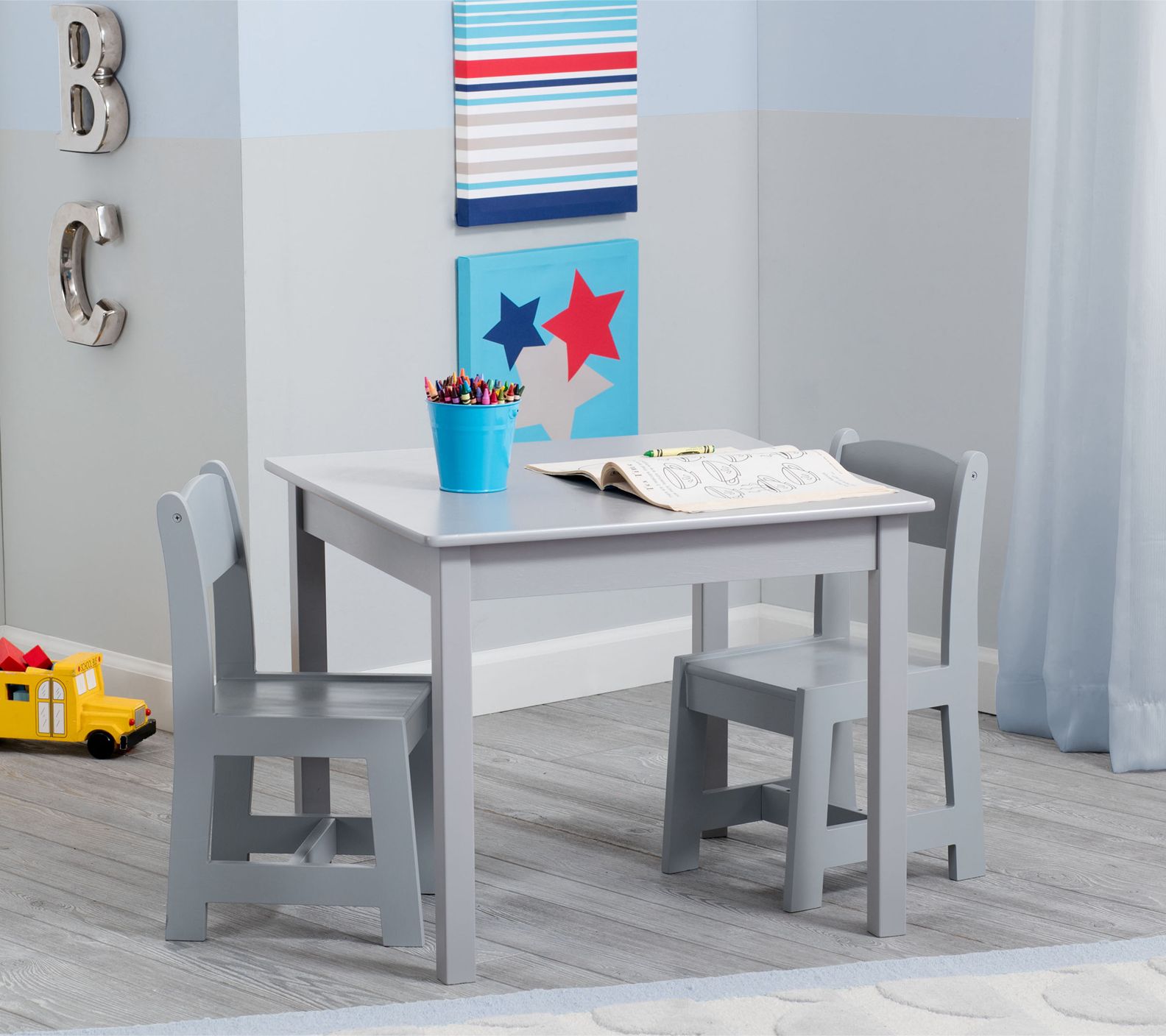 Sized just right for little ones, this sturdy wood table and chairs set features a classic silhouette that can be used for everything from art projects to snack breaks to homework time. From Delta Children.