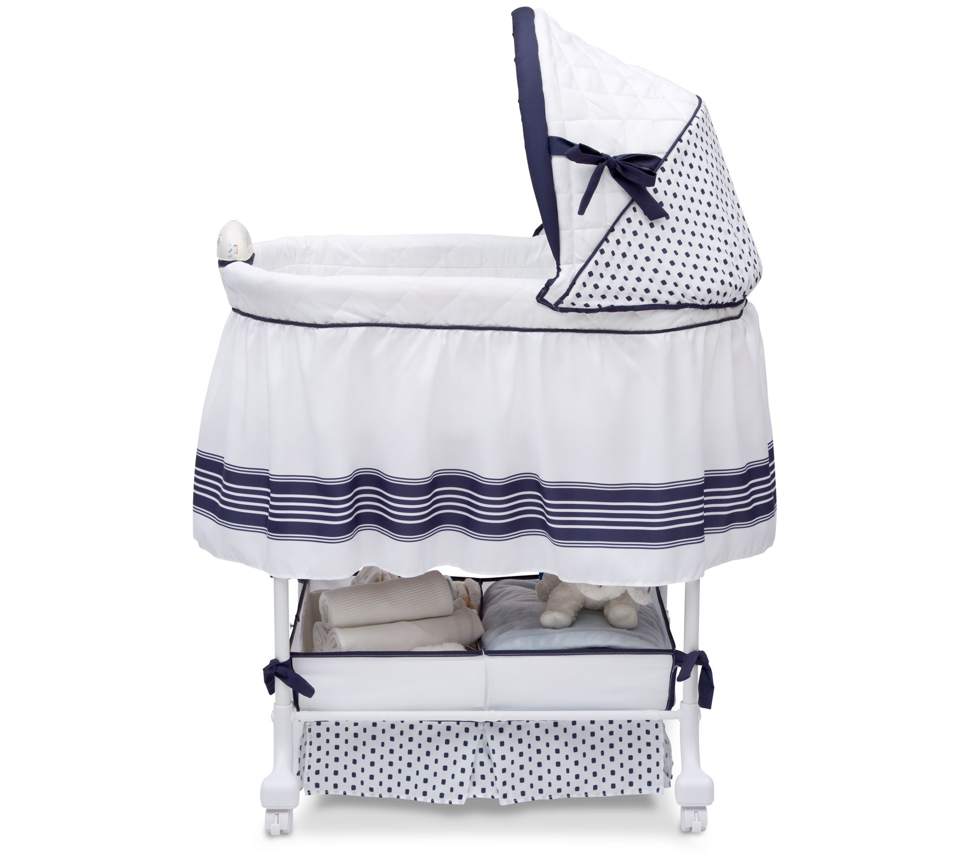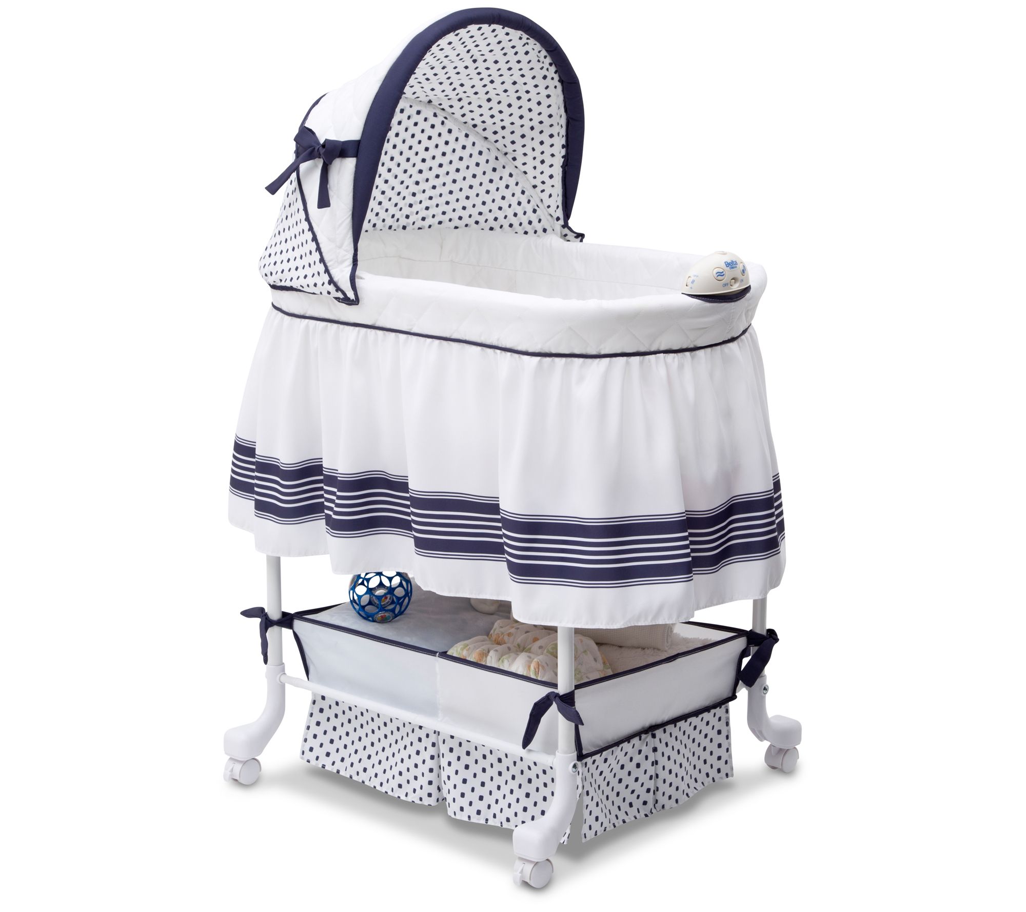 Lull your baby to sleep with gentle vibrations, a soft nightlight, and the sound of sweet music inside this gliding bassinet. From Delta Children.