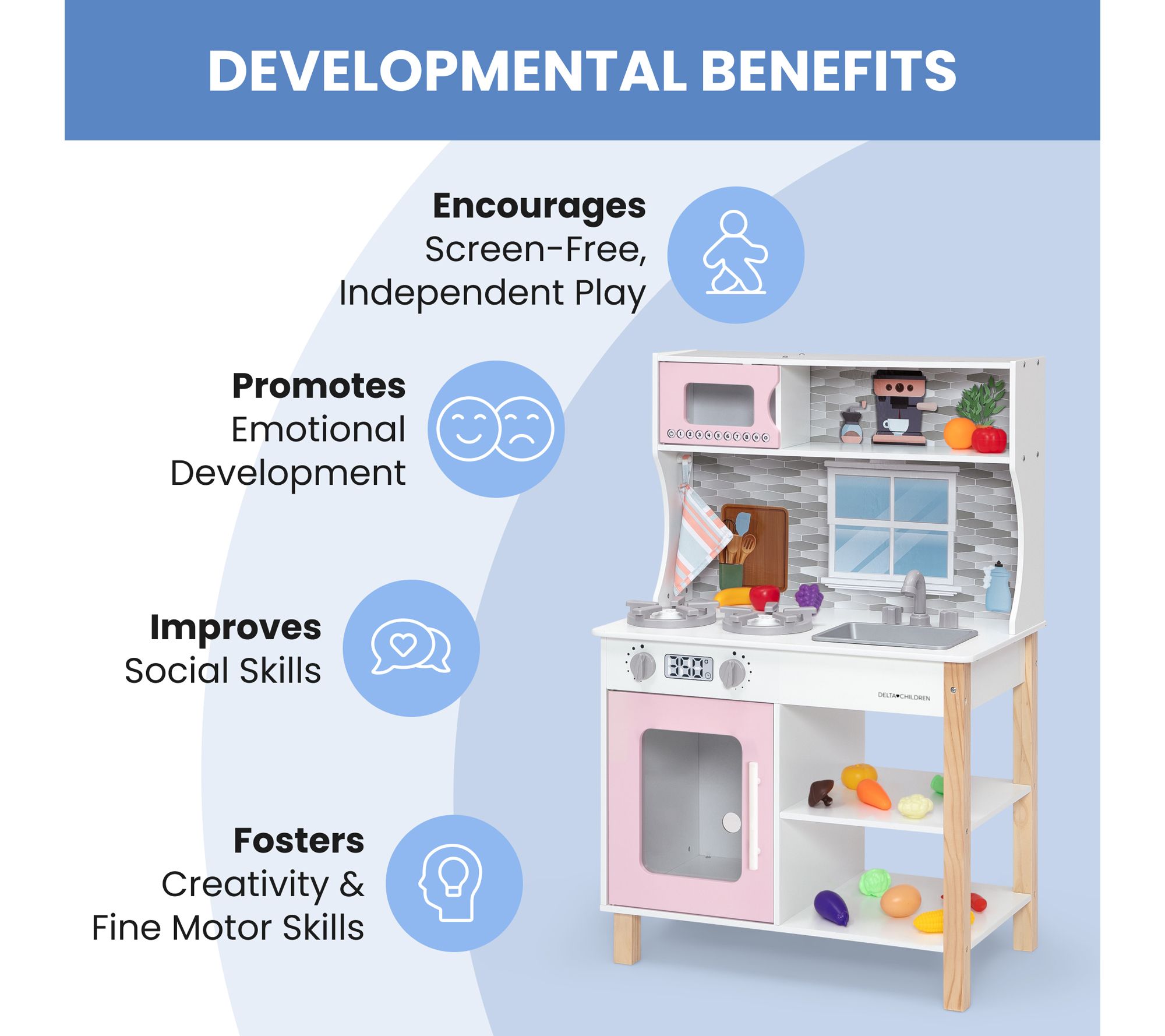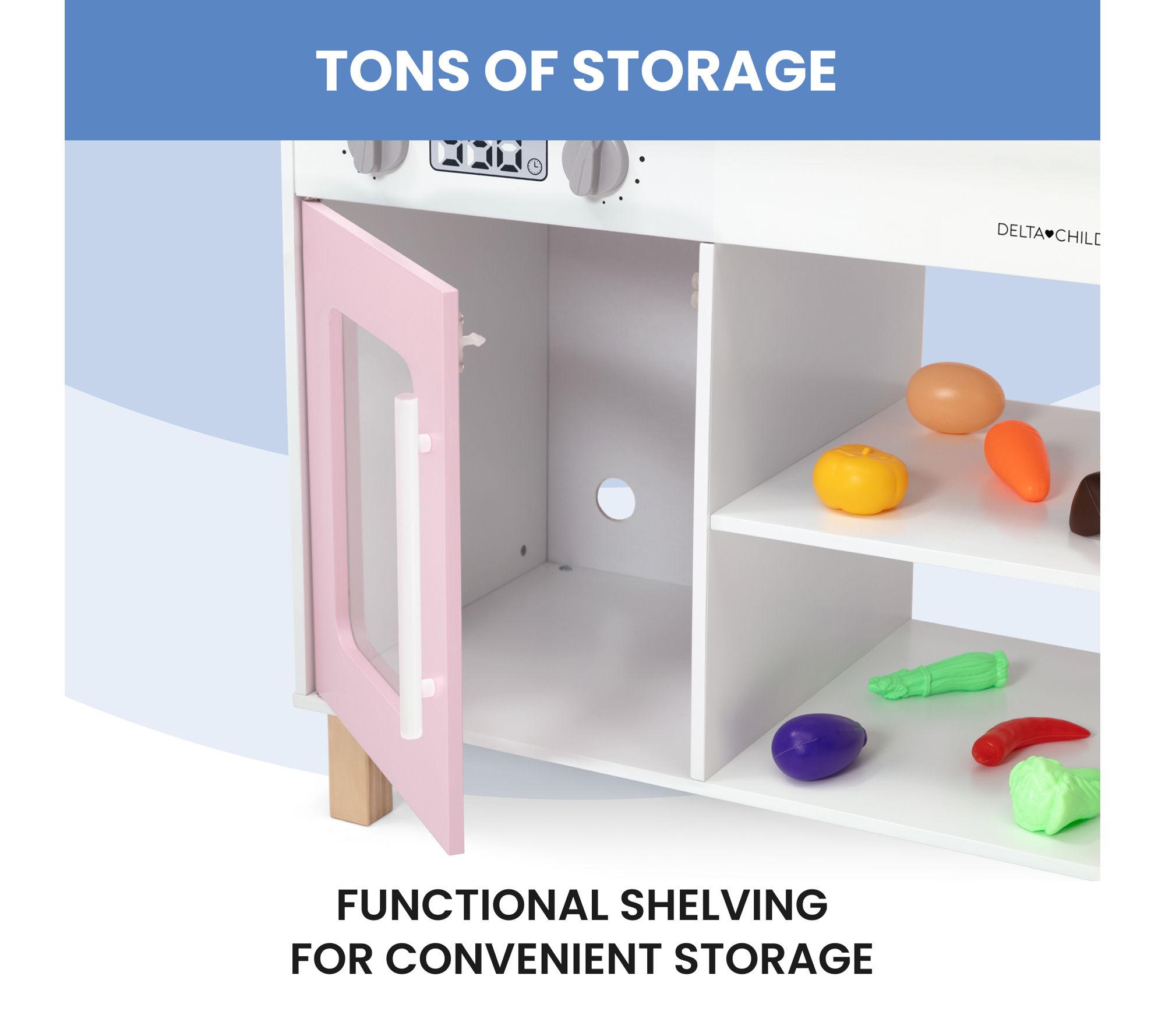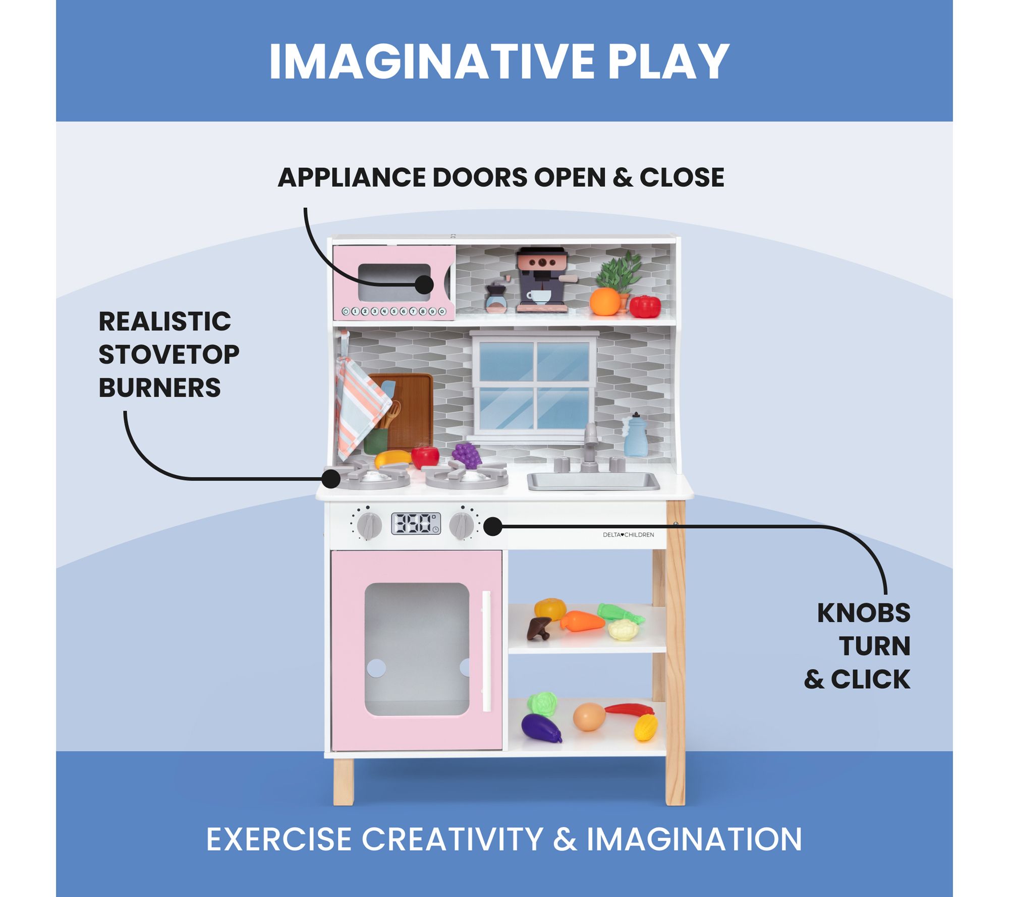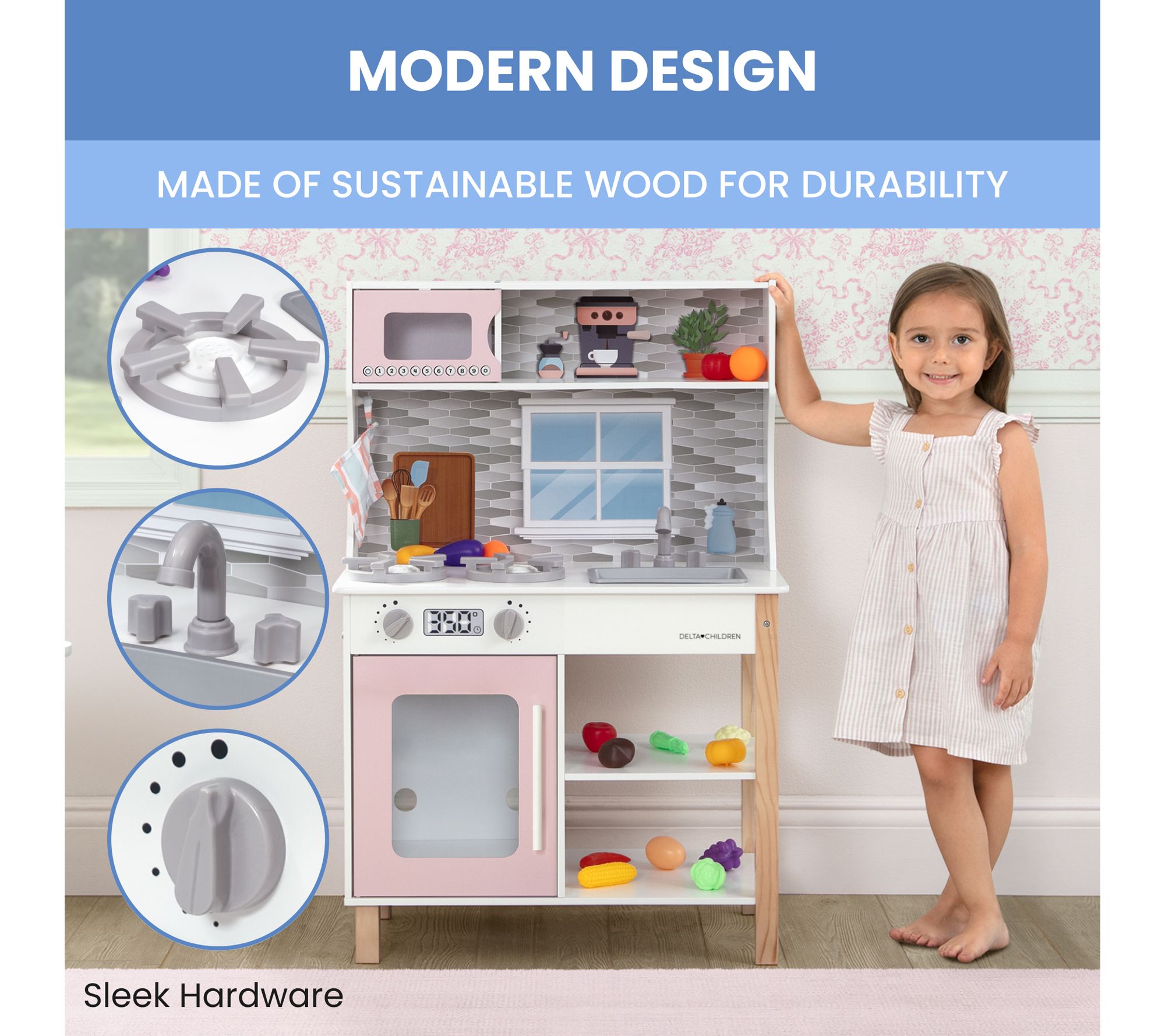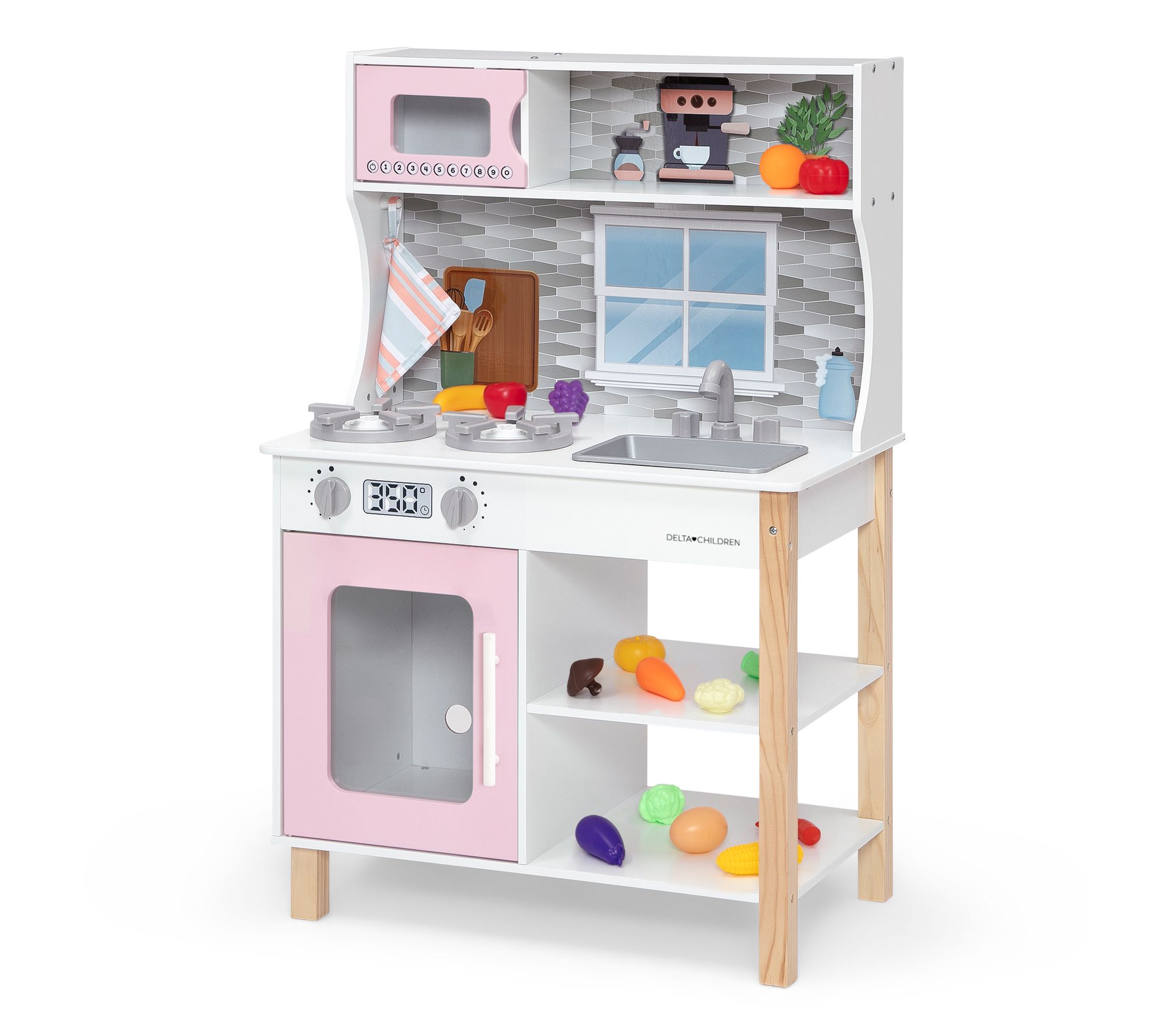 Your little one will enjoy endless hours of imaginative play with the Delta Children Tiny Chef play kitchen. This realistic kitchen set features stovetop burners, knobs that turn and click, and appliance doors that open and close, just like a real kitchen. From Delta Children.