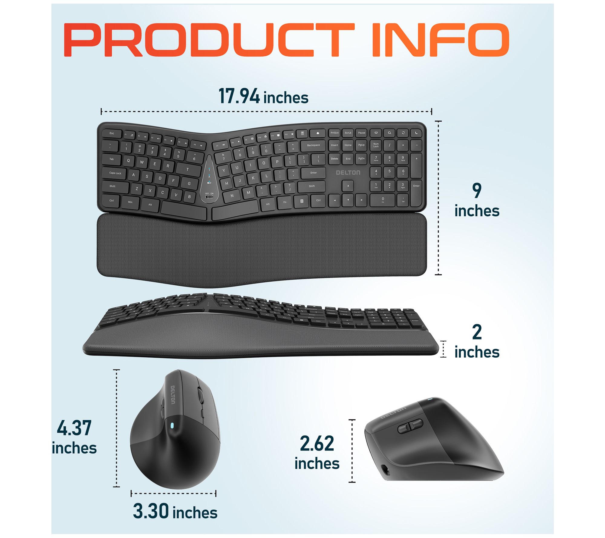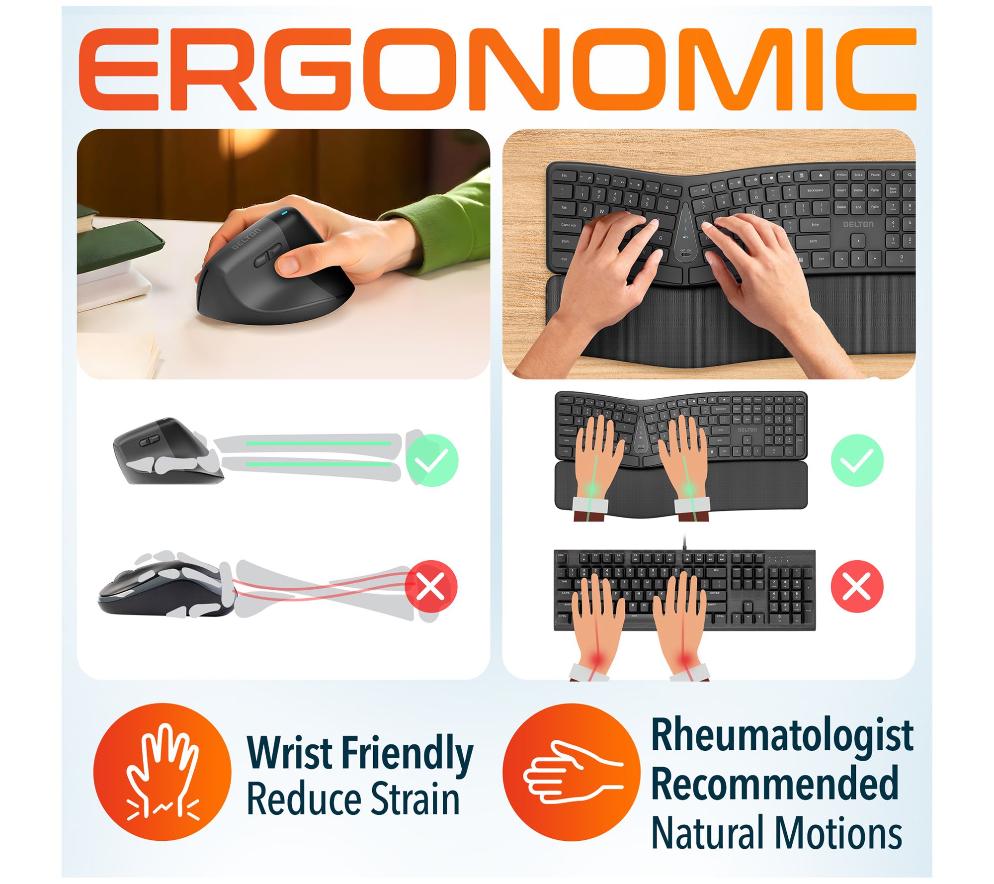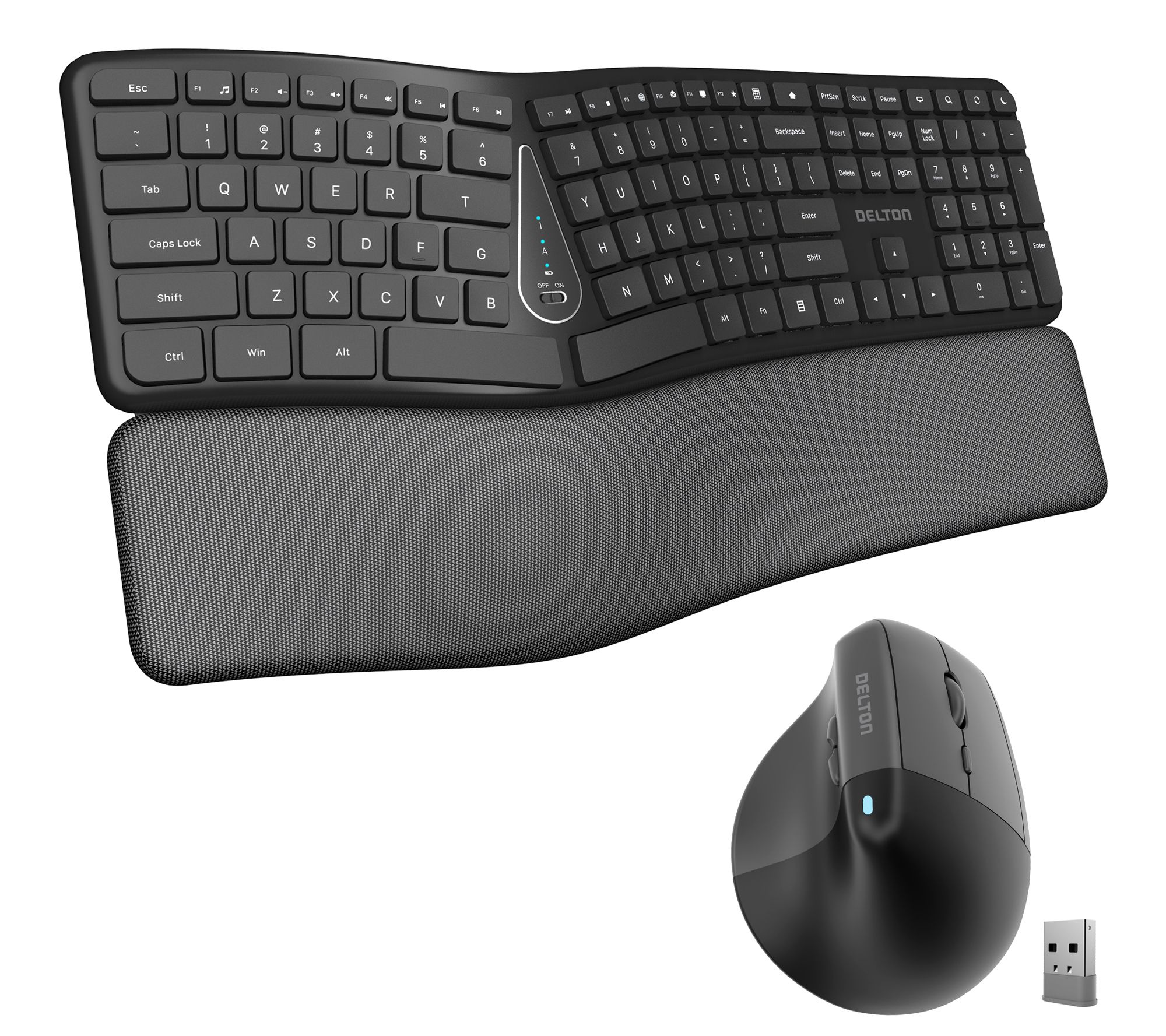 Transform your work experience with the Delton KB250 wireless keyboard and S38 optical mouse combo. The silent wireless keyboard features a plush pillow wrist rest and a curved design, ensuring natural wrist positioning during extended sessions. Paired with the vertical design of the mouse, this set helps promotes healthy posture, making it perfect for professionals and multitaskers. From Delton.