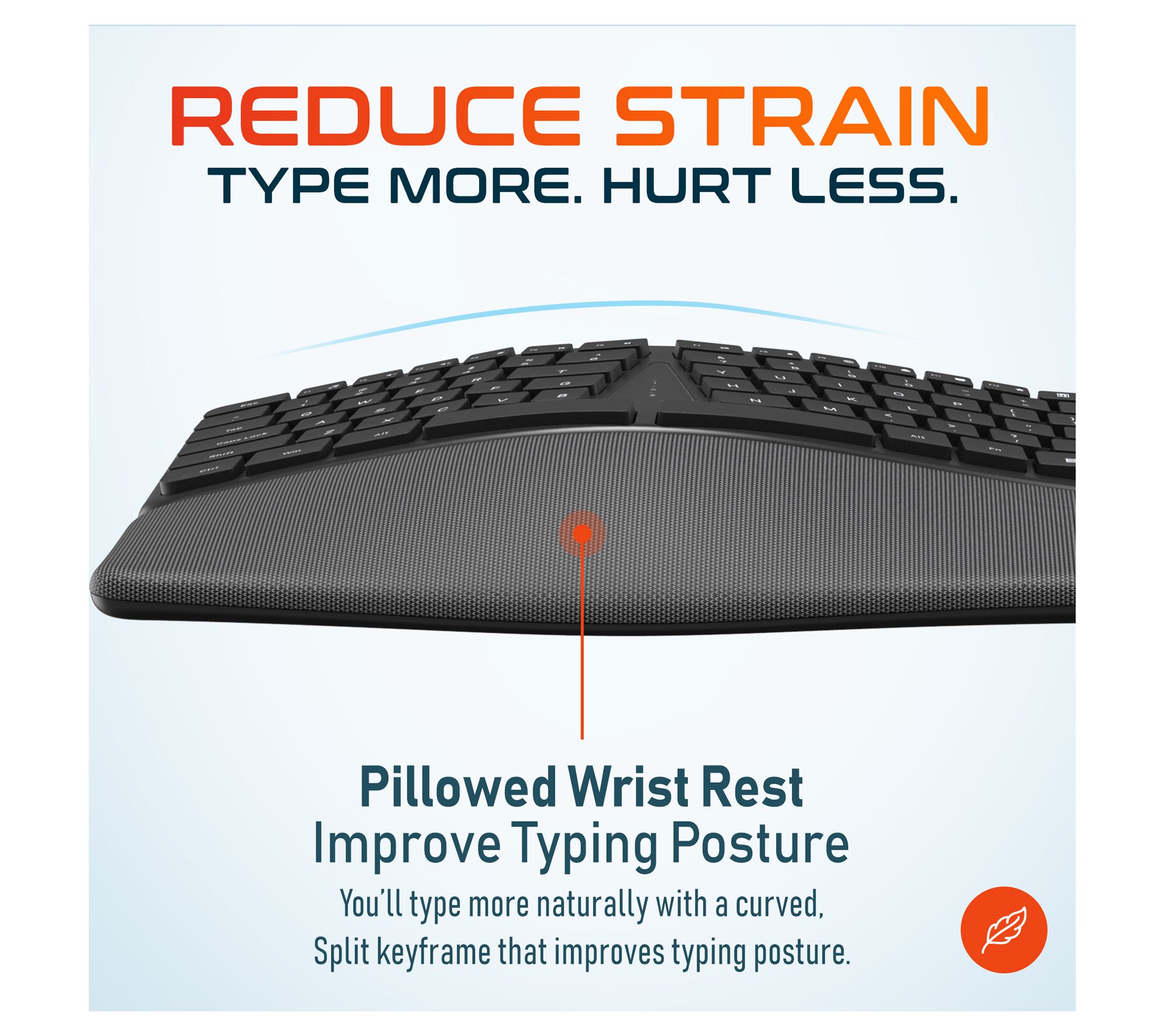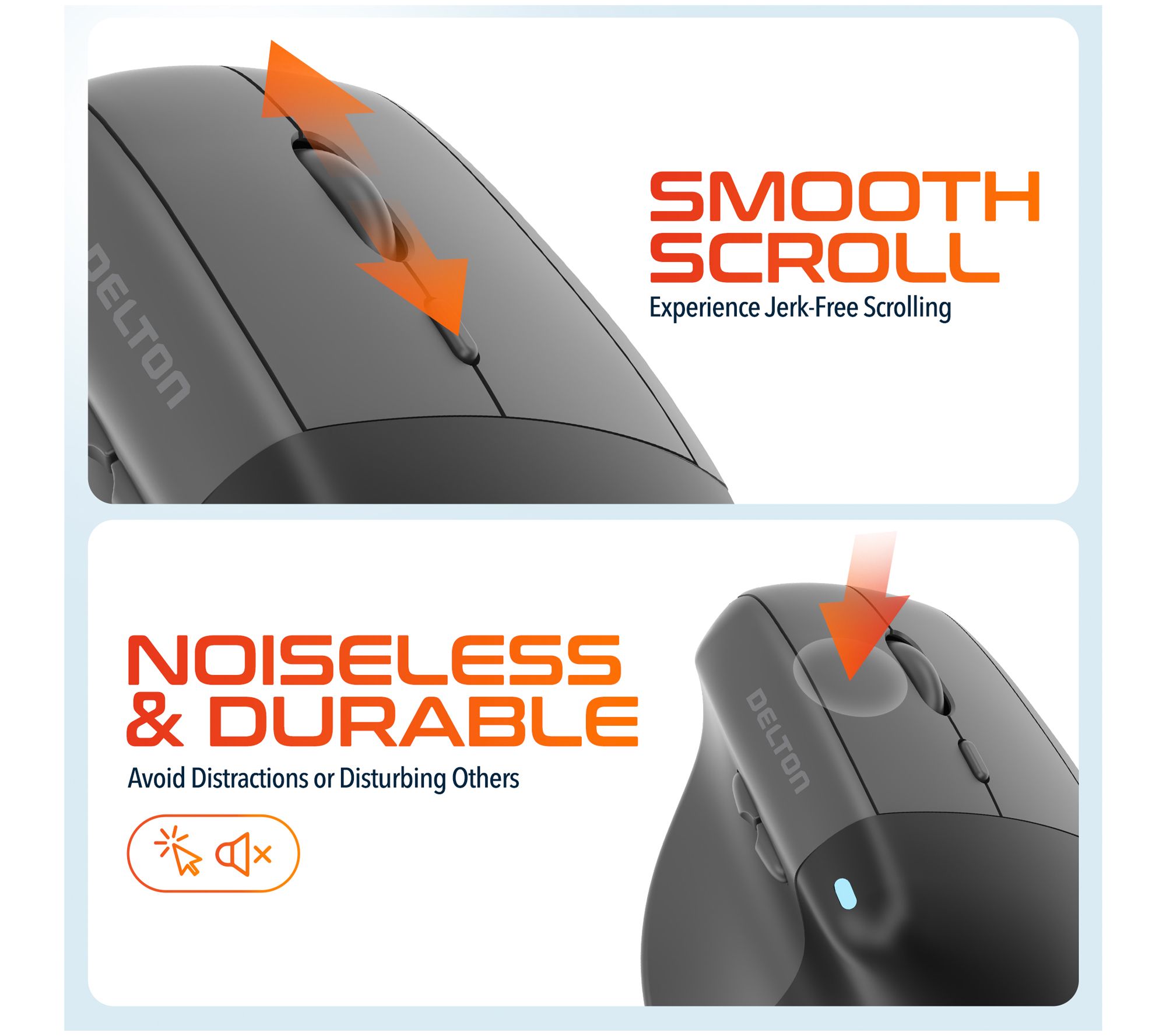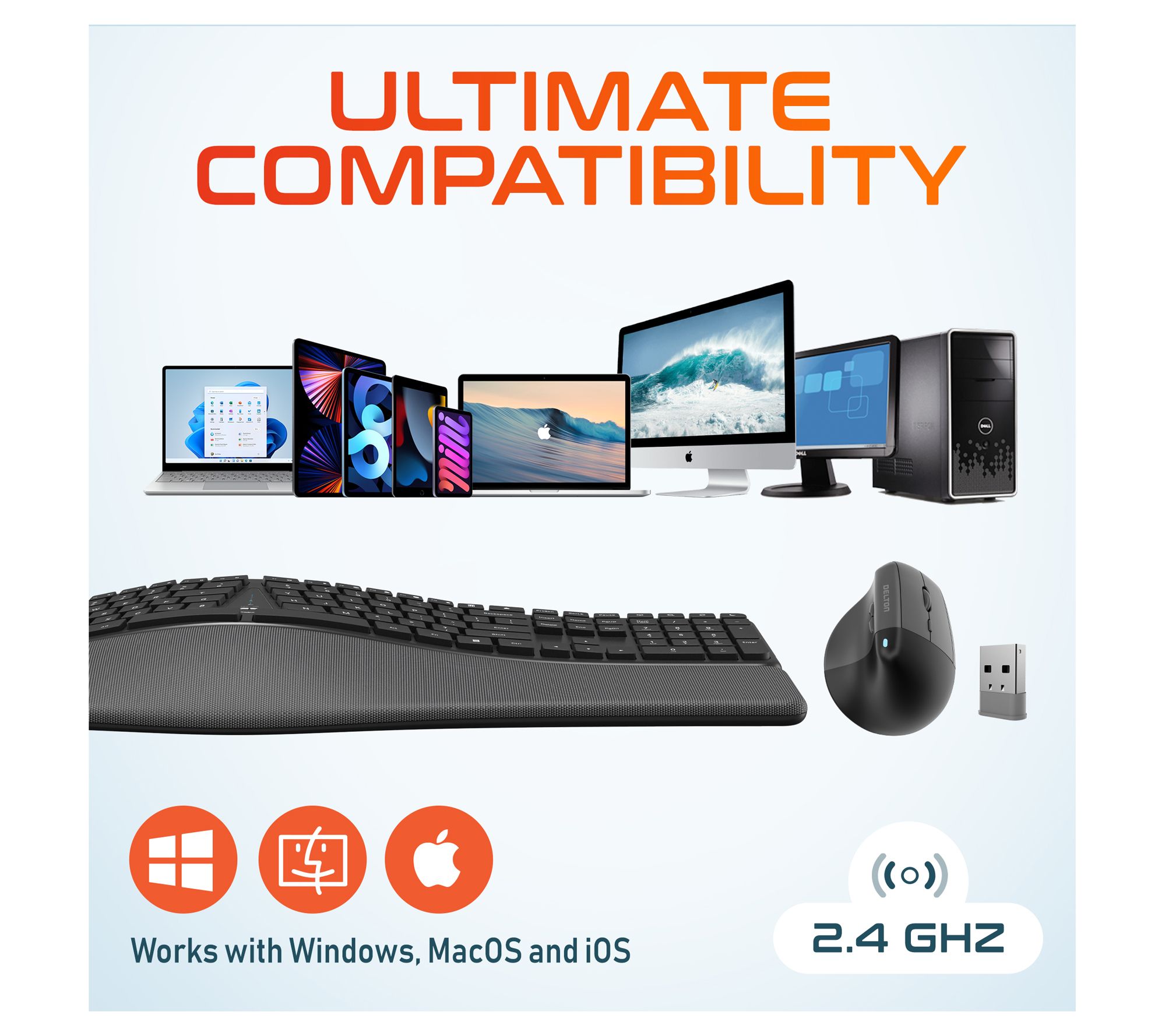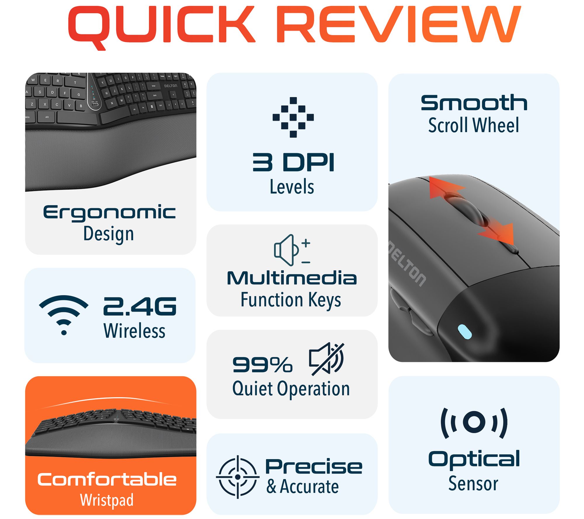 Transform your work experience with the Delton KB250 wireless keyboard and S38 optical mouse combo. The silent wireless keyboard features a plush pillow wrist rest and a curved design, ensuring natural wrist positioning during extended sessions. Paired with the vertical design of the mouse, this set helps promotes healthy posture, making it perfect for professionals and multitaskers. From Delton.