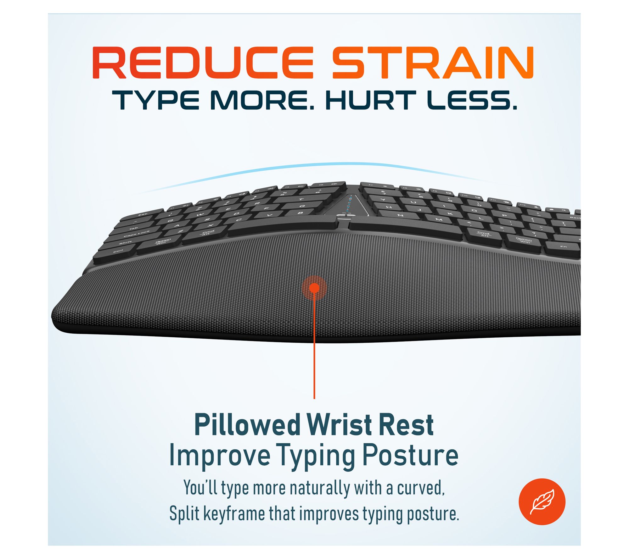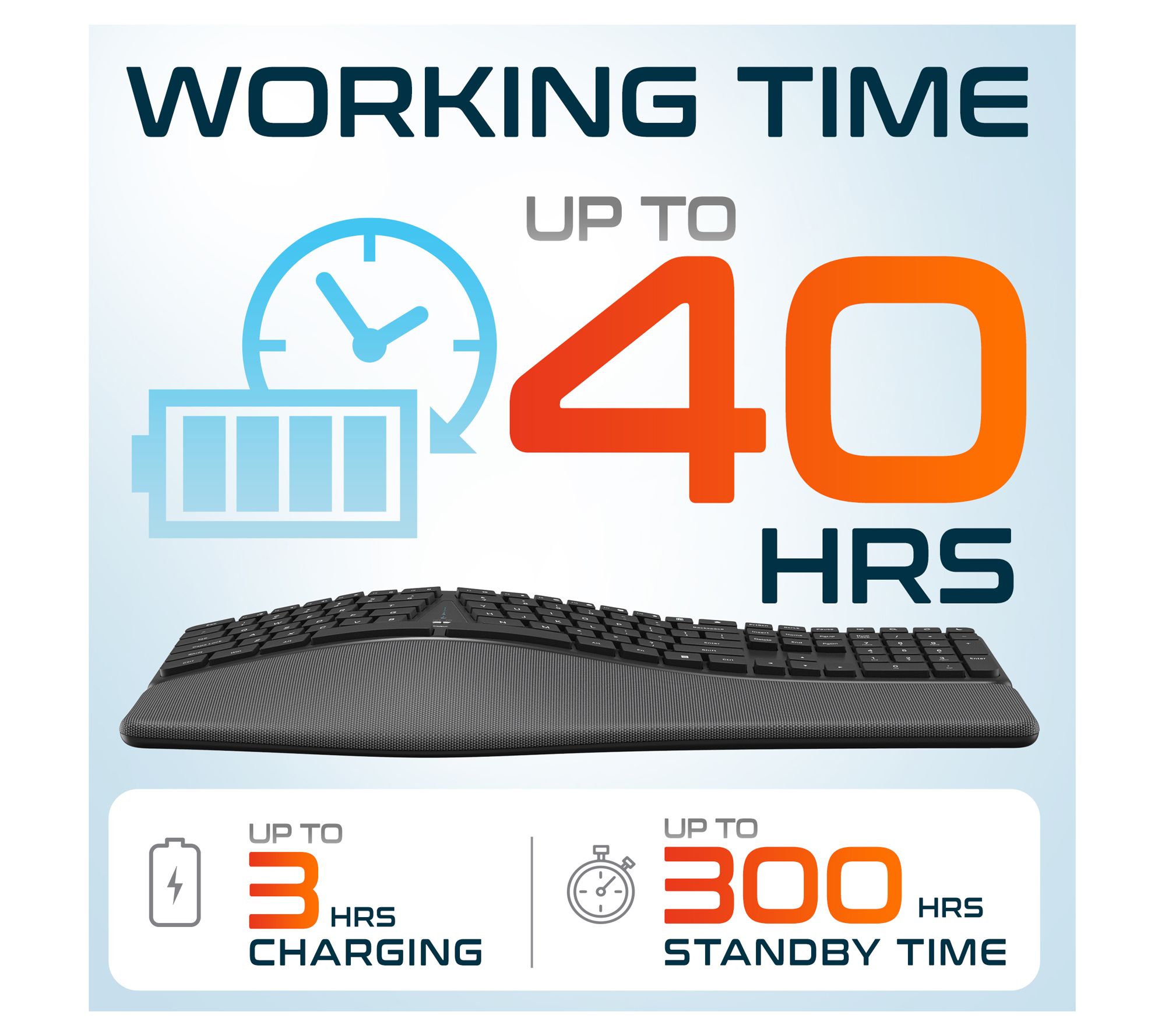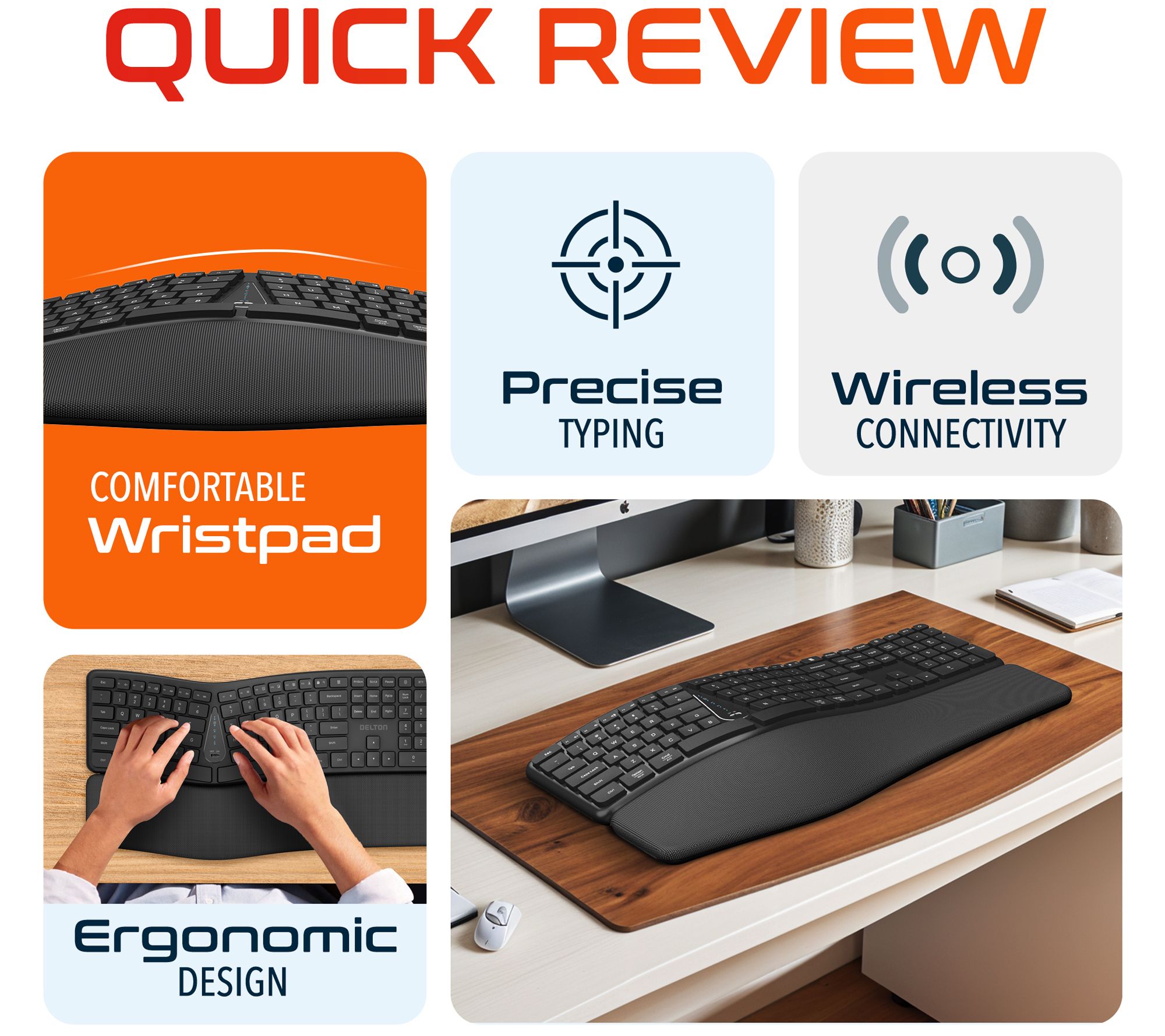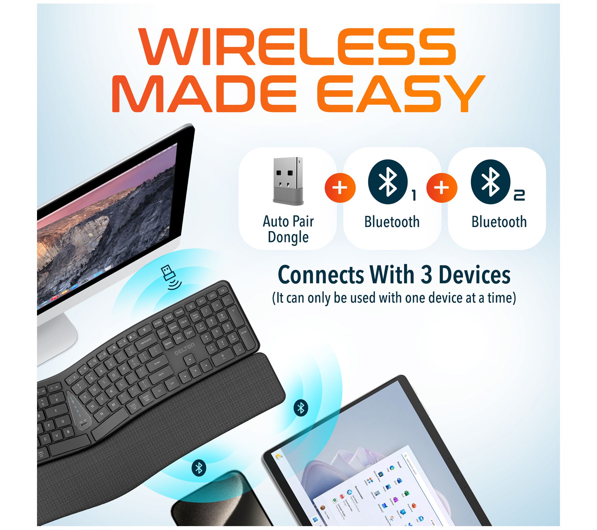 Ready to transform your workspace? The Delton KB250 Wireless Rechargeable Ergonomic Keyboard offers a comfortable typing experience with its curved design and wrist-friendly layout. Connect up to three devices simultaneously and enjoy the efficiency of quiet, noise-reducing keys. This keyboard is compatible with a wide range of devices, including Windows and Mac, making it a versatile addition to any setup. From Delton.