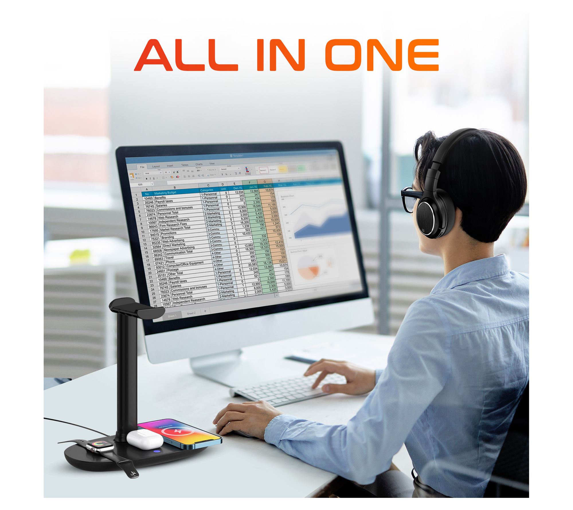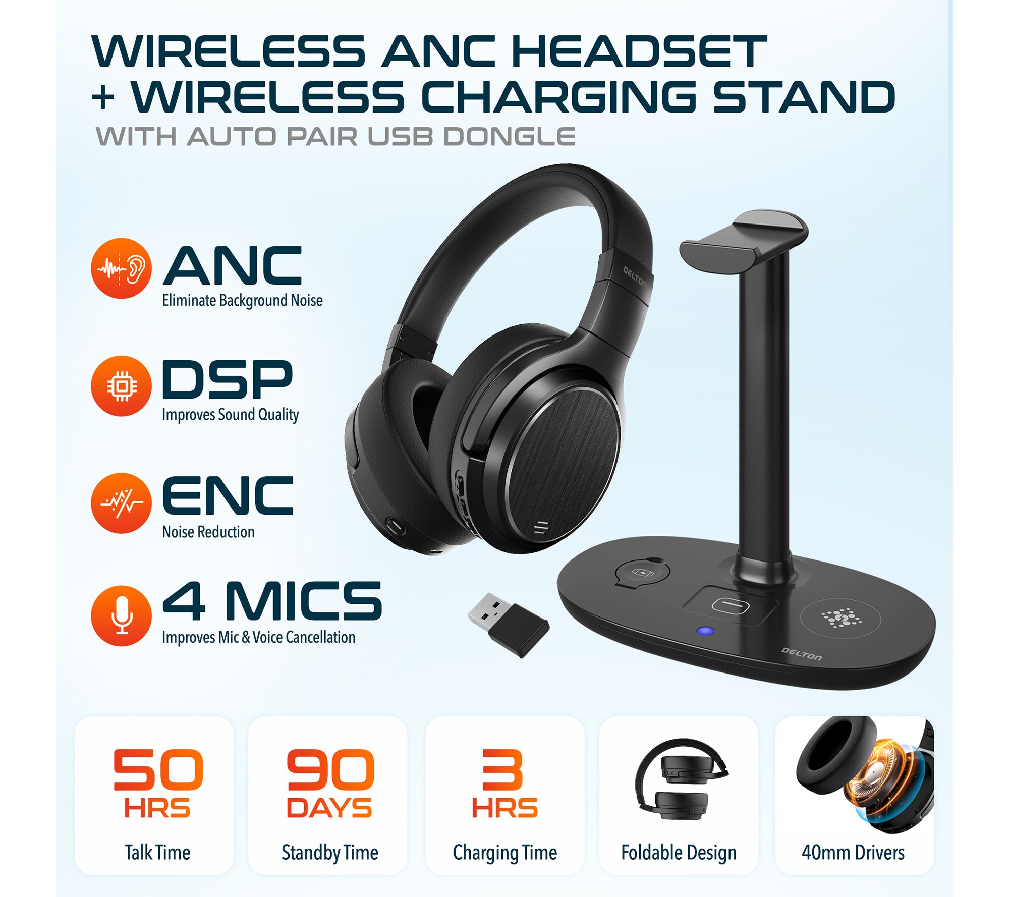 Elevate your working-from-home setup with the Delton M101 Bluetooth Computer Headset and HS1 Stand bundle. With exceptional noise-canceling capabilities and a comfortable over-the-ear design, these headphones make long conference calls a breeze. The included 3-in-1 charger ensures all your essential devices stay powered up and ready to go. From Delton.