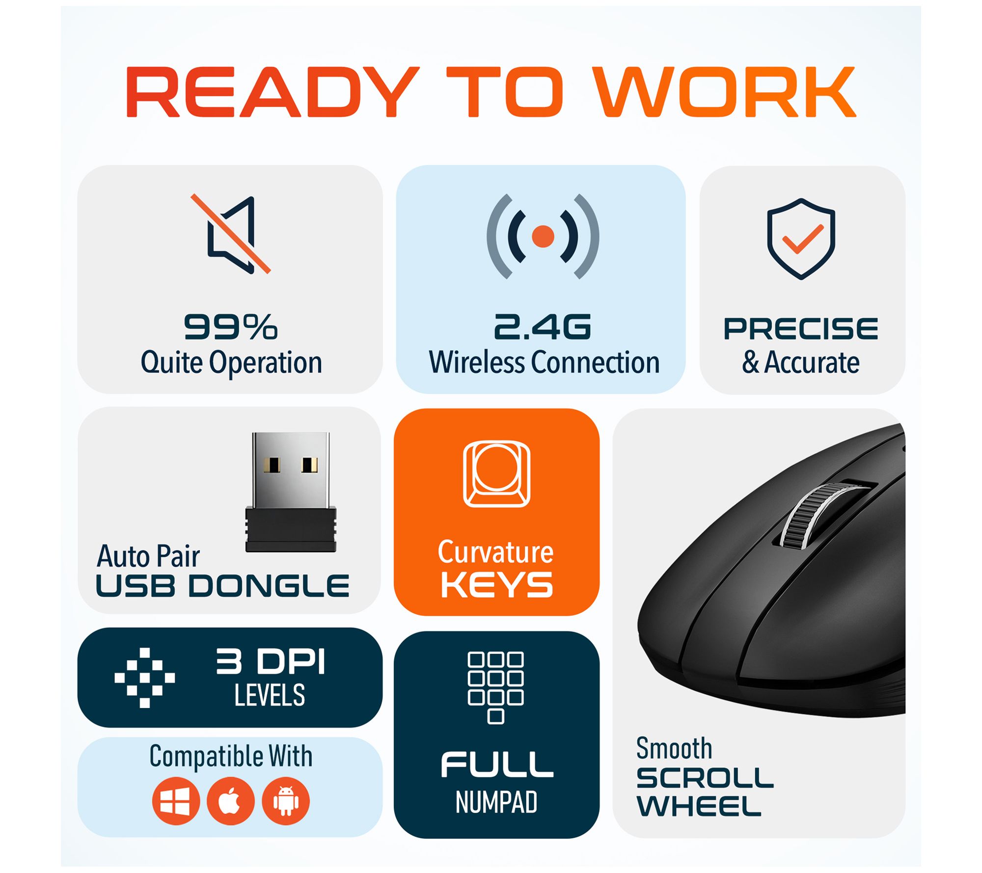 • Includes wireless mouse, keyboard, auto pair USB dongle, and user manual