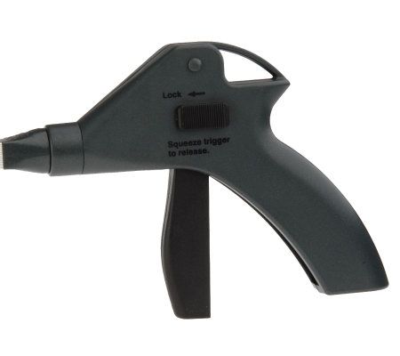 The built-in LED headlight illuminates dark areas, and the rotating head has a pull-and-turn handle for navigating tight spaces. It also features a trigger locking mechanism. Requires 2 AAA batteries, not included.