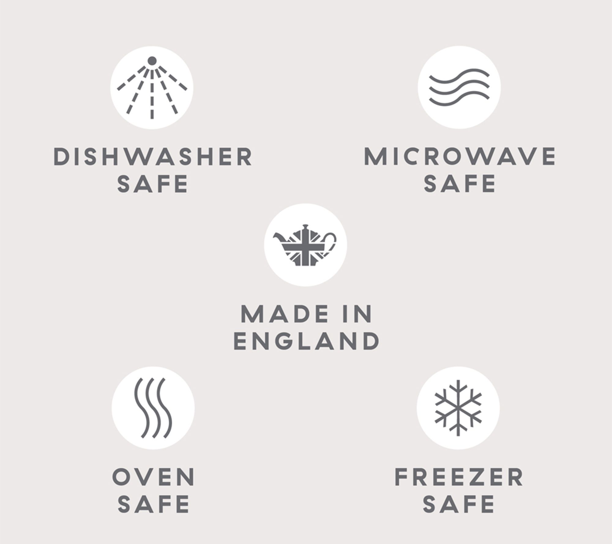 • Microwave-safe, oven-safe to 450F; freezer-safe; dishwasher-safe