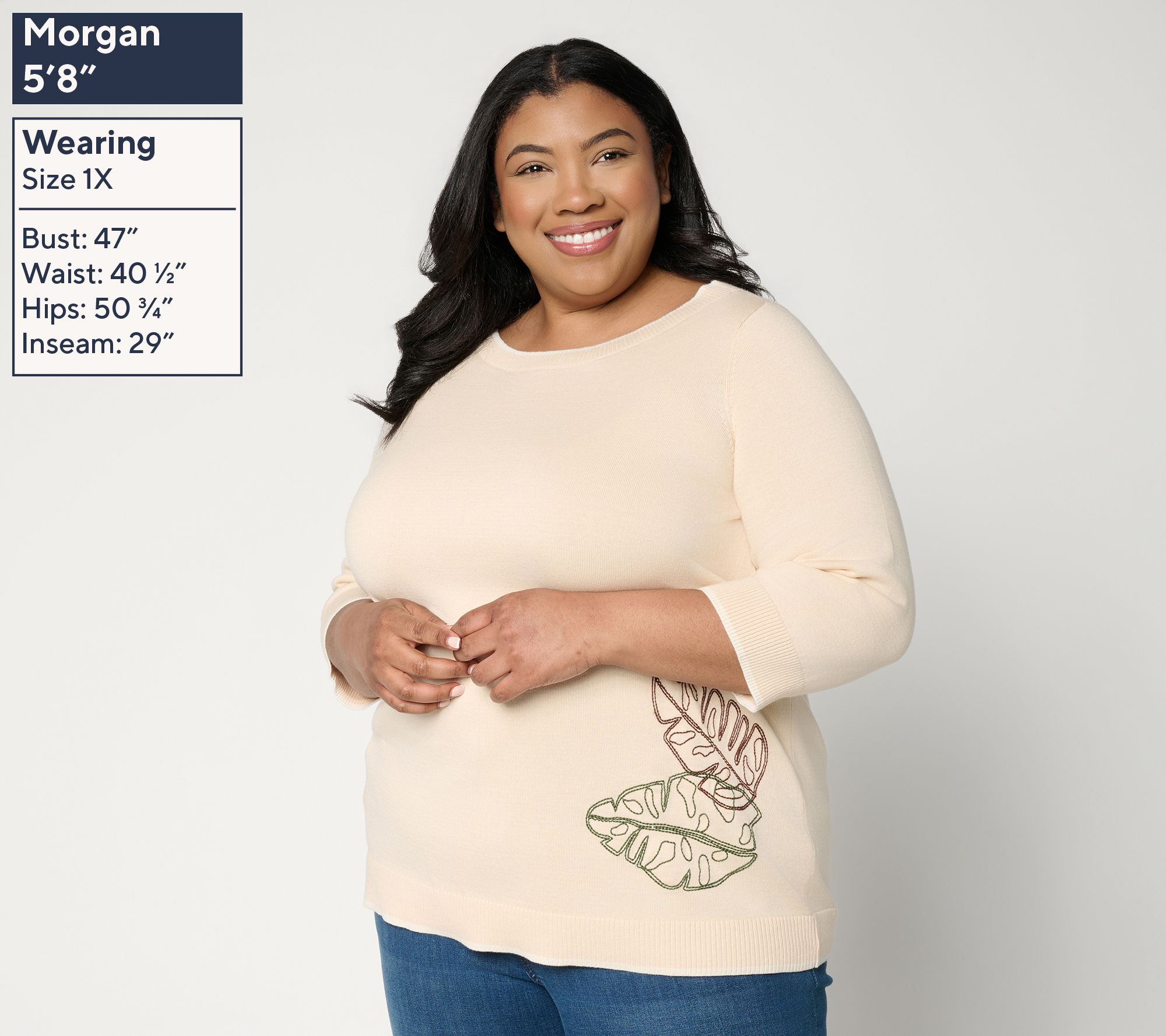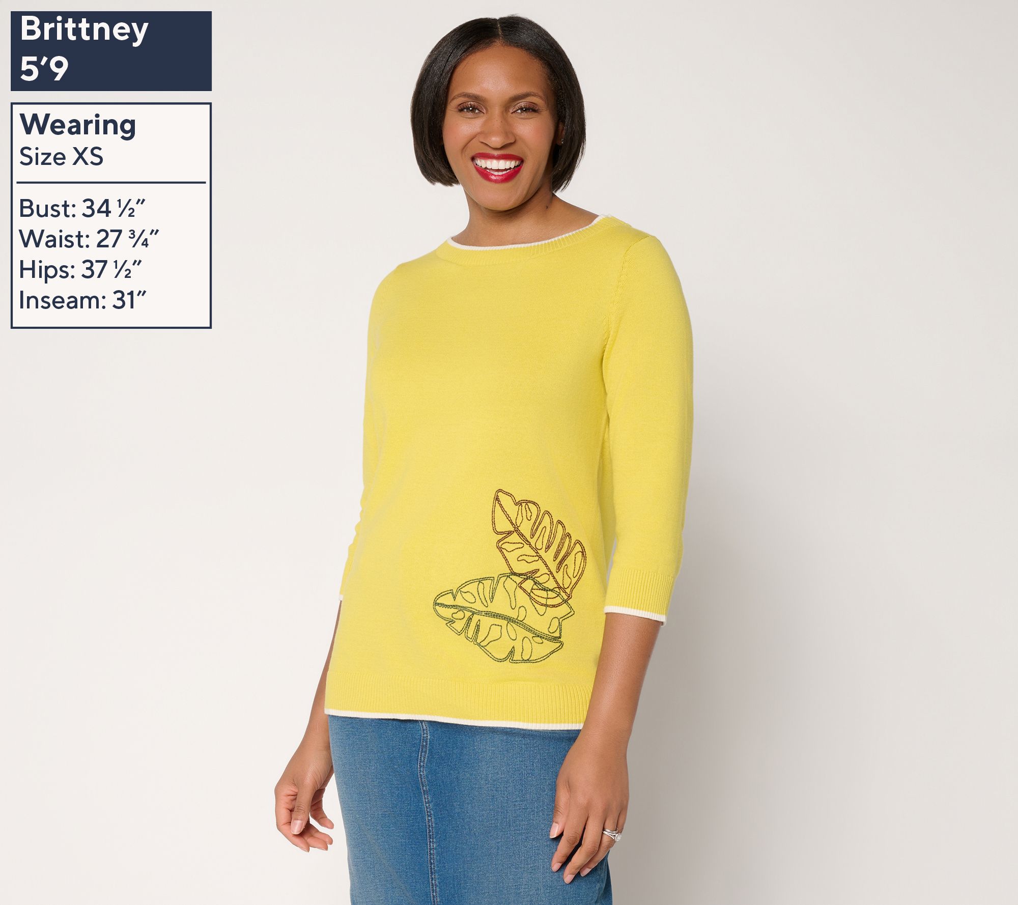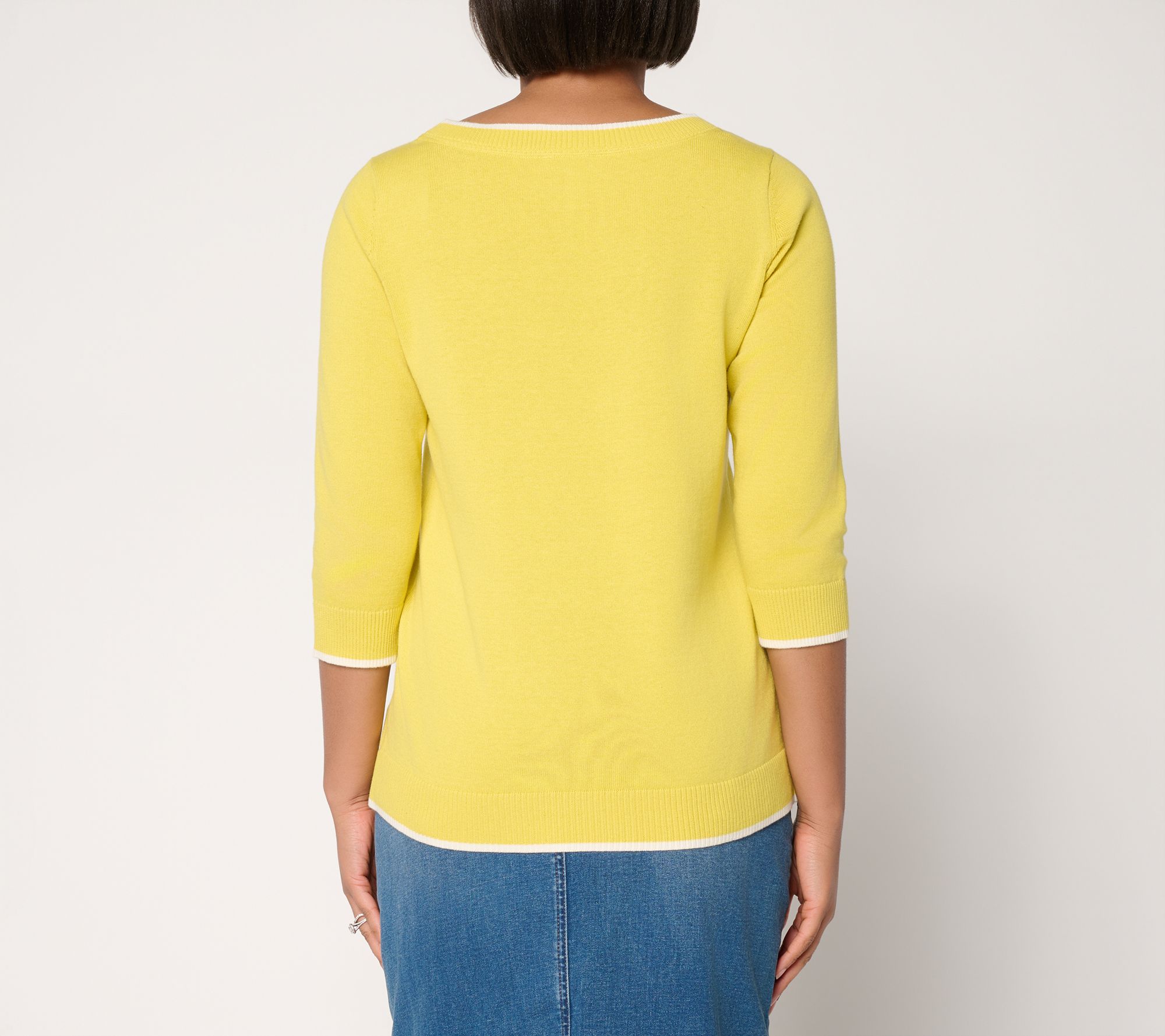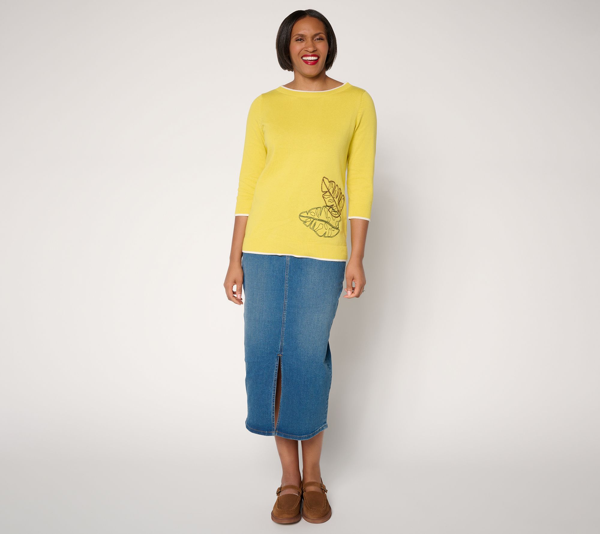 Weekend plans or casual Fridays get a playful upgrade with this cotton sweater -- head-turning contrast tipping and an embroidered front motif add a fun twist to your favorite jeans or skirts. The ribbed boat neckline and 3/4-length sleeves bring just enough detail to make everyday moments memorable. From Denim & Co.® Fashions.
