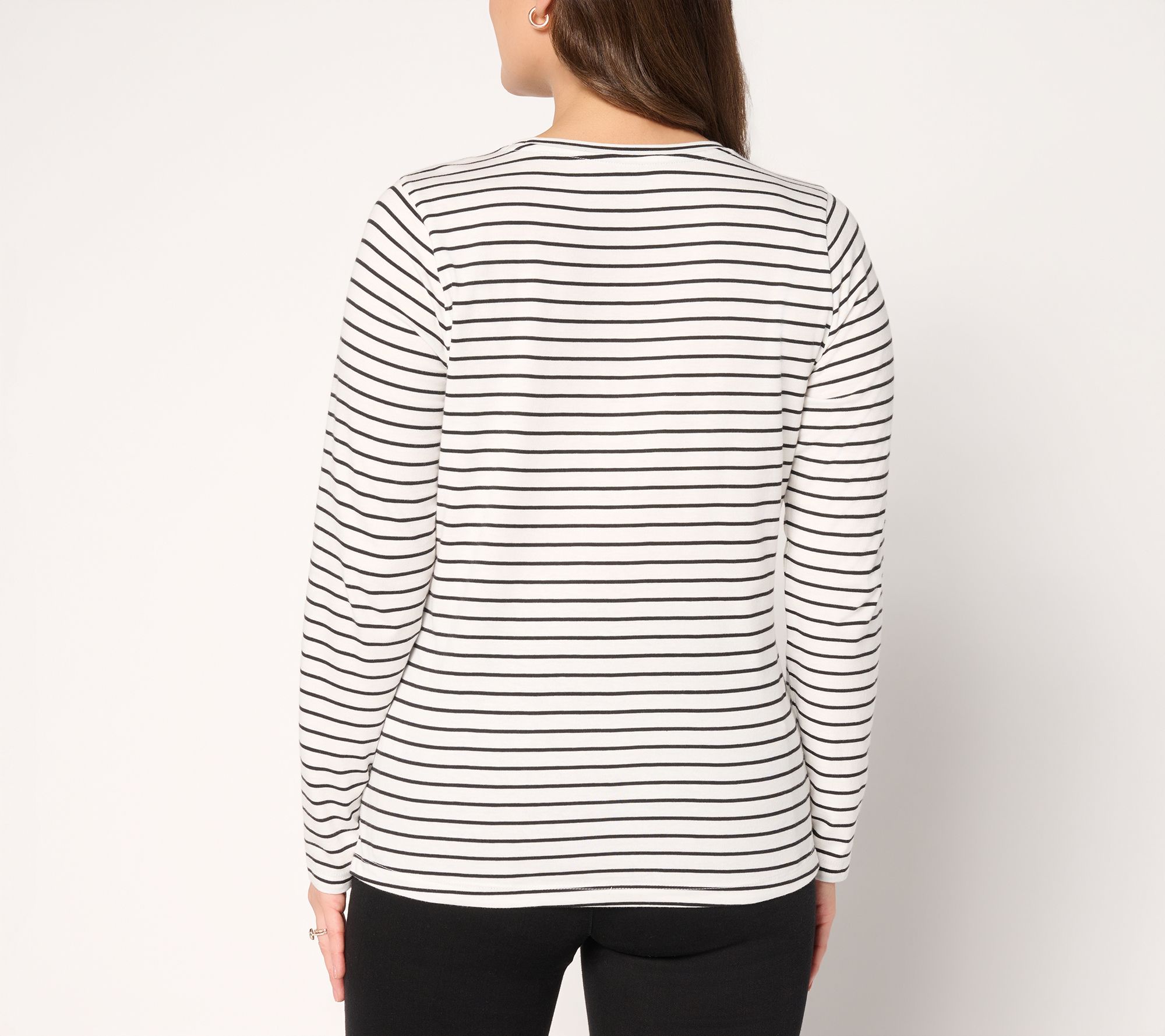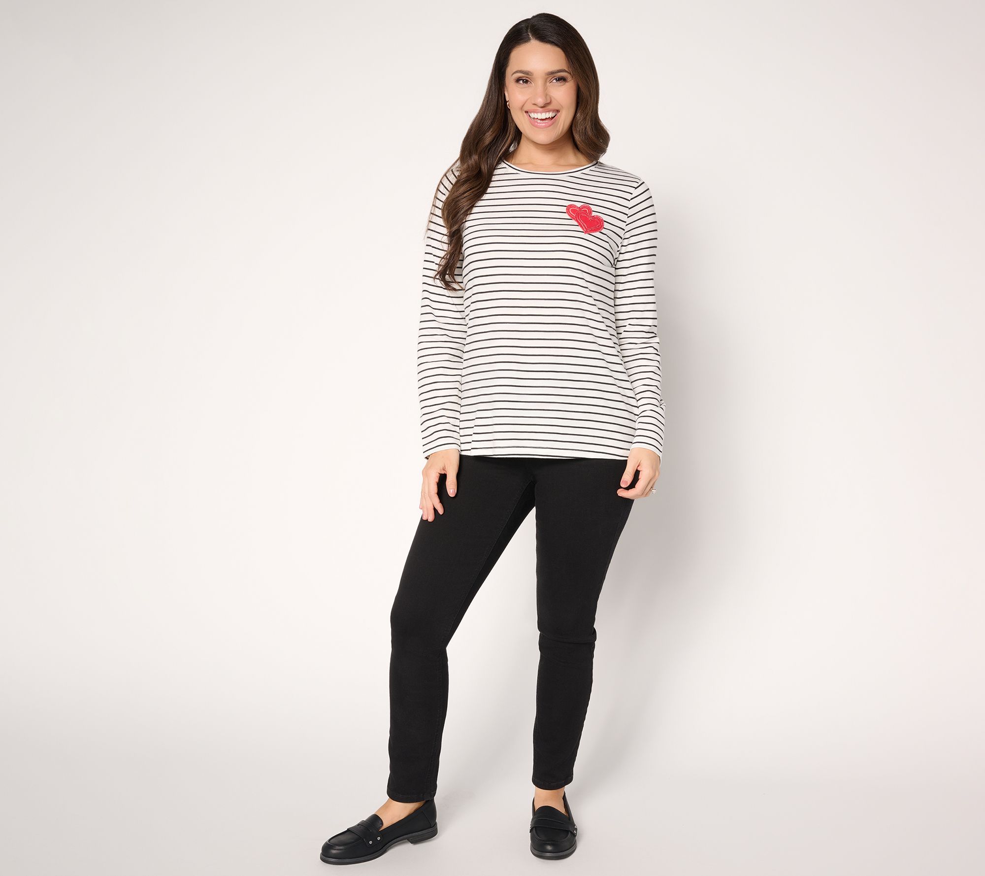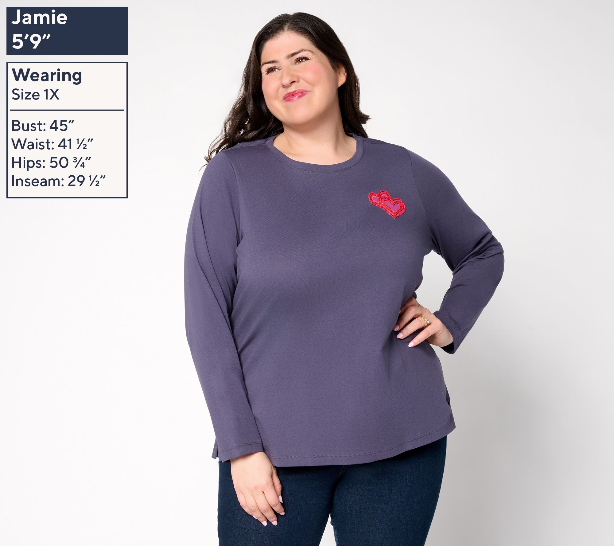 Easy mornings start with this embellished cotton top -- designed to bring a little extra charm to casual days, whether you're meeting friends for brunch or handling errands around town. Long sleeves and a crew neckline enhance the comfortable style, while the double-heart motif pairs beautifully with your favorite jeans or leggings. From Denim & Co.® Fashions.