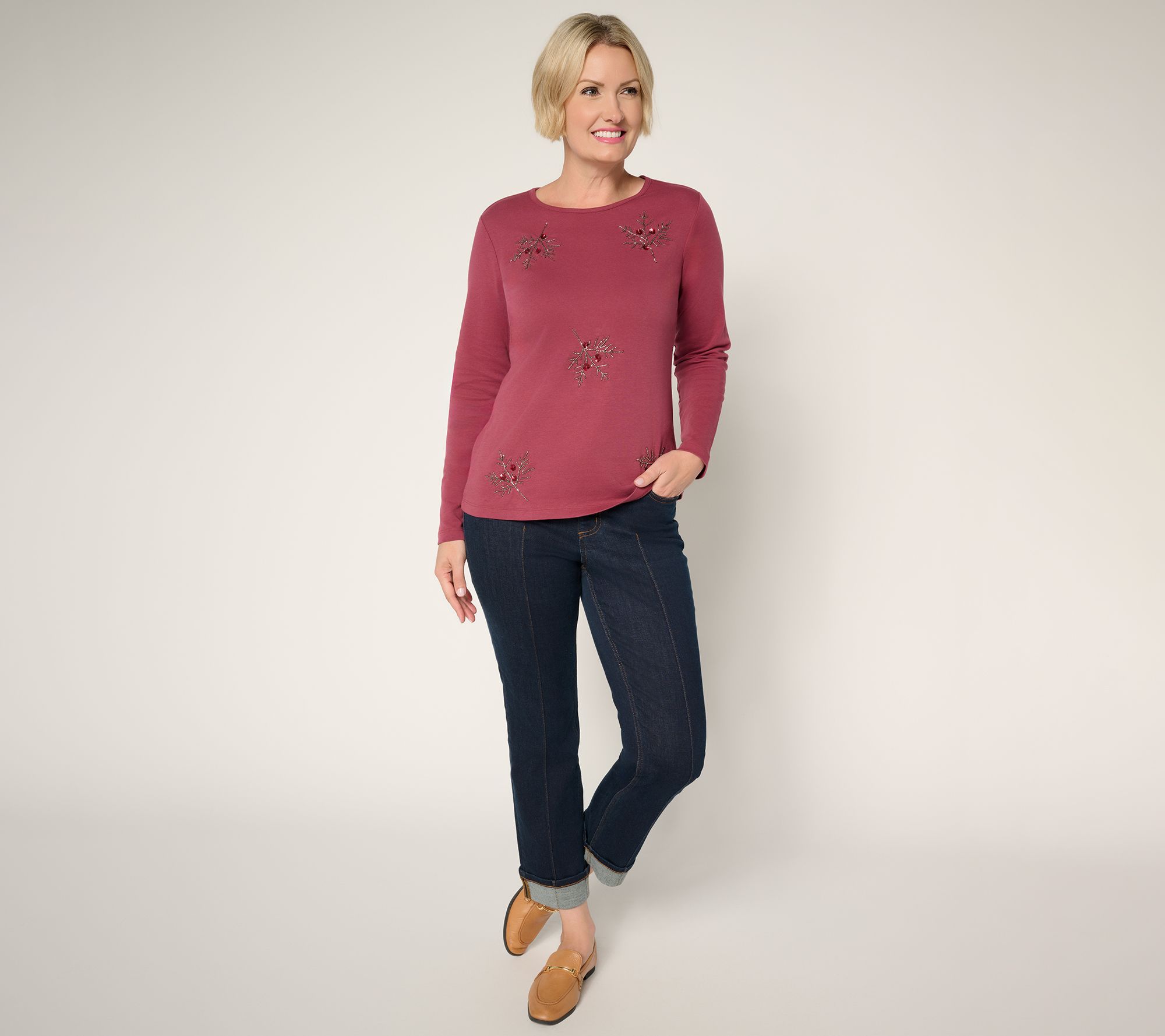 Along for weekend errands or weekday outings, this embroidered knit top amps up the charm with its leaf motif and easygoing style. Soft jersey in 100% cotton (yay!) creates a look that's just as comfortable layered over jeans as it is with your favorite skirt for lunch with friends. From Denim & Co.® Fashions.