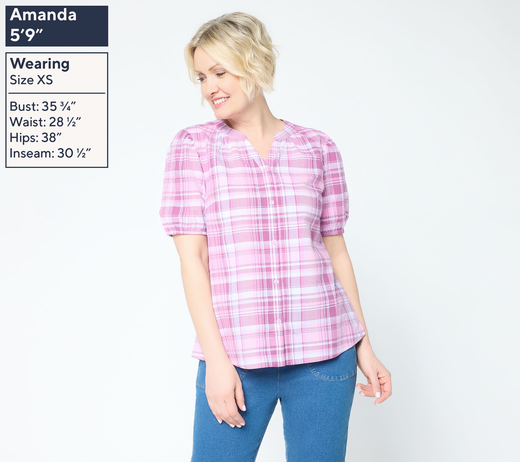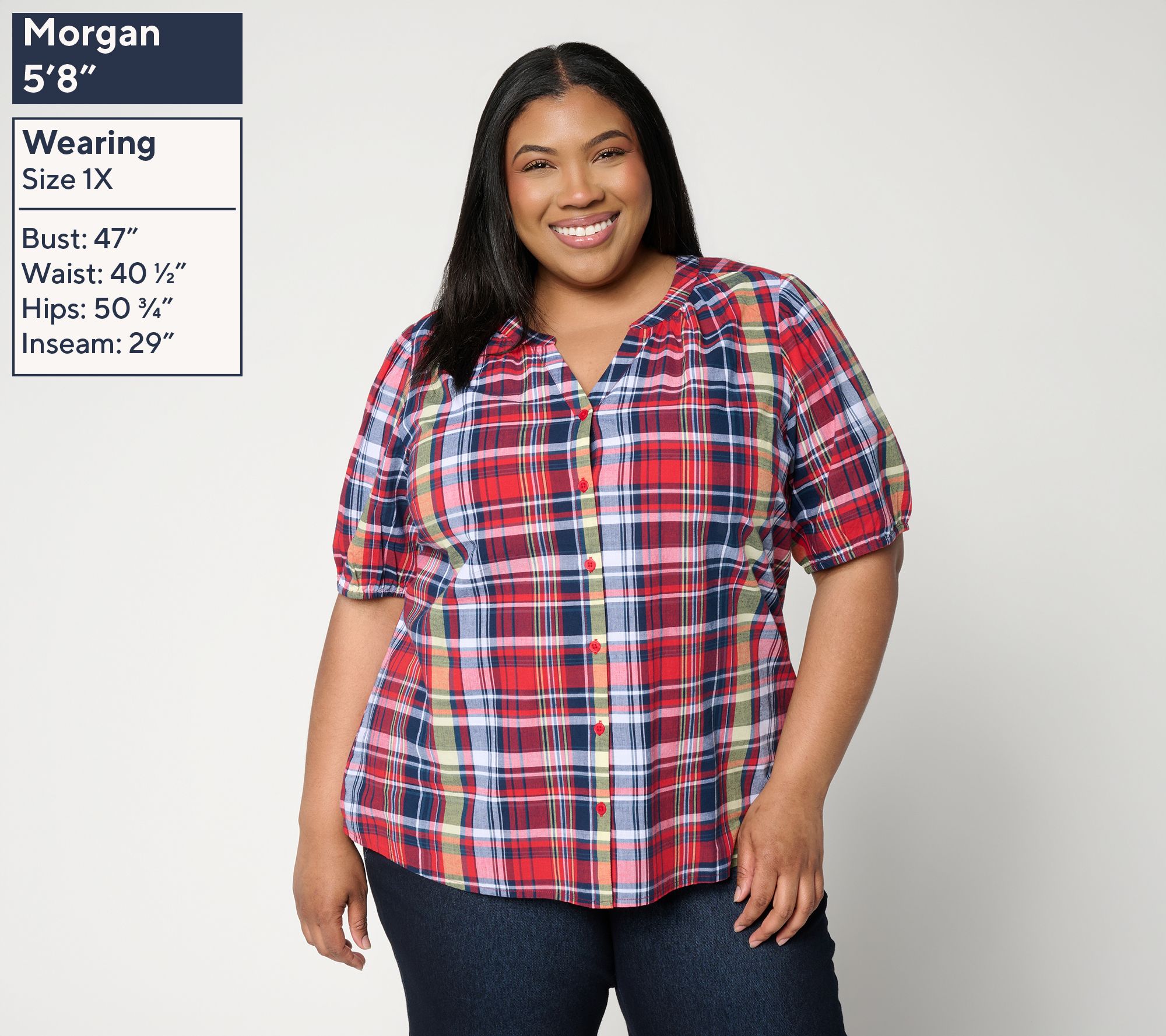 • Features: madras plaid, button-front closure, split V-neckline, shirred elbow-length sleeves, elastic cuffs, front bust darts, shirttail hem, side slits