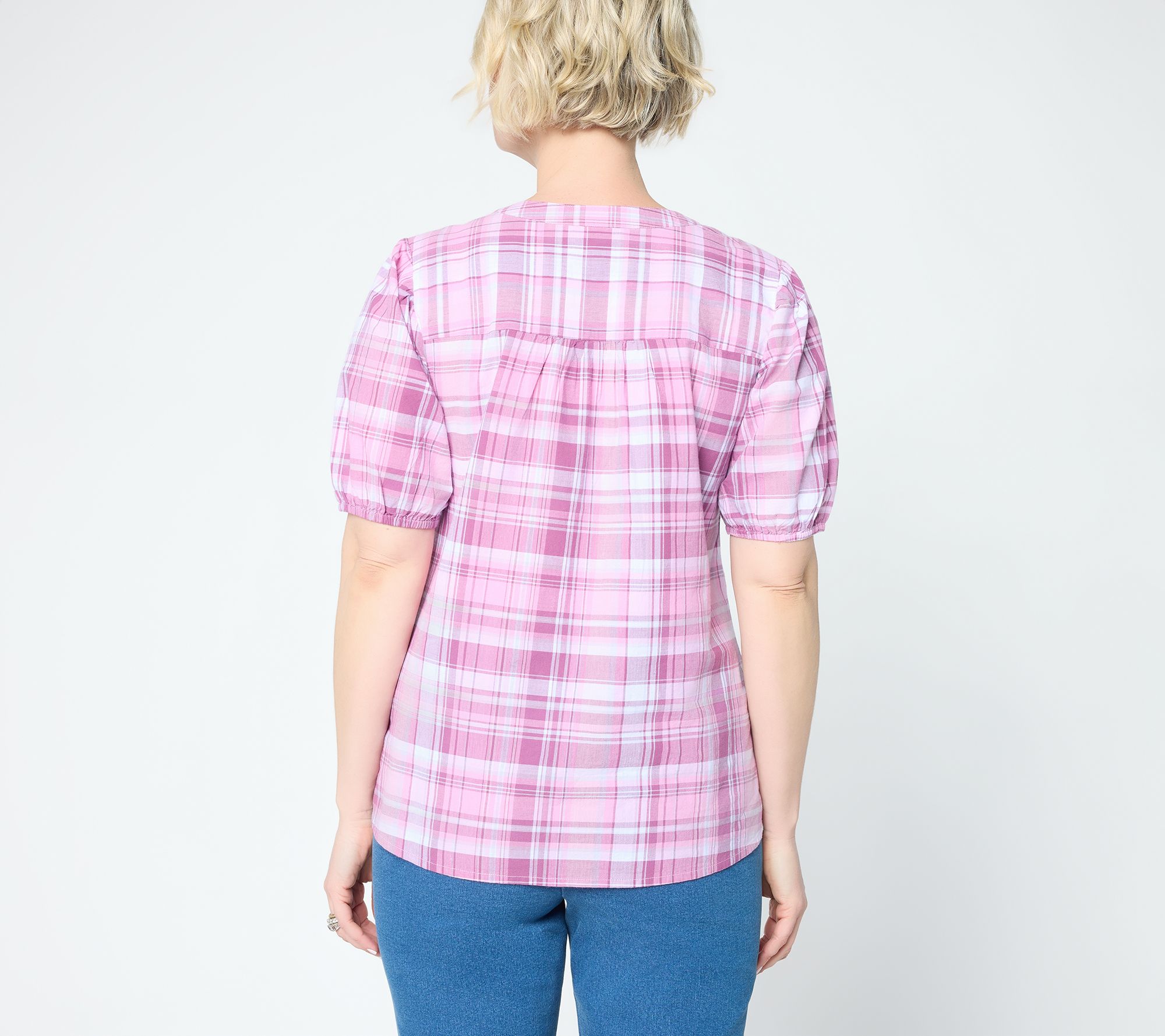 What's making us happy? Madras plaid -- and the soft all-cotton construction of this button-front top! Let its preppy feminine style sweeten your sunny weekdays and social Saturdays. From Denim & Co.® Fashions.