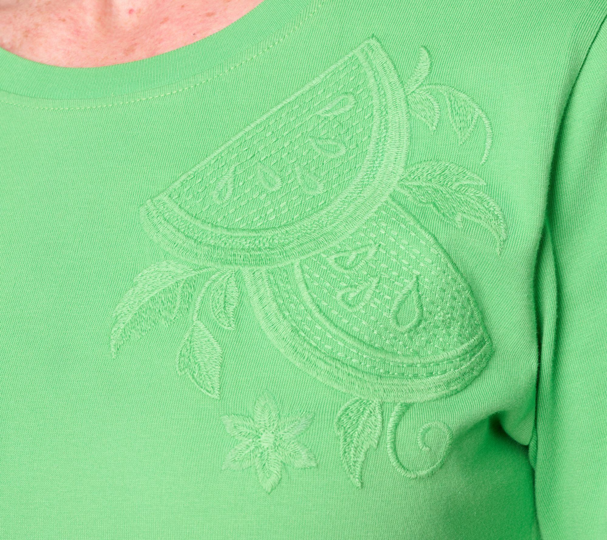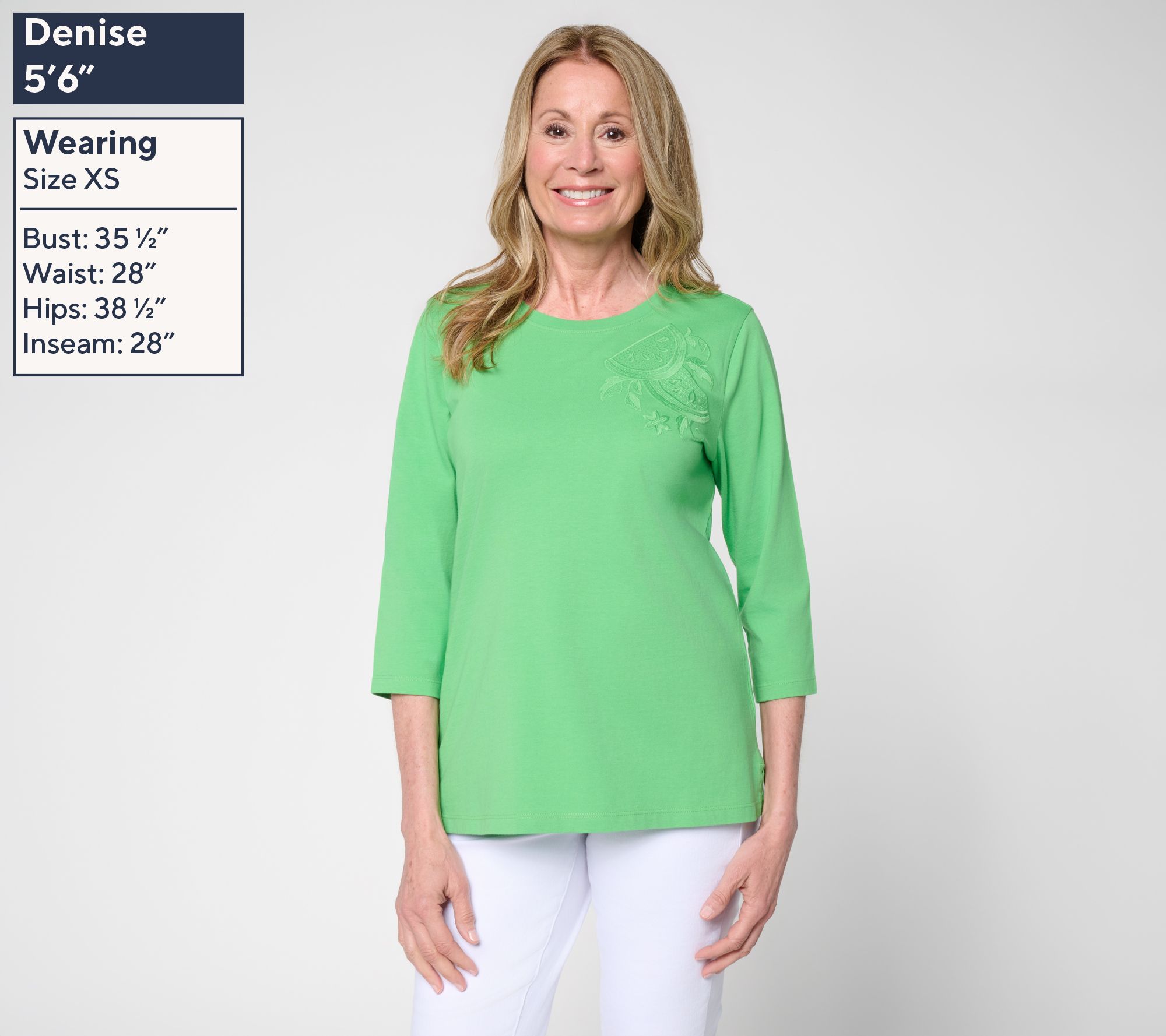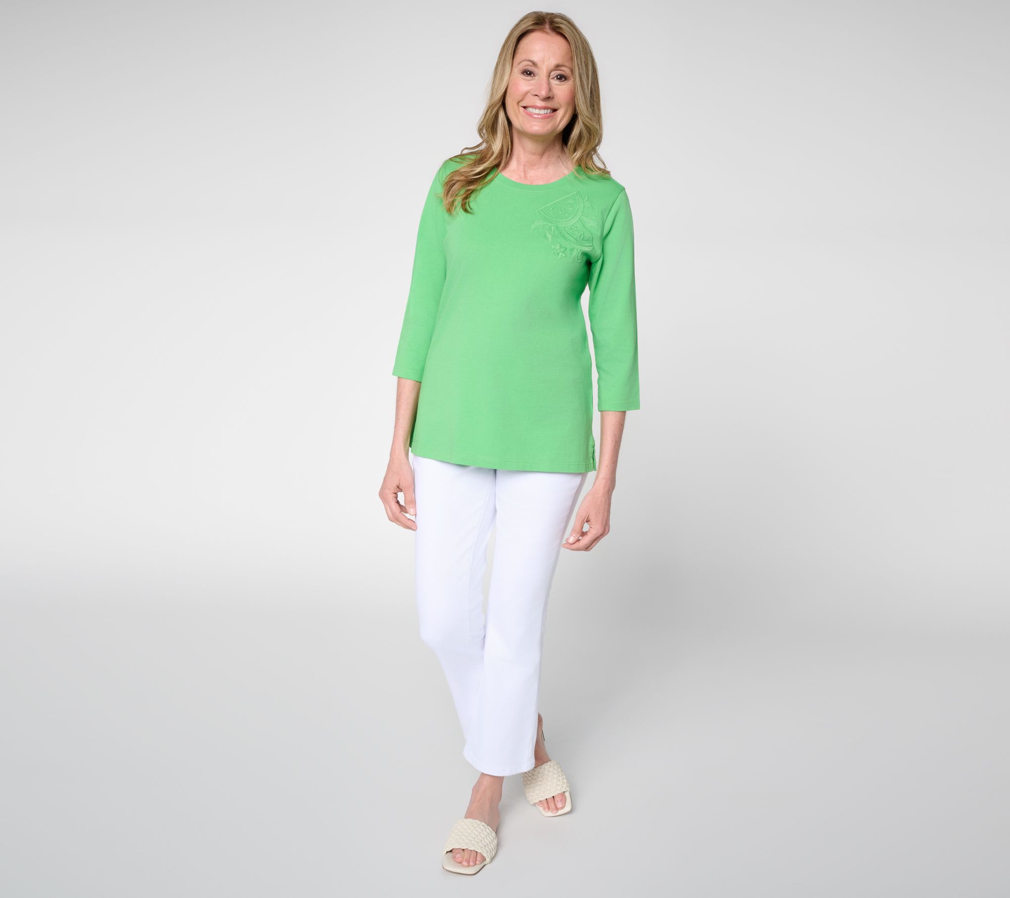Essentials want to feel to elevated, too! A fresh take on casual comfort, this 3/4-length sleeve cotton top brings together a playful embroidered motif and soft knit that works for busy weekdays or relaxed weekends. Finished with a fruit-themed embellishment, it's the perfect top for soloing all spring and summer long, or layer it with your favorite jacket or cardi as an easy outfit staple. From Denim & Co.® Fashions.