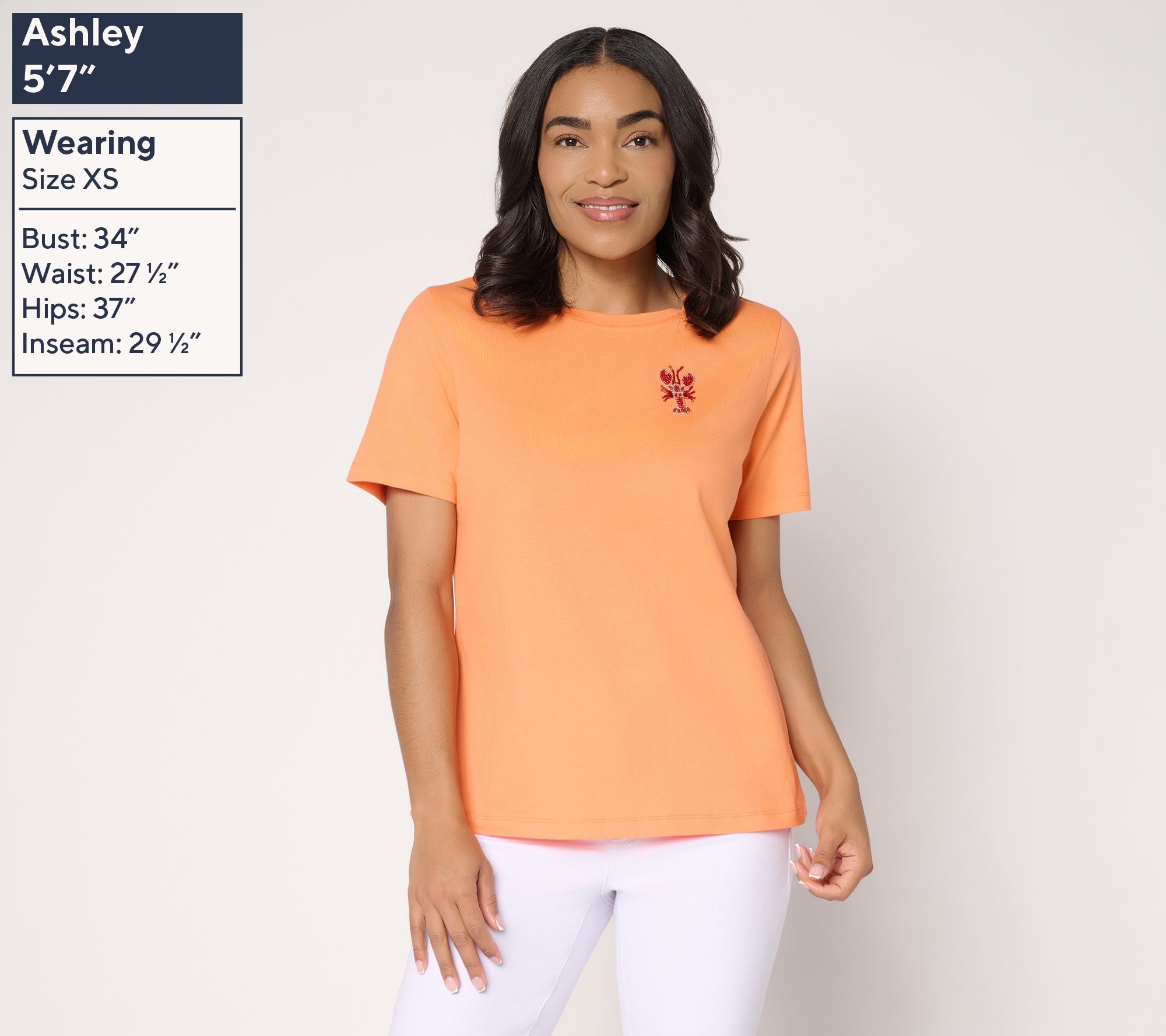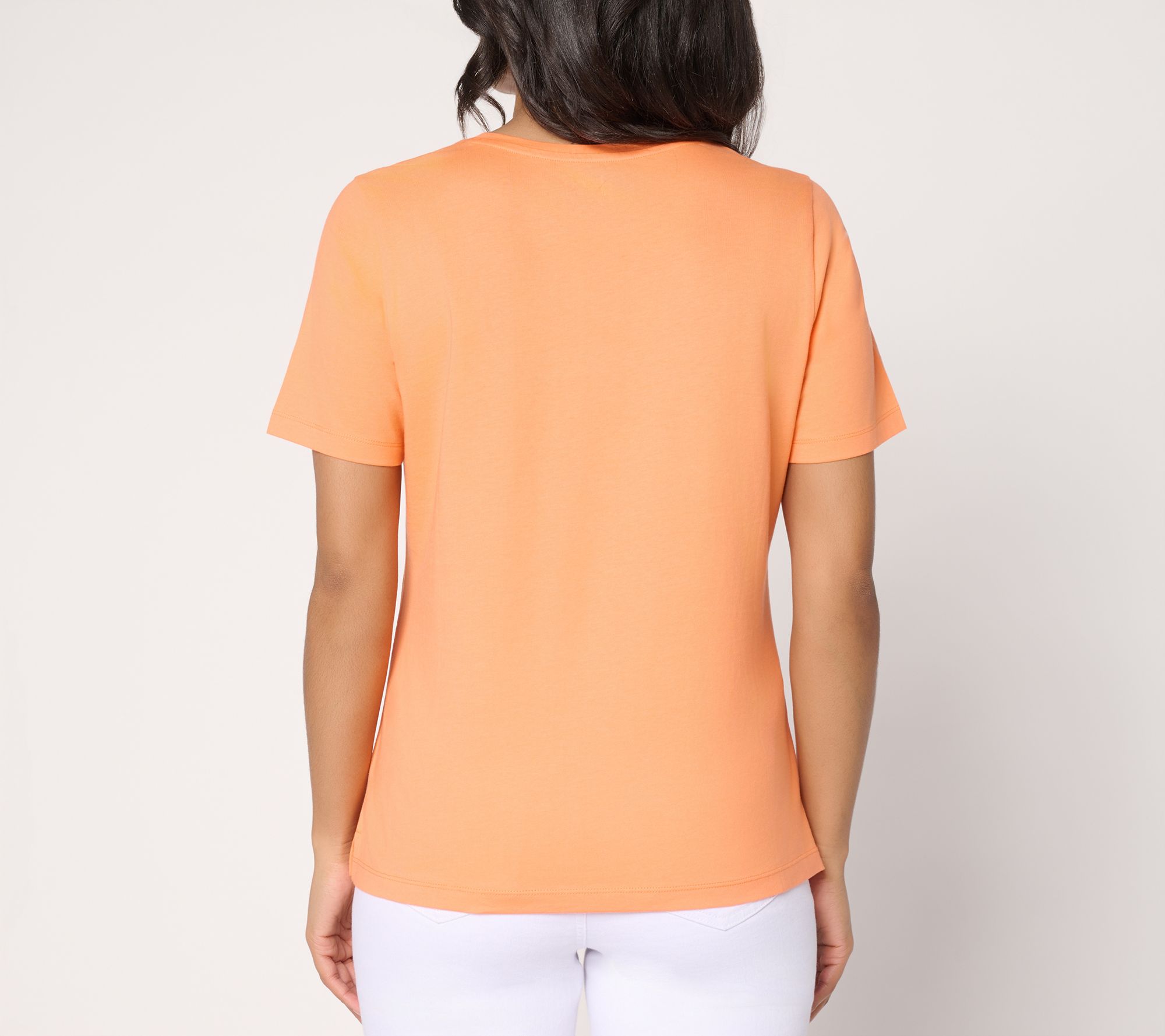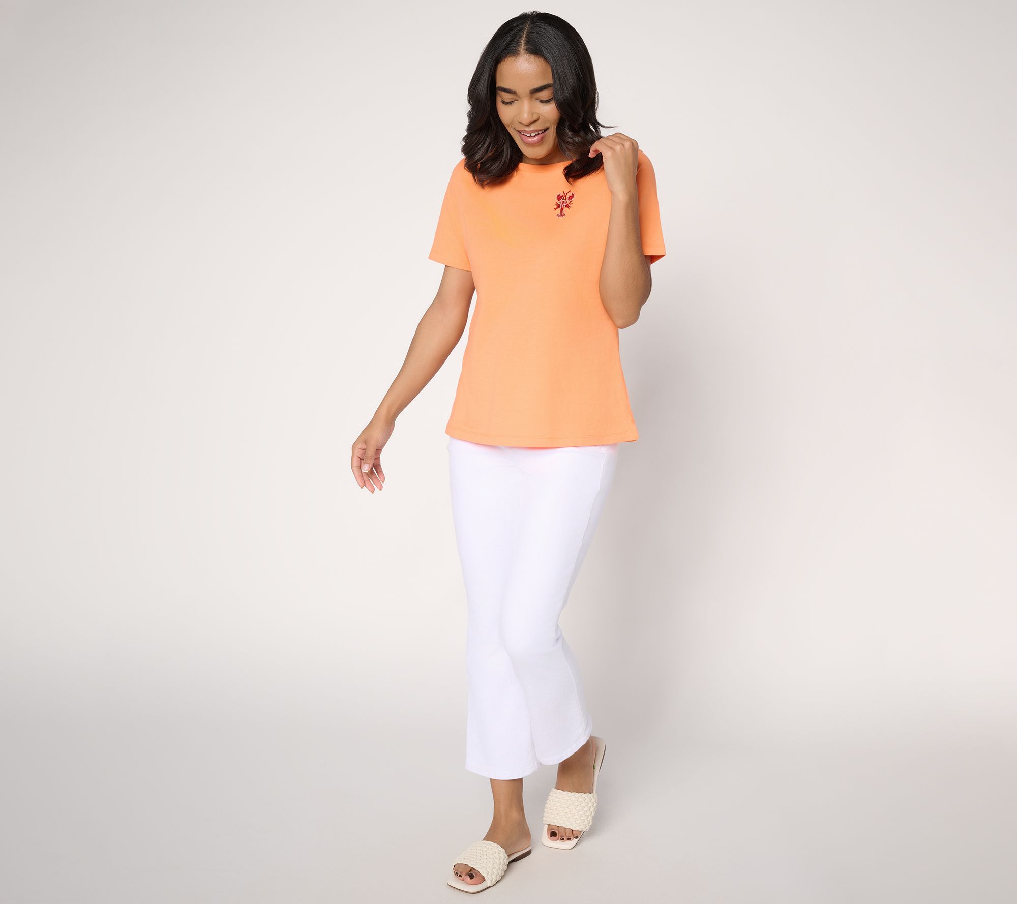 Whether you're tackling your to-do list or taking it easy, this cotton tee brings casual chic to your everyday routine. A touch of embroidery and beaded detail adds an easy pop of personality, making it a standout option for layering or wearing solo with your favorite jeans or shorts. From Denim & Co.® Fashions.