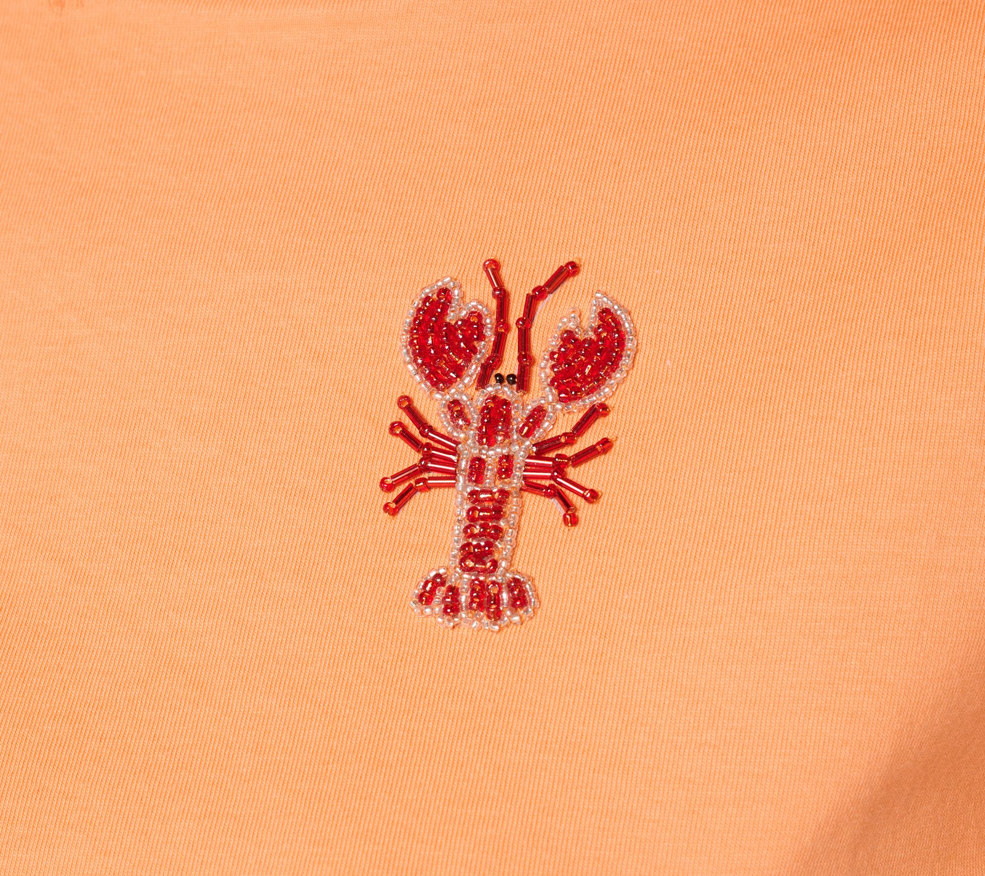 Features: crew neckline with self-folded neck band, short sleeves, straight bottom hemline with side slits, beaded motif at wearer's left chest