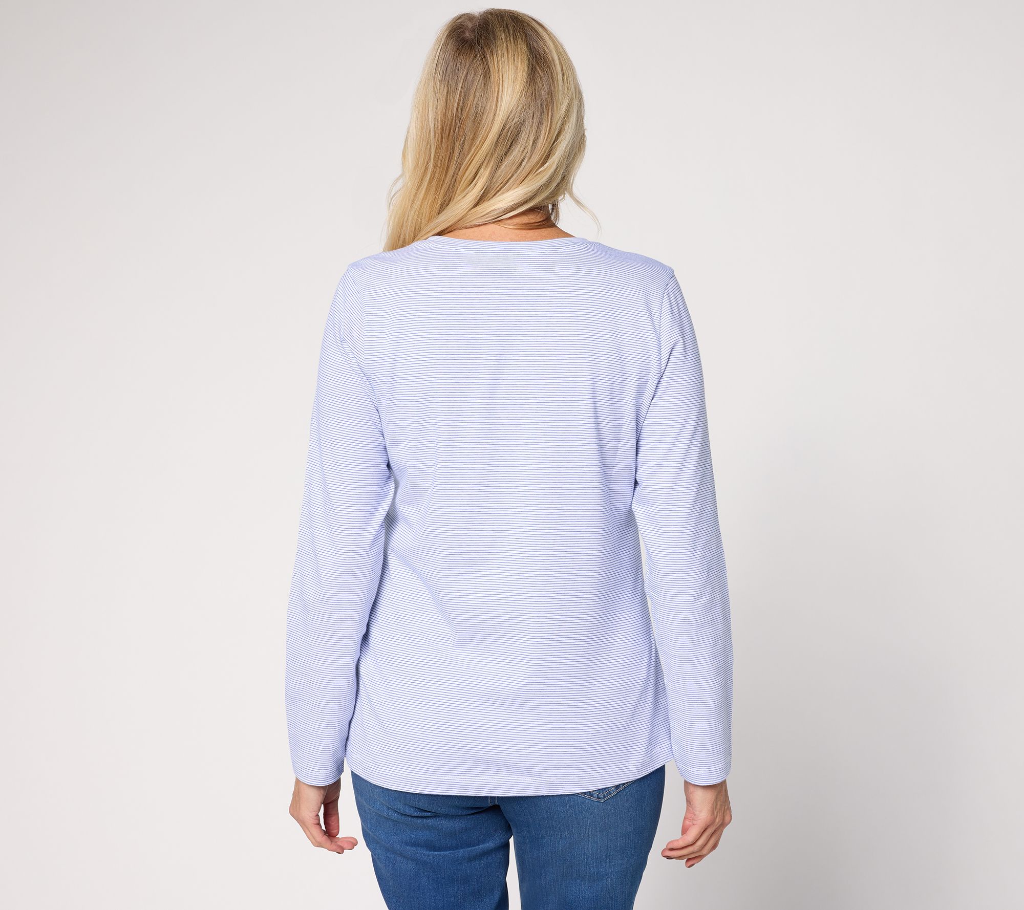 Whether you're meeting friends or enjoying a cozy day at home, this cotton knit top keeps you comfortable and seasonally stylish. With a classic crew neckline, long sleeves, and a choice of stripe or solid with a snowflake motif, it adds cheer and charm to your winter wardrobe. From Denim & Co.® Fashions.