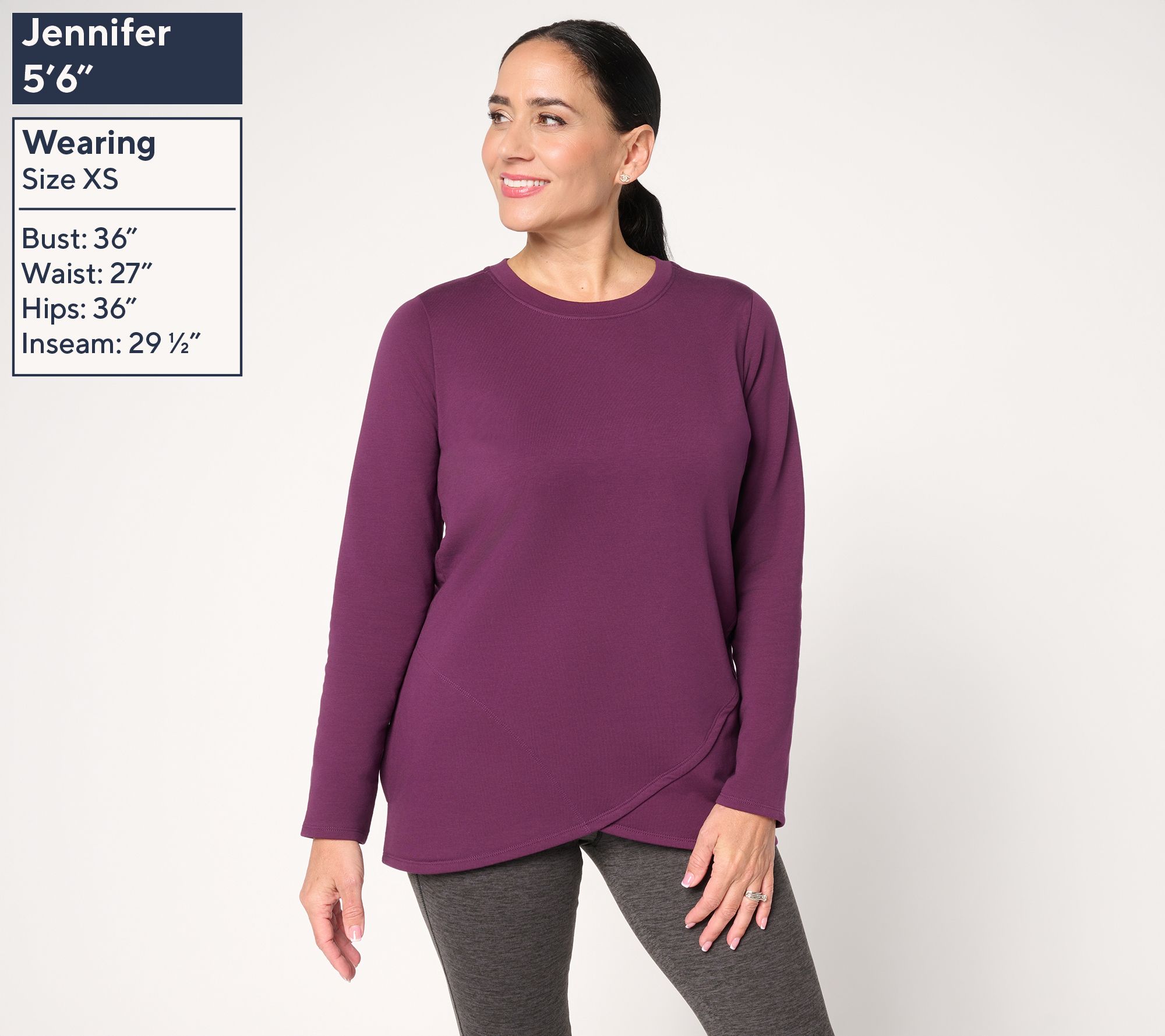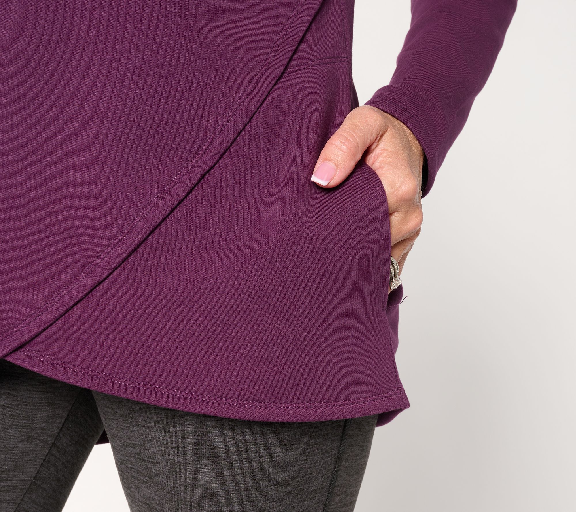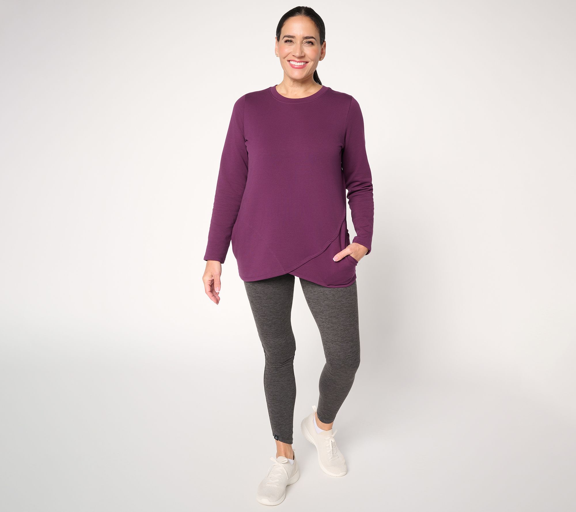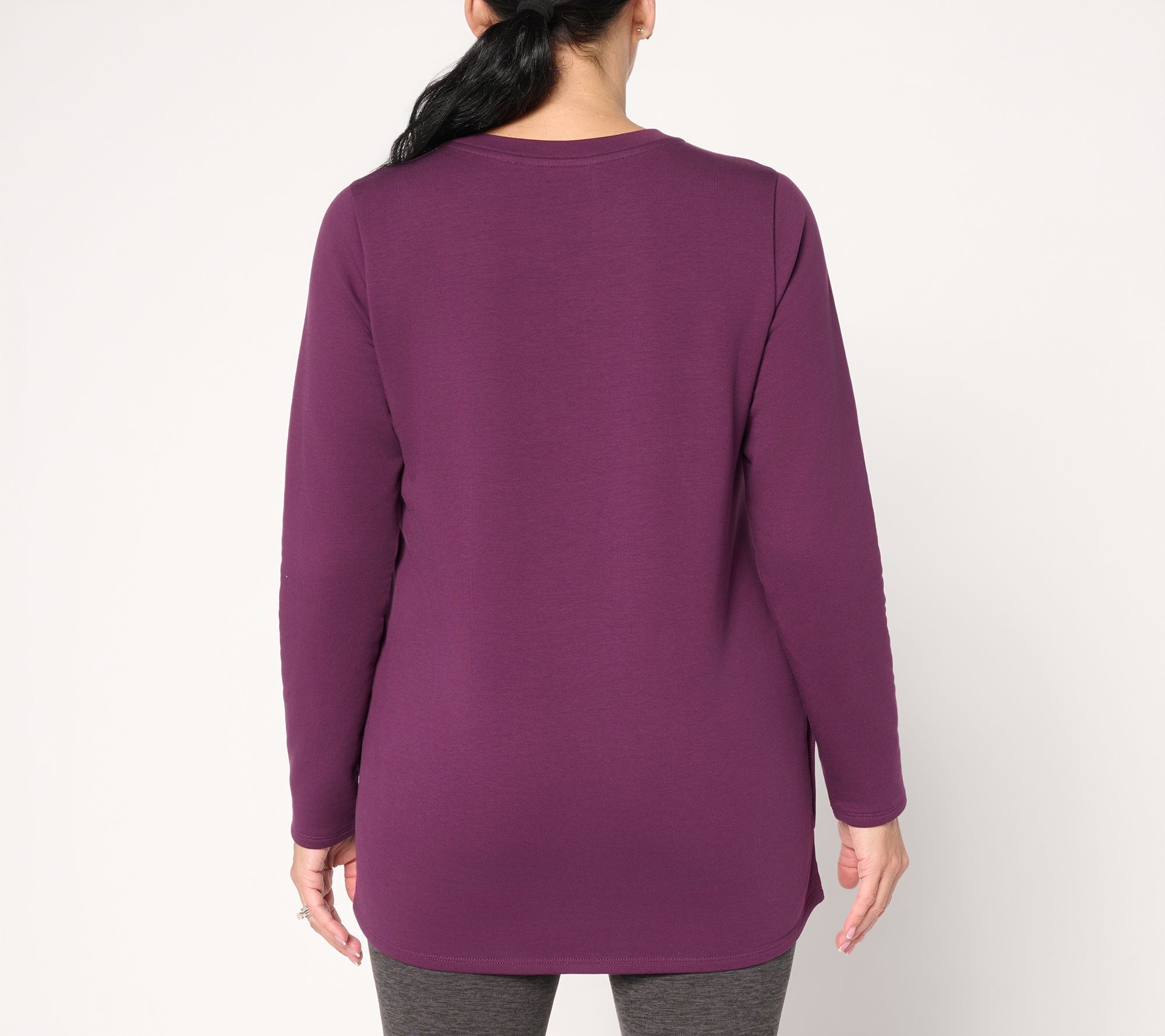 Morning walks, afternoon errands, or relaxed evenings at home -- this French terry top is ready for all your plans with a soft brushed-back feel. A modern tulip hemline keeps the vibe fresh, while on-seam pockets hold your earbuds or power snacks. From Denim & Co.® Fashions.