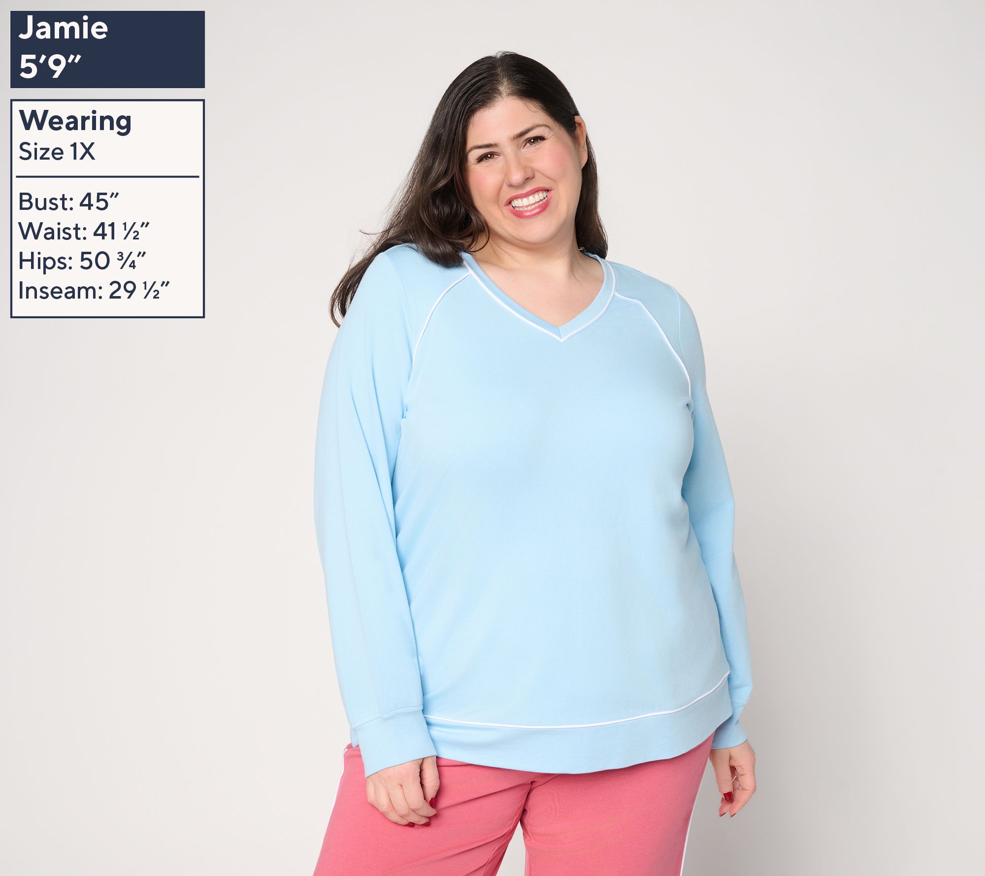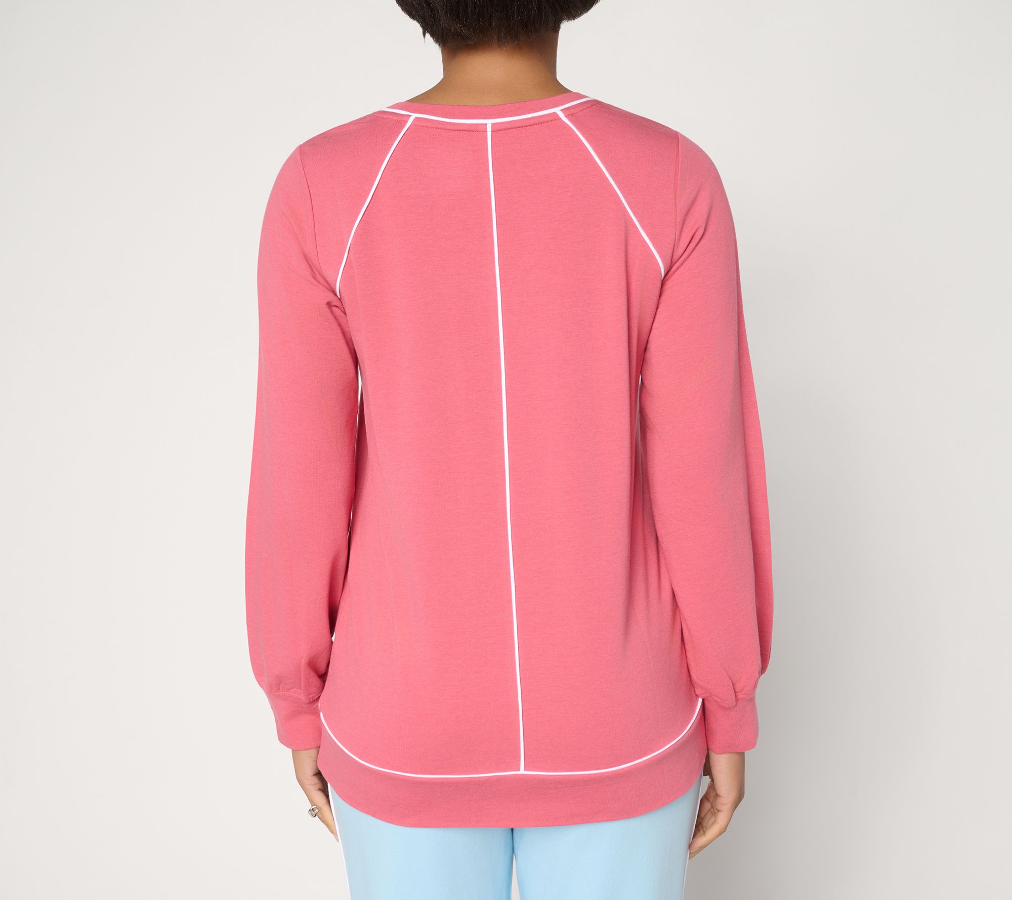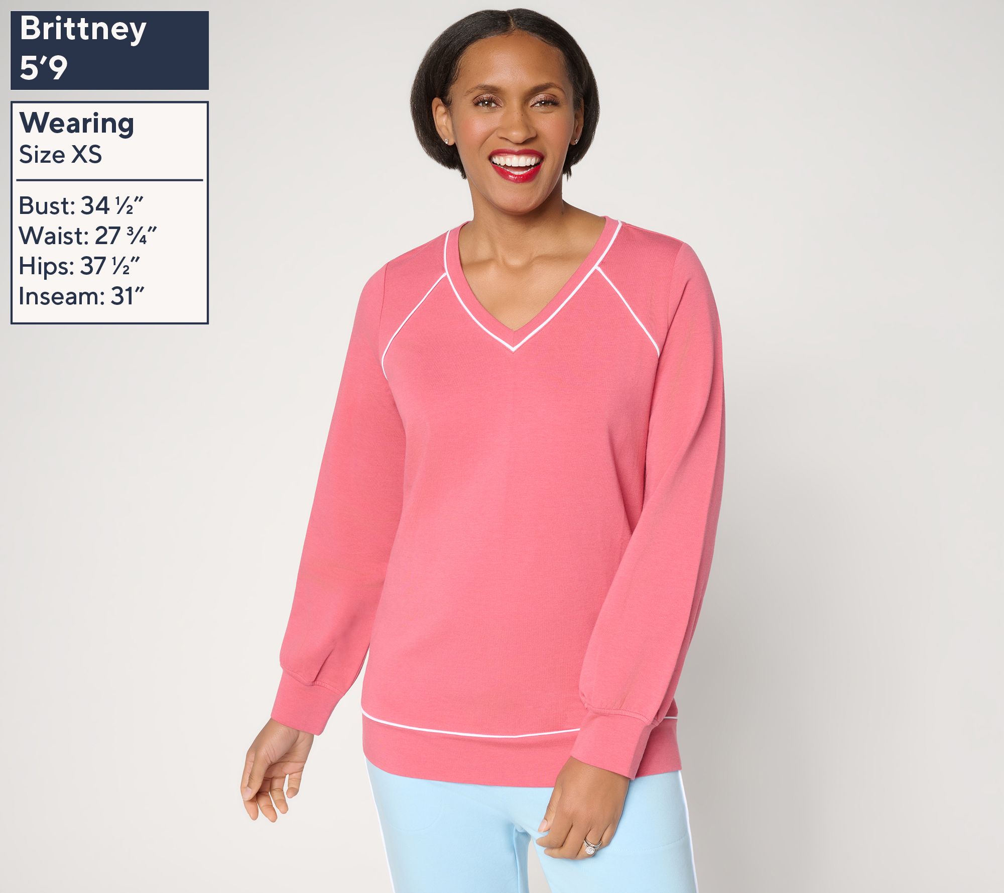 Slip into your weekend plans or casual days out with this French terry top, featuring a V-neckline and sporty contrast piping along the seams. Long sleeves with folded cuffs offer a relaxed finish you'll love for running errands or layering on a chilly day, all styled in a soft, stretchy knit. From Denim & Co.® Fashions.