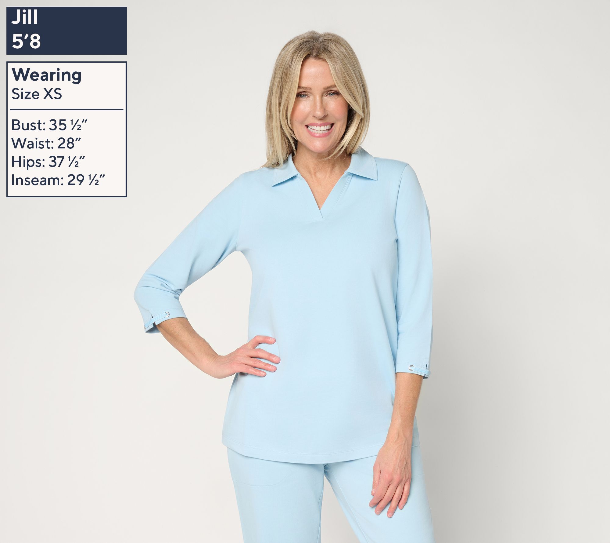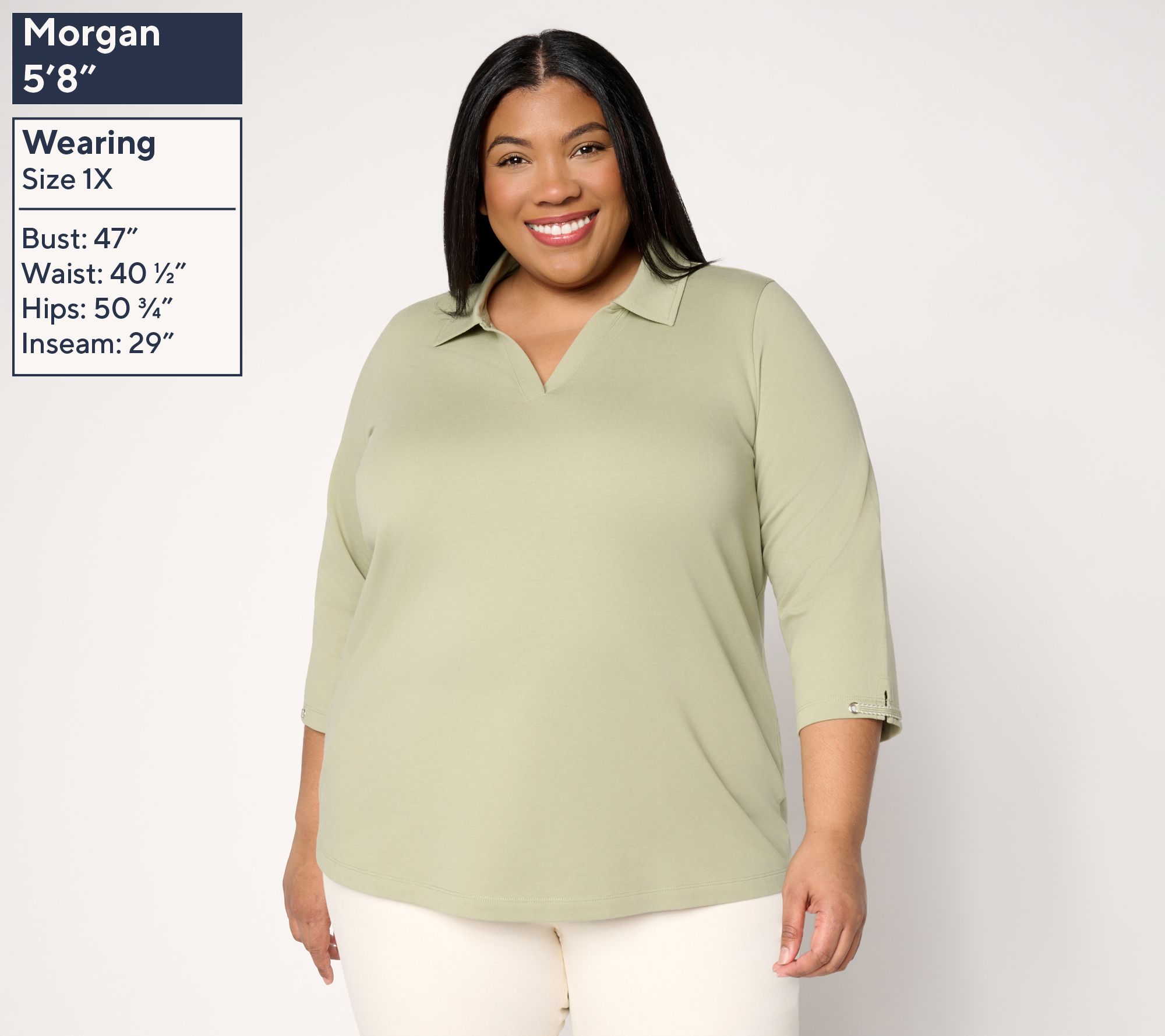 Features: foldover collar with V-neckline, 3/4-length sleeves with trim detail, curved bottom hemline
