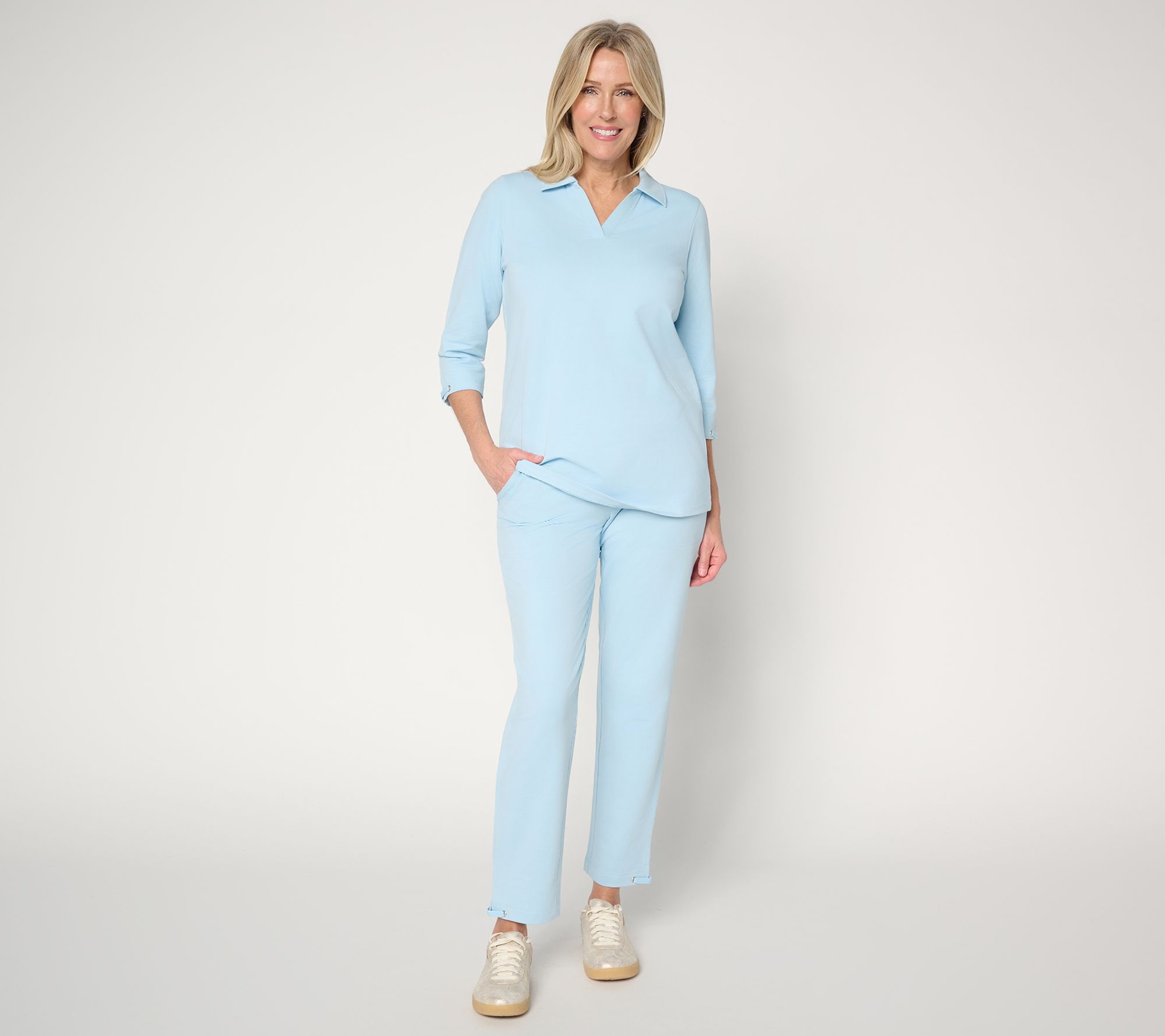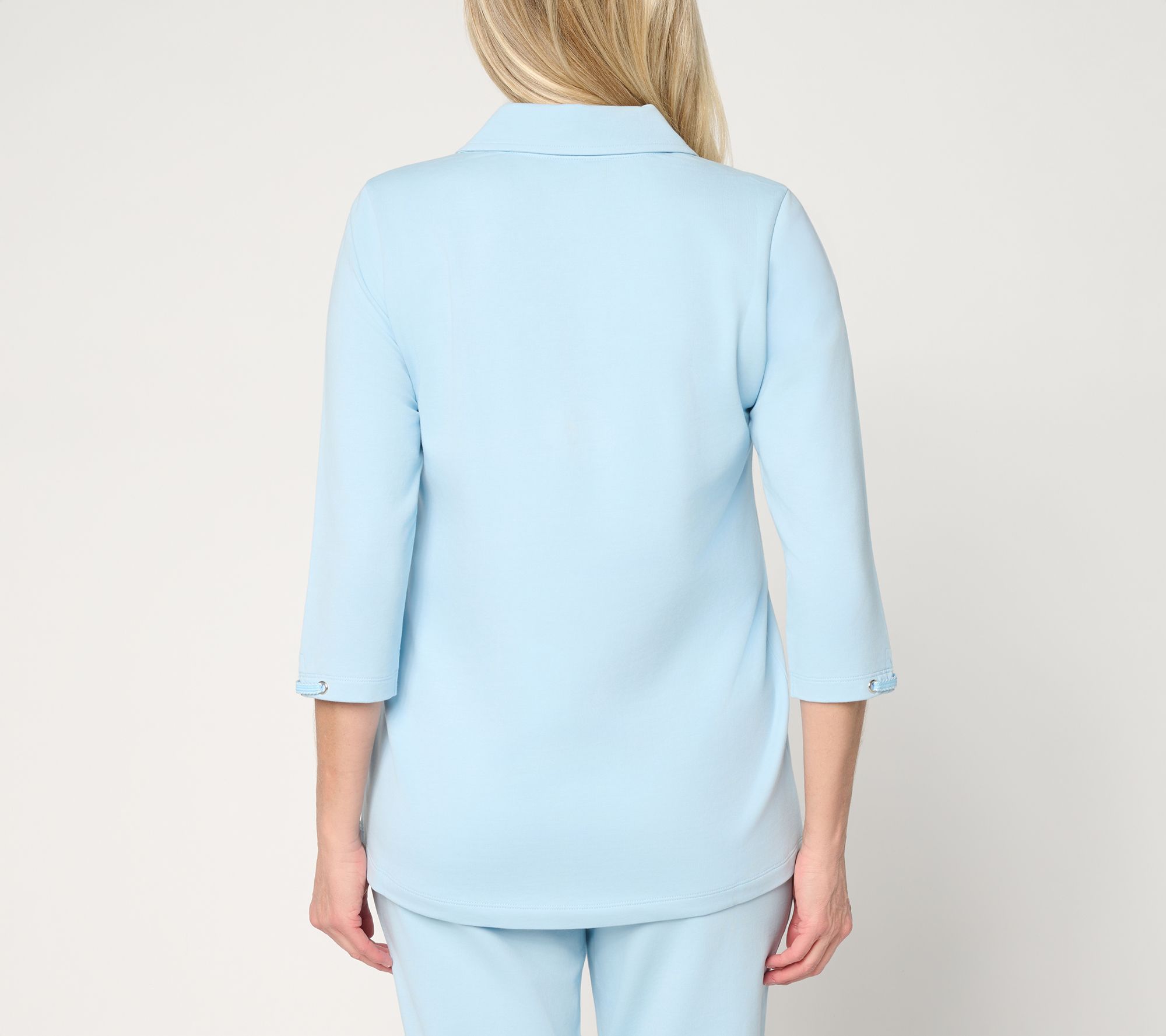 French terry's never fussy, but it def amps up the fancy with this collared top! Crisp trim details on the sleeves and a flattering V-neck with foldover collar elevates casual days without feeling overdressed. The soft knit offers just the right amount of ease, while a curved bottom hem and 3/4-length sleeves make it ideal for layering as the seasons shift. From Denim & Co.® Fashions.