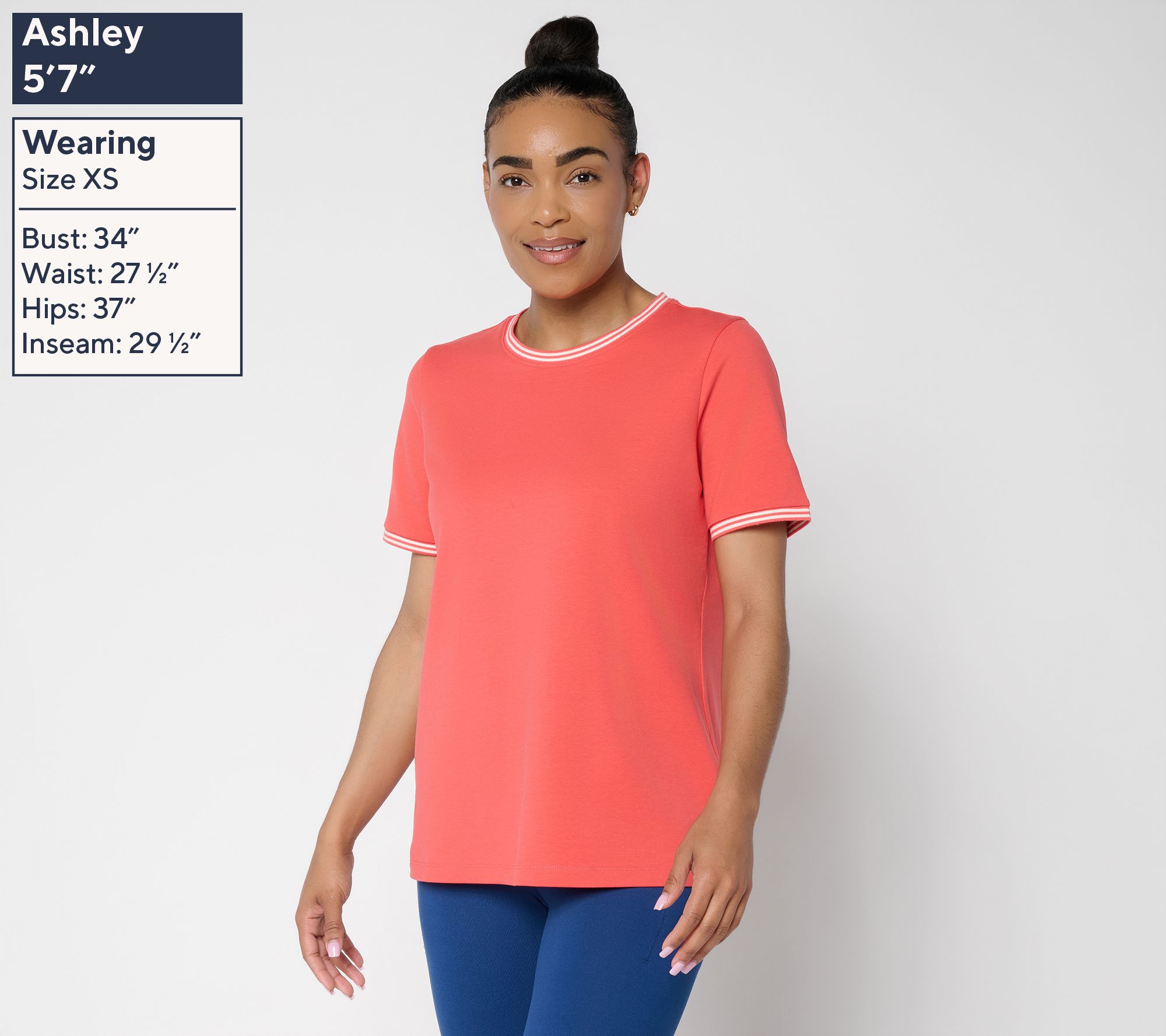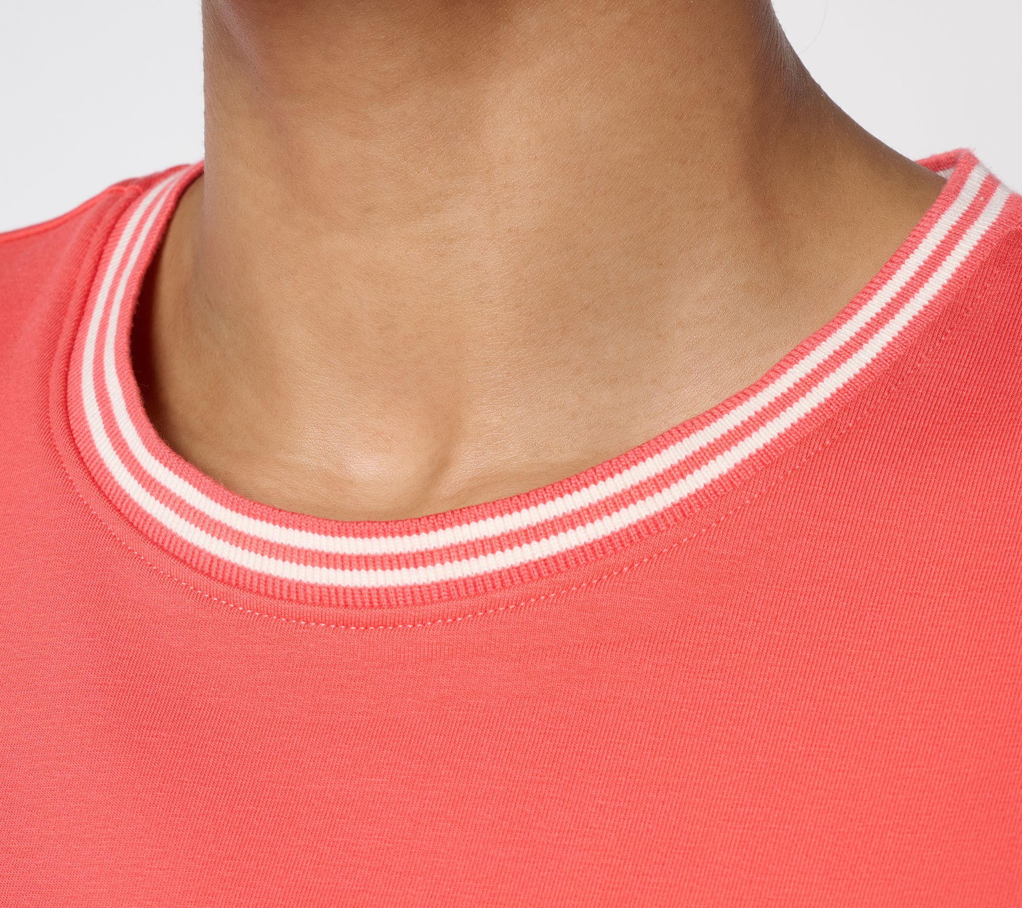 Features: ribbed and tipped round neckline and elbow-length sleeves, straight bottom hemline, side slits