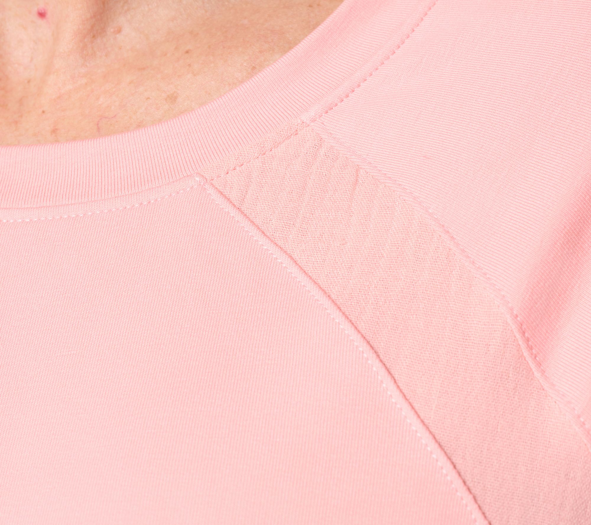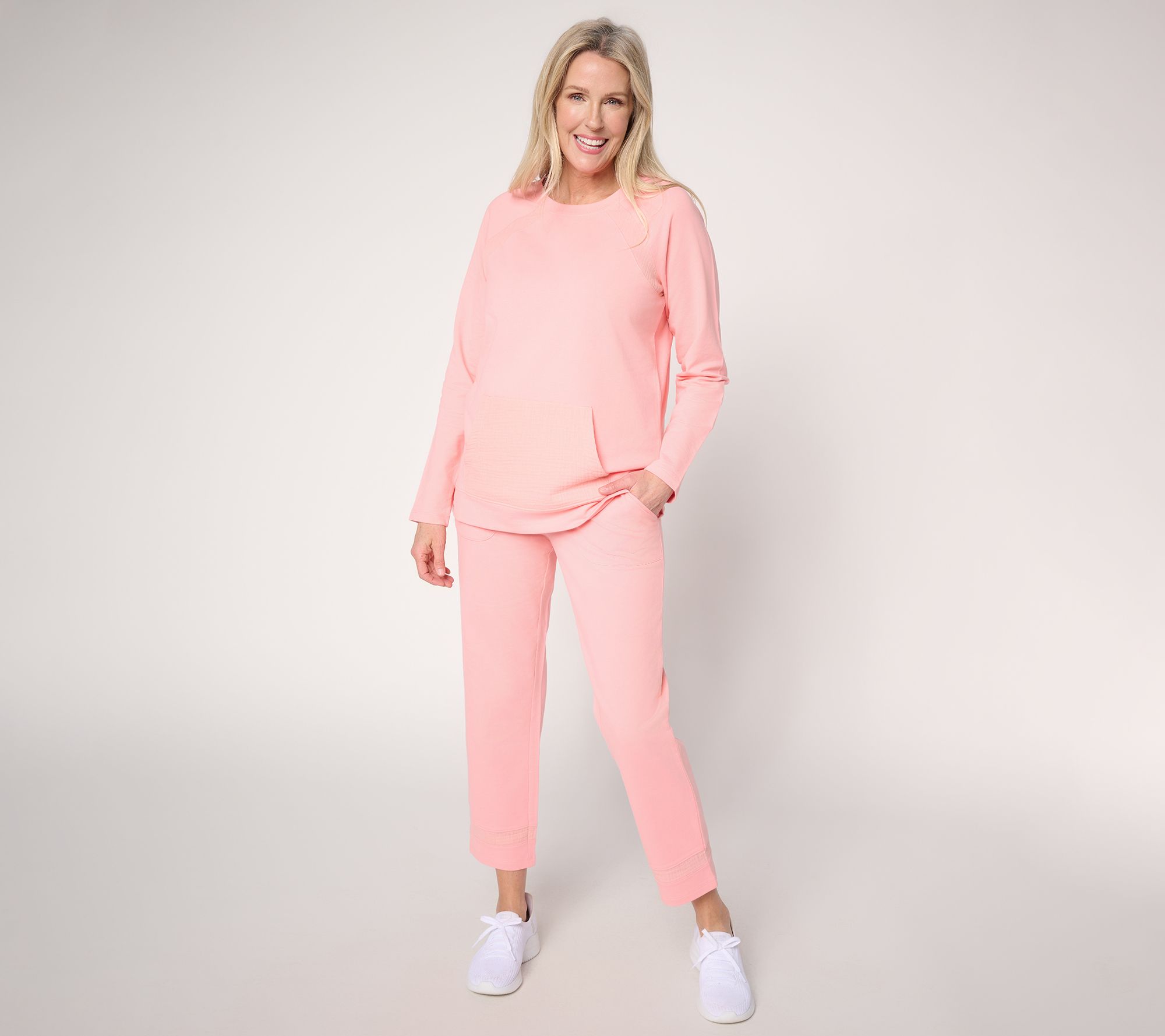 Seeking spring? Airy gauze at the raglan sleeves and front kangaroo pocket provide this French terry top with some fresh perspective. Layer it on for those breezy active days. From Denim & Co.® Fashions.