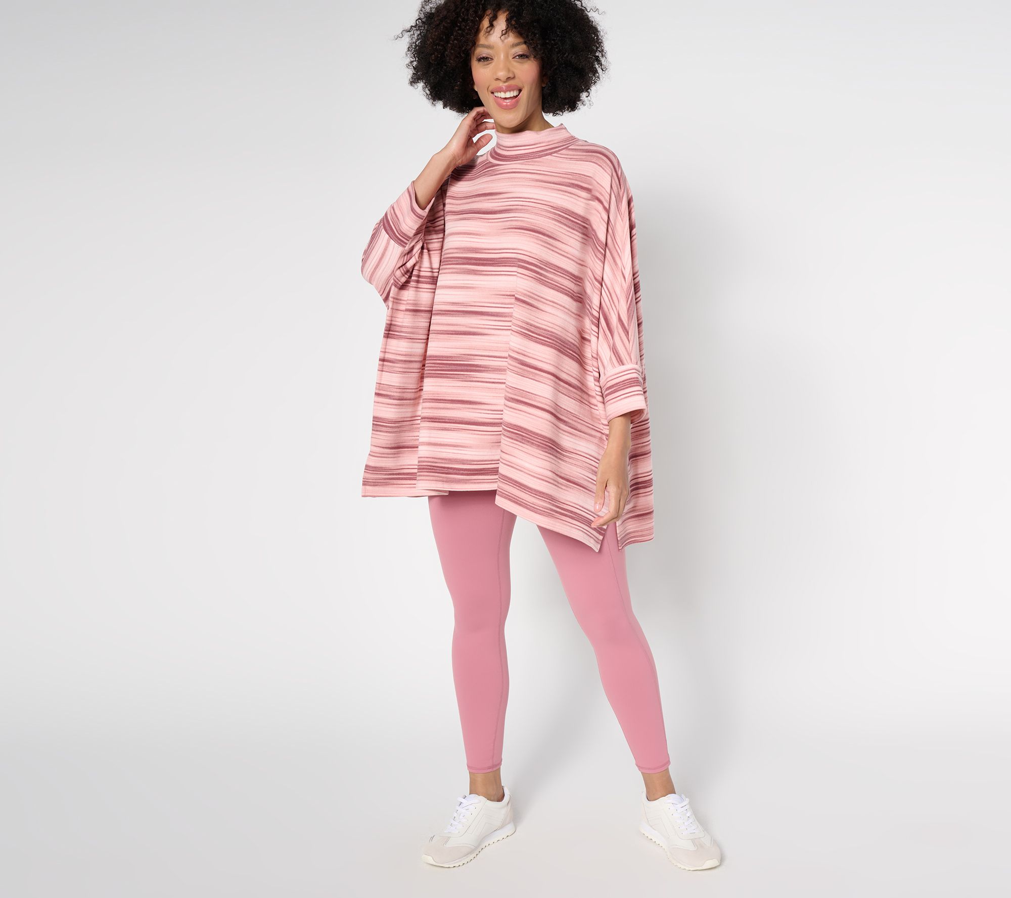 • Features: space-dye print, poncho style, wide mock neck, 3/4-length sleeves, wide cuff bands, high side slits