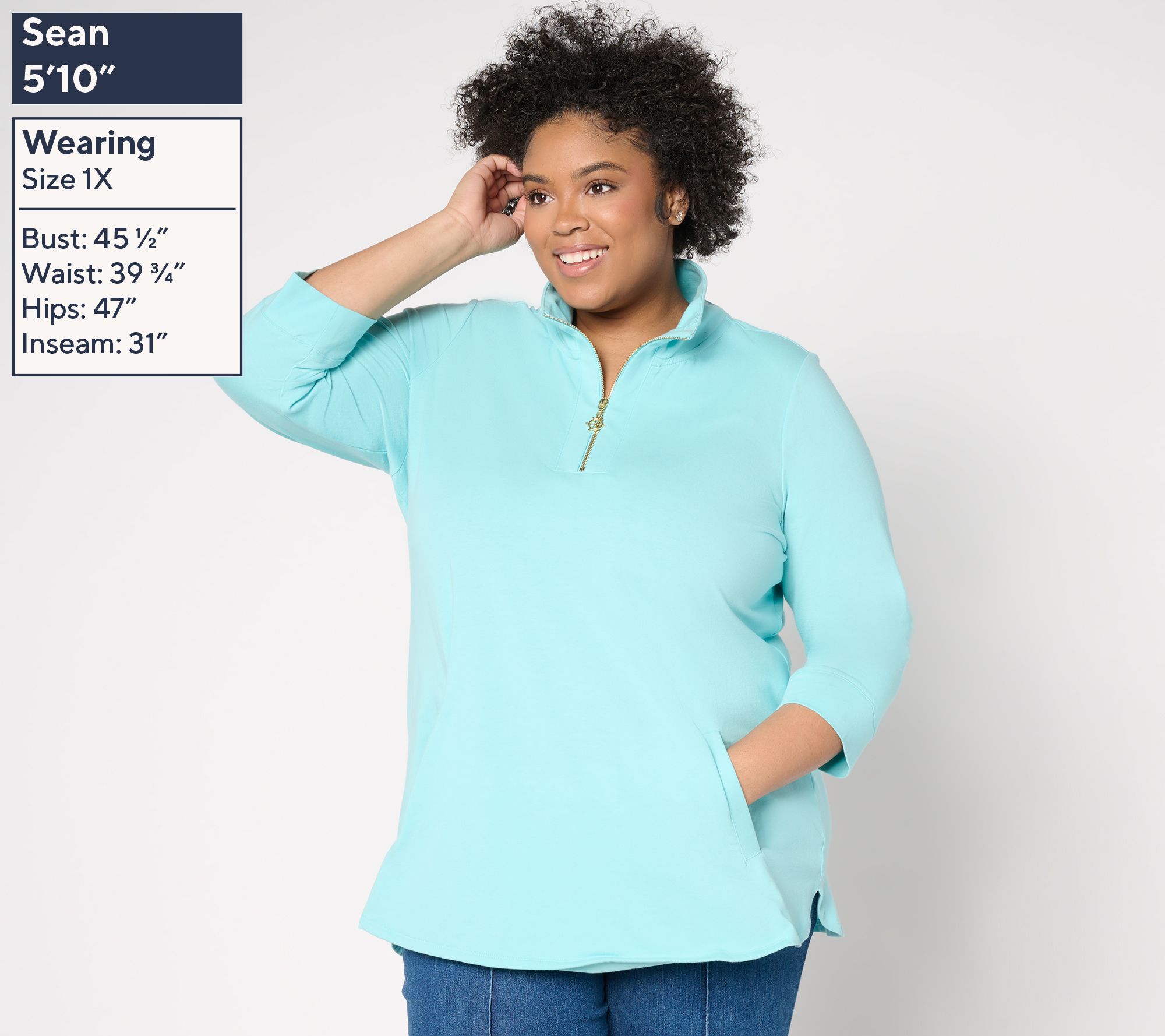 Set sail for a stylish day with this half-zip tunic. Designed with a floating welt kangaroo pocket and a nautical-themed zipper, this fab find brings practicality and flair to your everyday options. From Denim & Co.® Fashions.