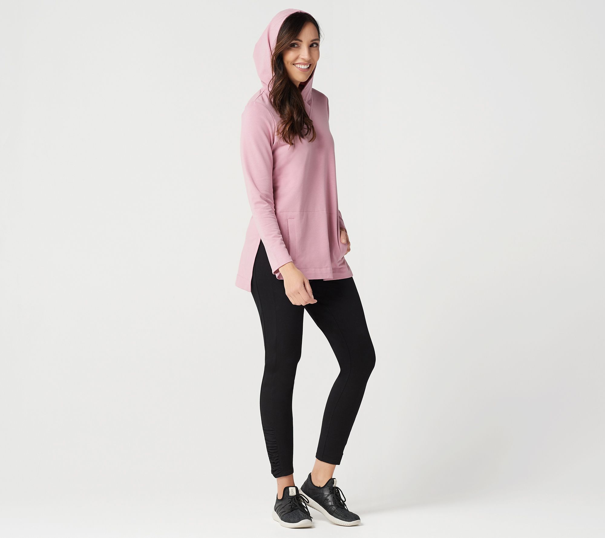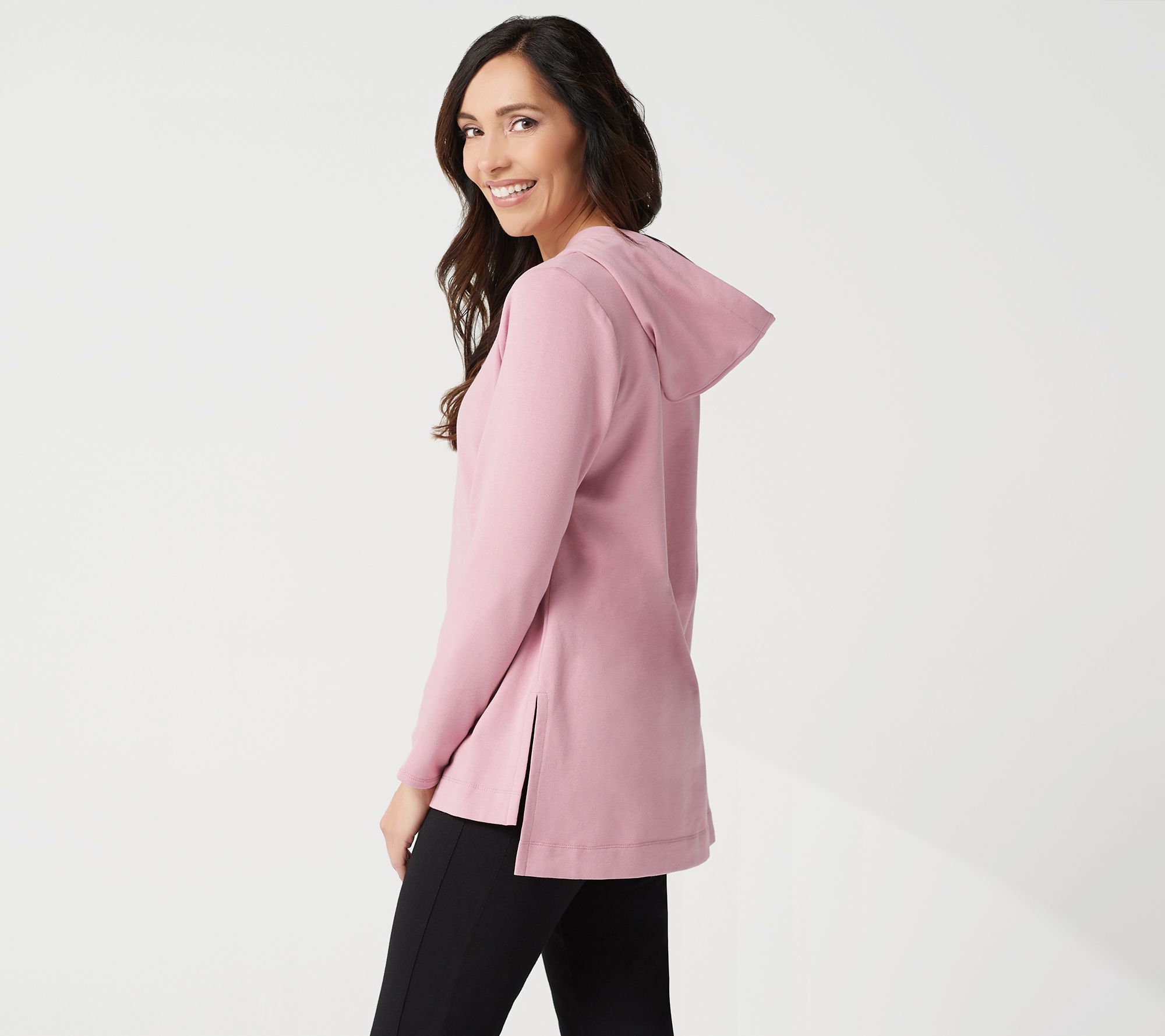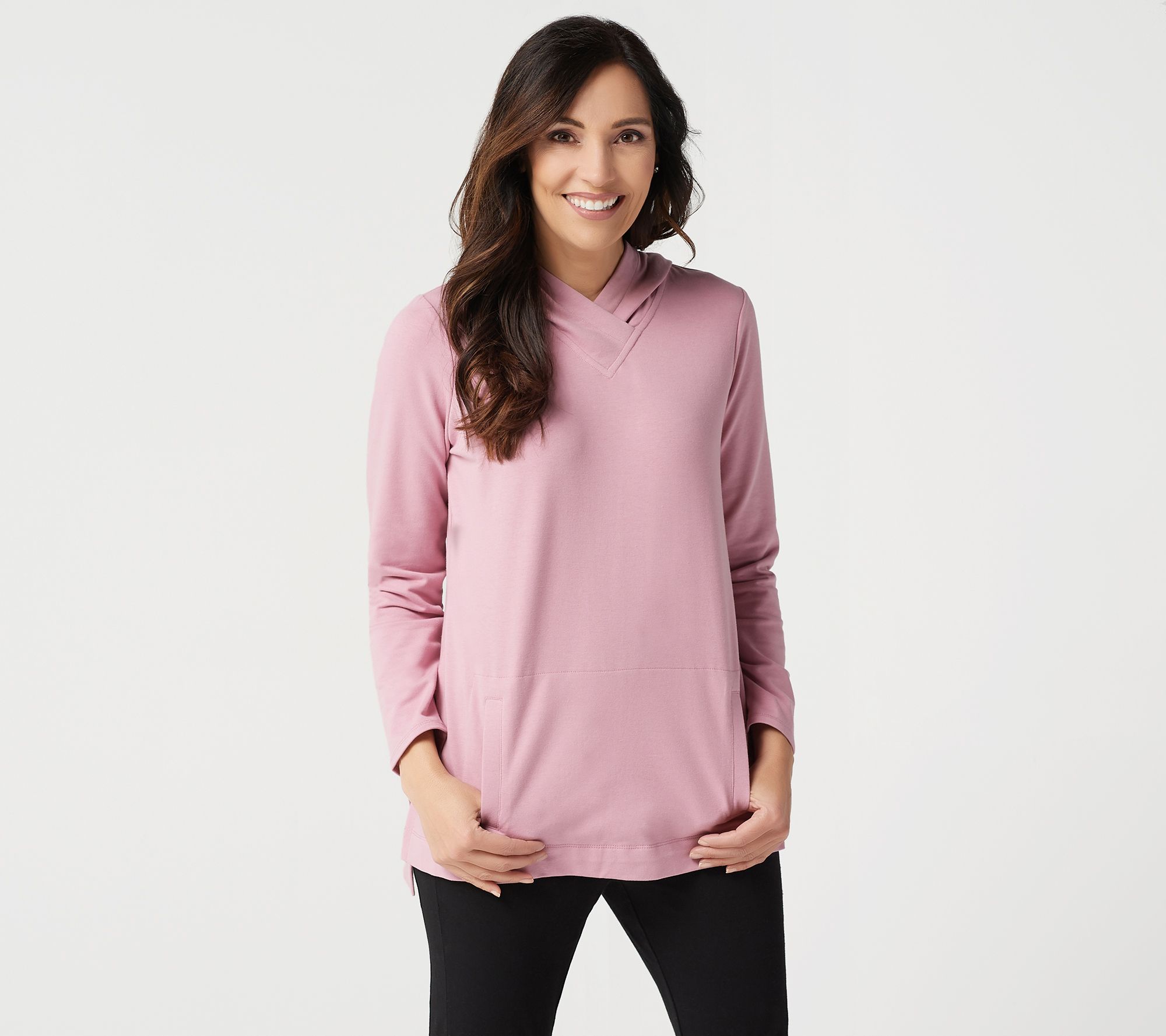 NO RETURNS Denim & Co., active, french terry, knit, tunic, hood, cente rback hood seam, long-sleeves, crossover v-neck, welt pockes with pock et bag, side slits, hi-low hem. Semi-Fitted:Follows the lines of the body with added wearin g ease. Length:Missy Range:27 1/2"-29 5/8". Plus Range:30"-31 3/4". Content: 68% Cotton 28% Polyester 4% Spandex Care: MWC/GC/WWLC/ONCBWN/TDL/WIIN. COO:Impoted(F).