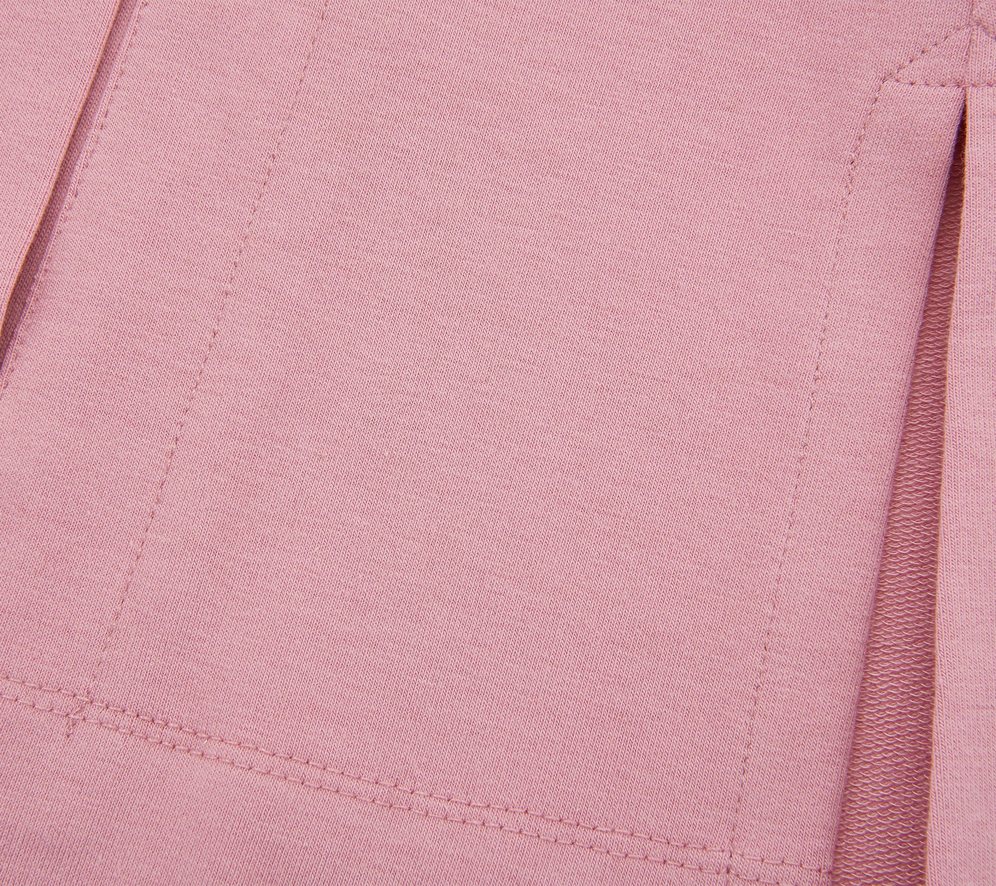 Features: tunic-length, hood with center-back seam, long sleeves, crossover V-neckline, welt pockets with pocket bag, side slits, hi-low hemline