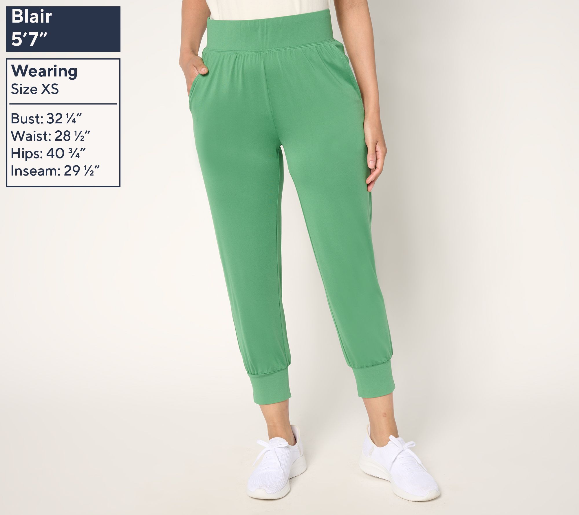 • Features: pull-on jogger style, cropped, elastic waistband, front pockets, cuffed hems