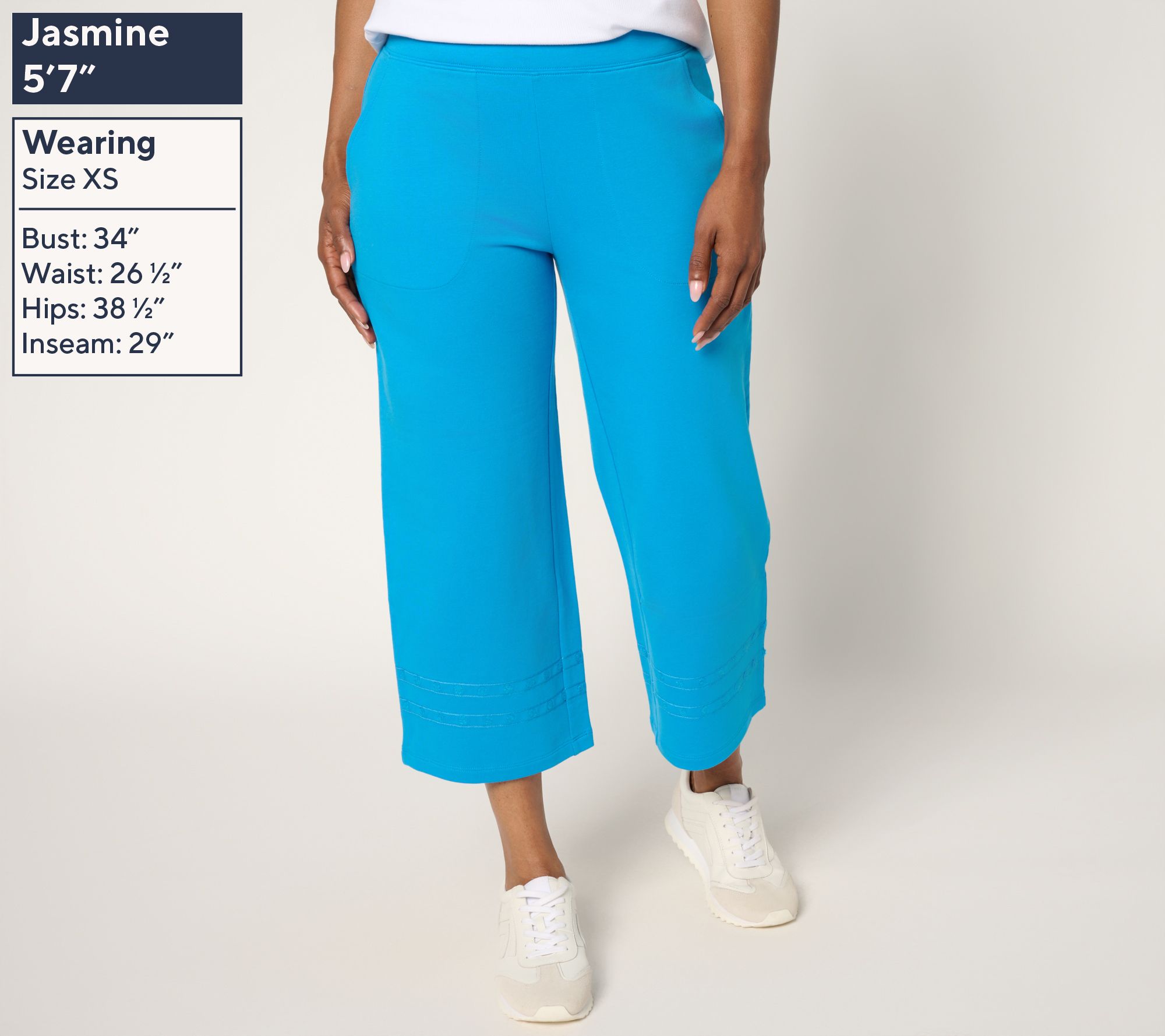 Features: pull-on style, elastic flat waistband, embroidery detail at hem, on-seam pockets, crop length