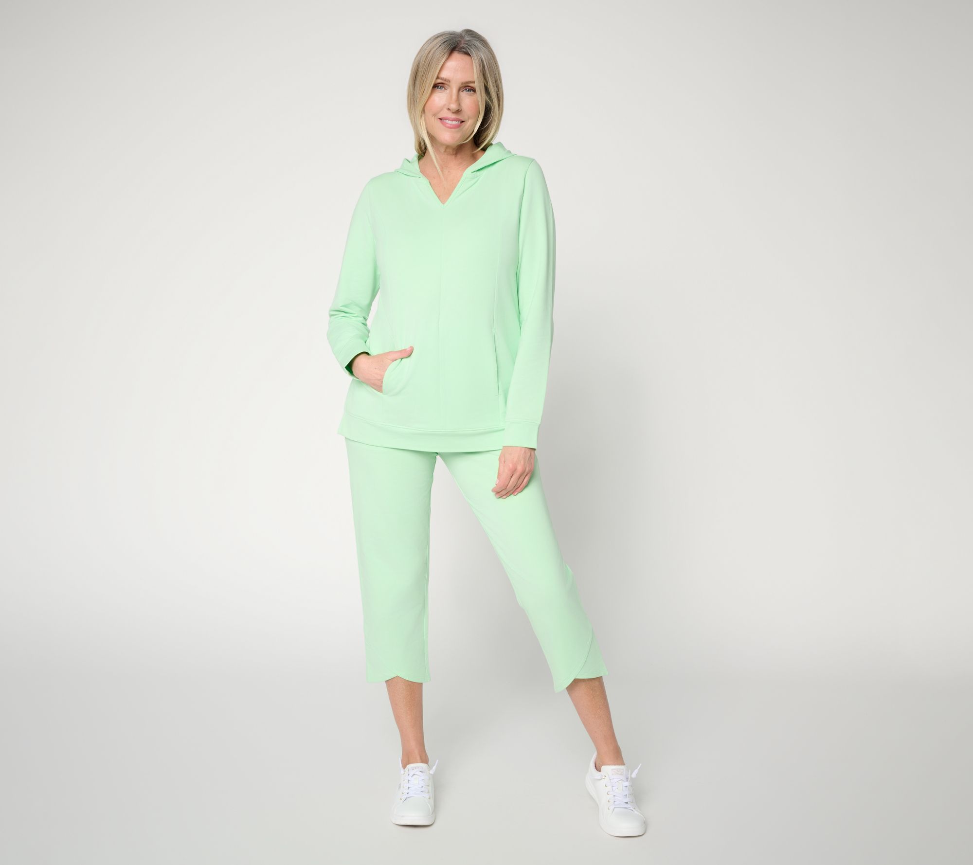 Flower power! Tulip hems on comfy French terry crops help bring the let's do this energy to active days and chill days alike. From Denim & Co.® Fashions.