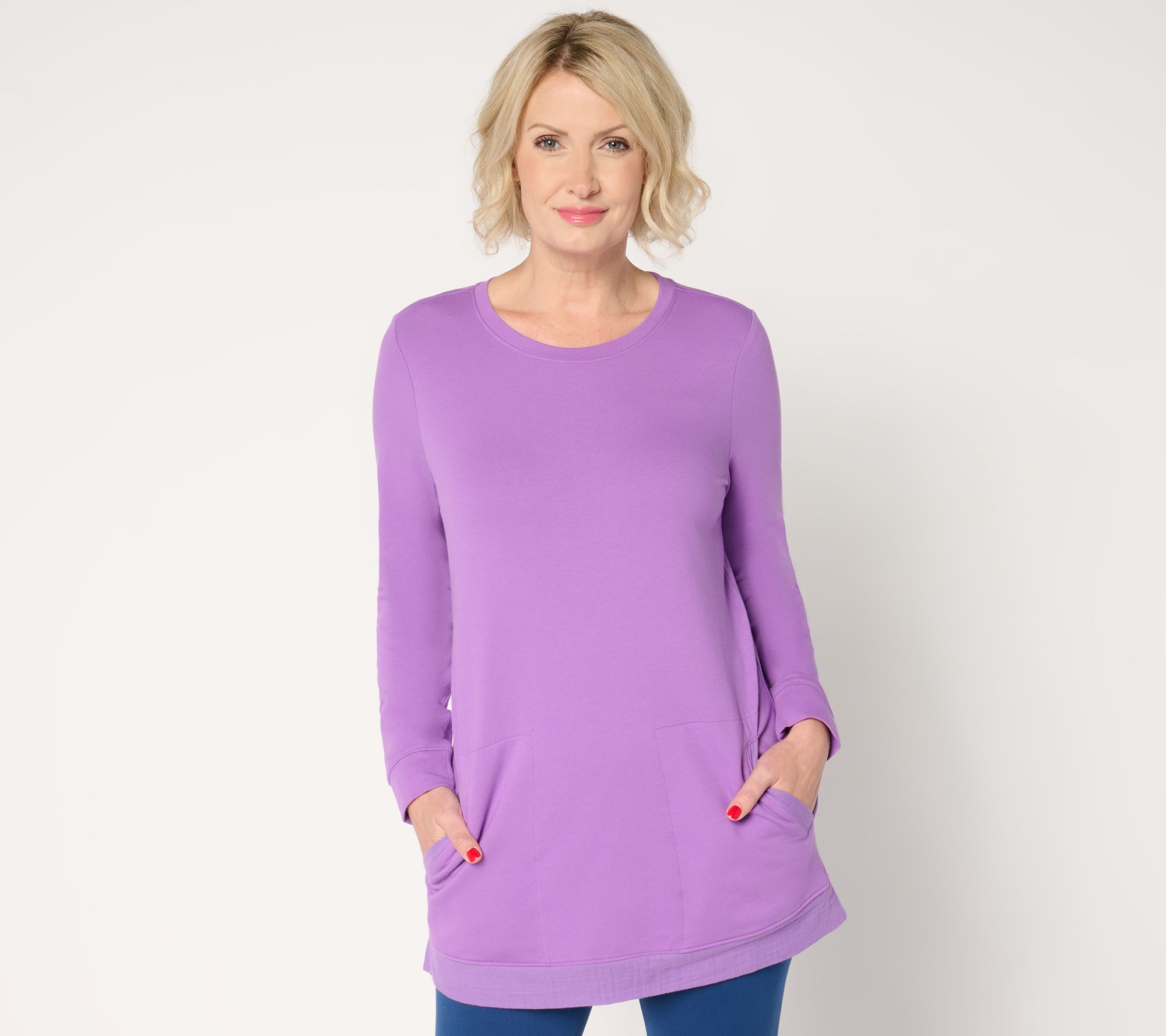 Ideal for layered looks, this lovely French terry tunic's gauze trim makes it a go-to for relaxed weekends and everyday errands. Pair it with your favorite leggings and sneakers for a chic, comfortable ensemble. From Denim & Co.® Fashions.