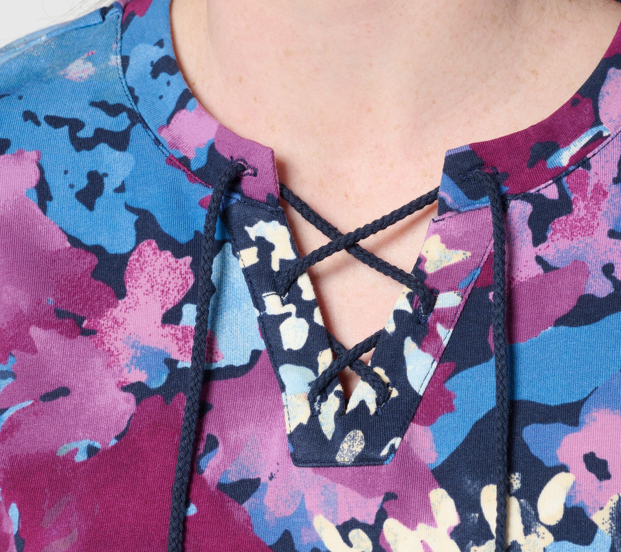 • Features: 3/4-length sleeves, drawcord detail at neckline, self-folded arm cuff, side slits at hem, printed design