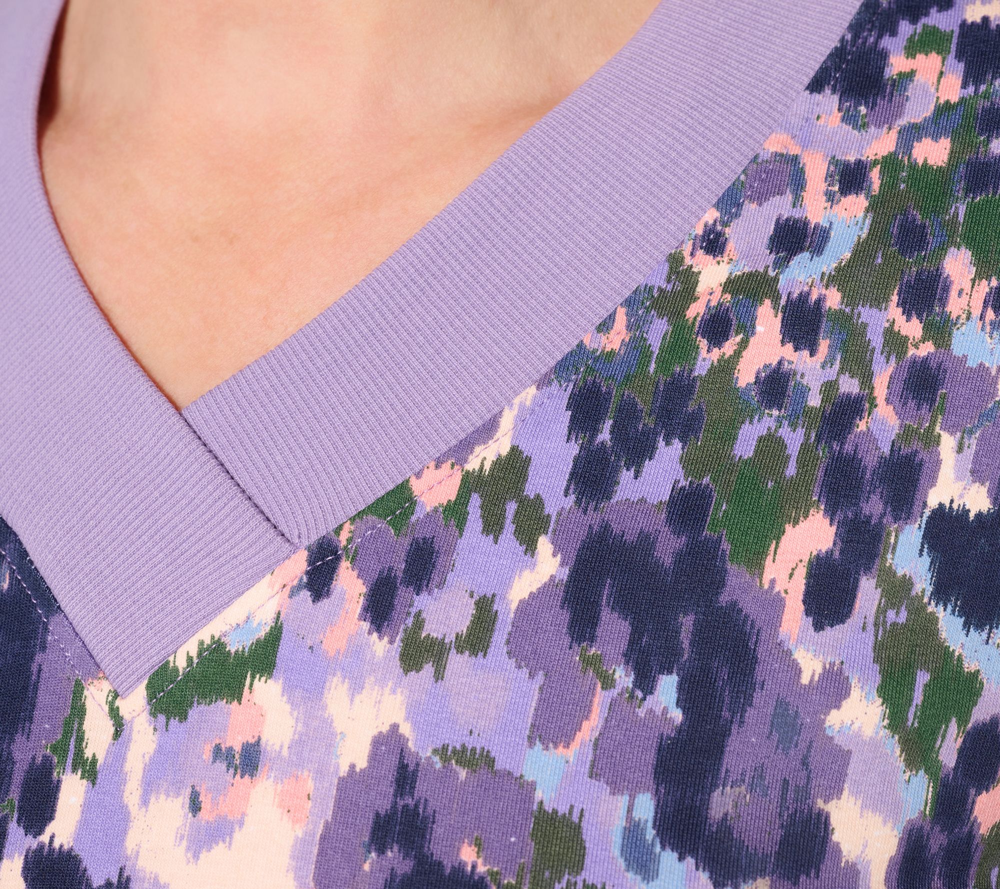 Your weekend errands or morning walk just got cozier! This brushed-back French terry tunic brings soft warmth and sporty style to your everyday look. A ribbed crossover V-neck, long sleeves, and printed finish make it easy to pair with leggings for relaxed moments at home or jeans for casual plans. From Denim & Co.® Fashions.