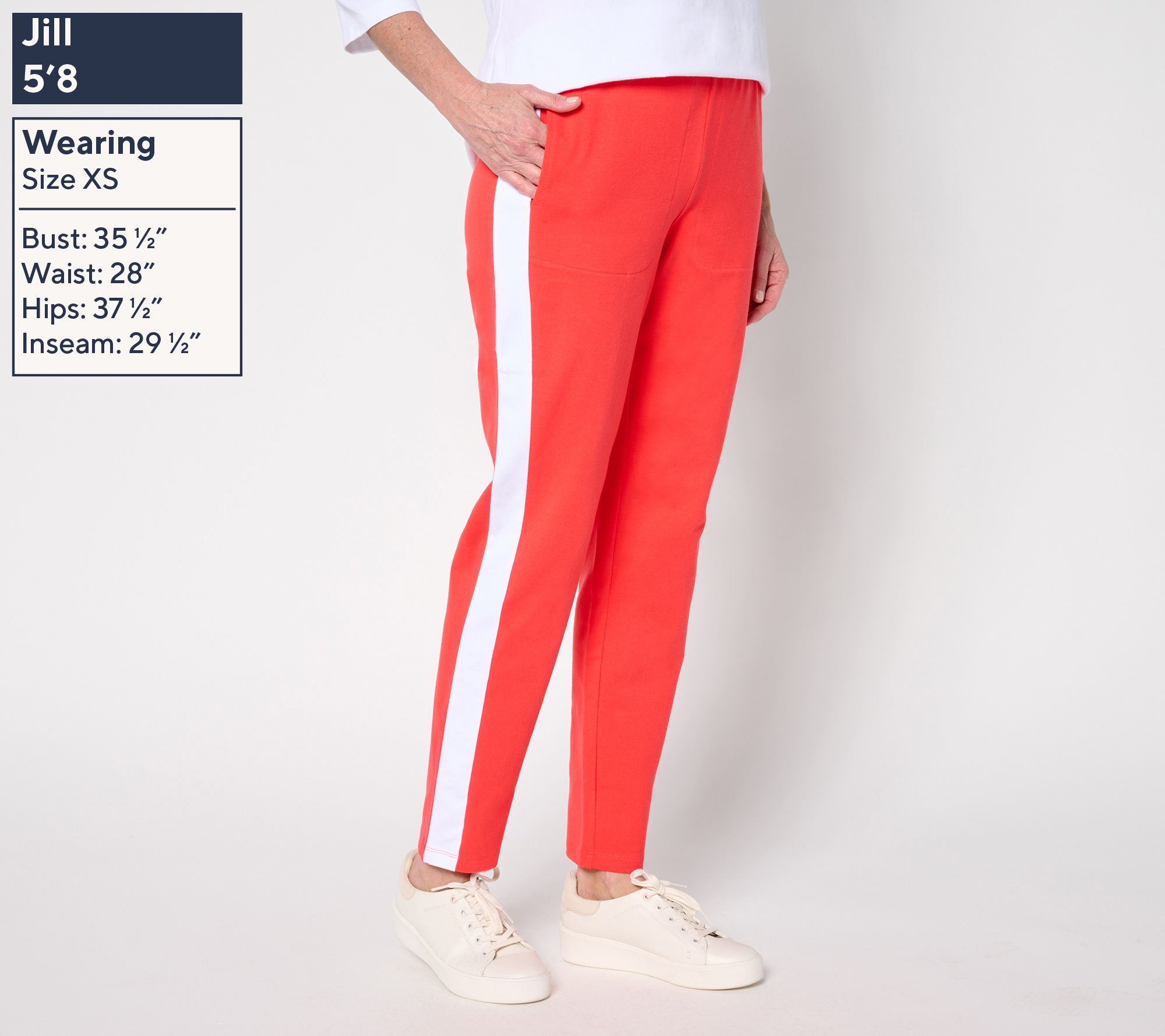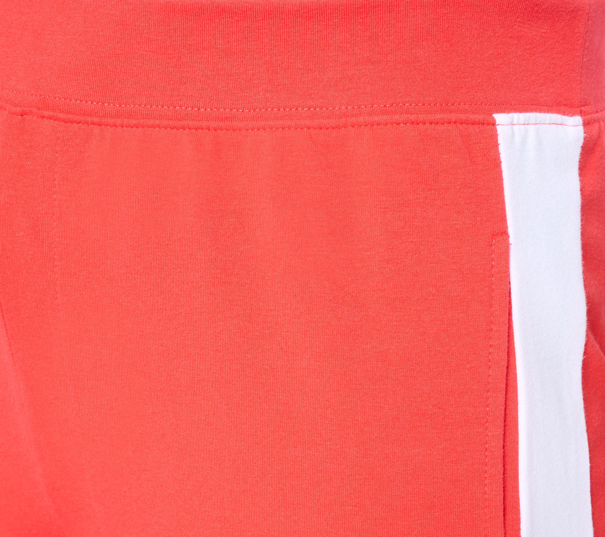 Features: foldover waistband with encased elastic, on-seam front pockets, contrast forward panel detail along vertical of legs
