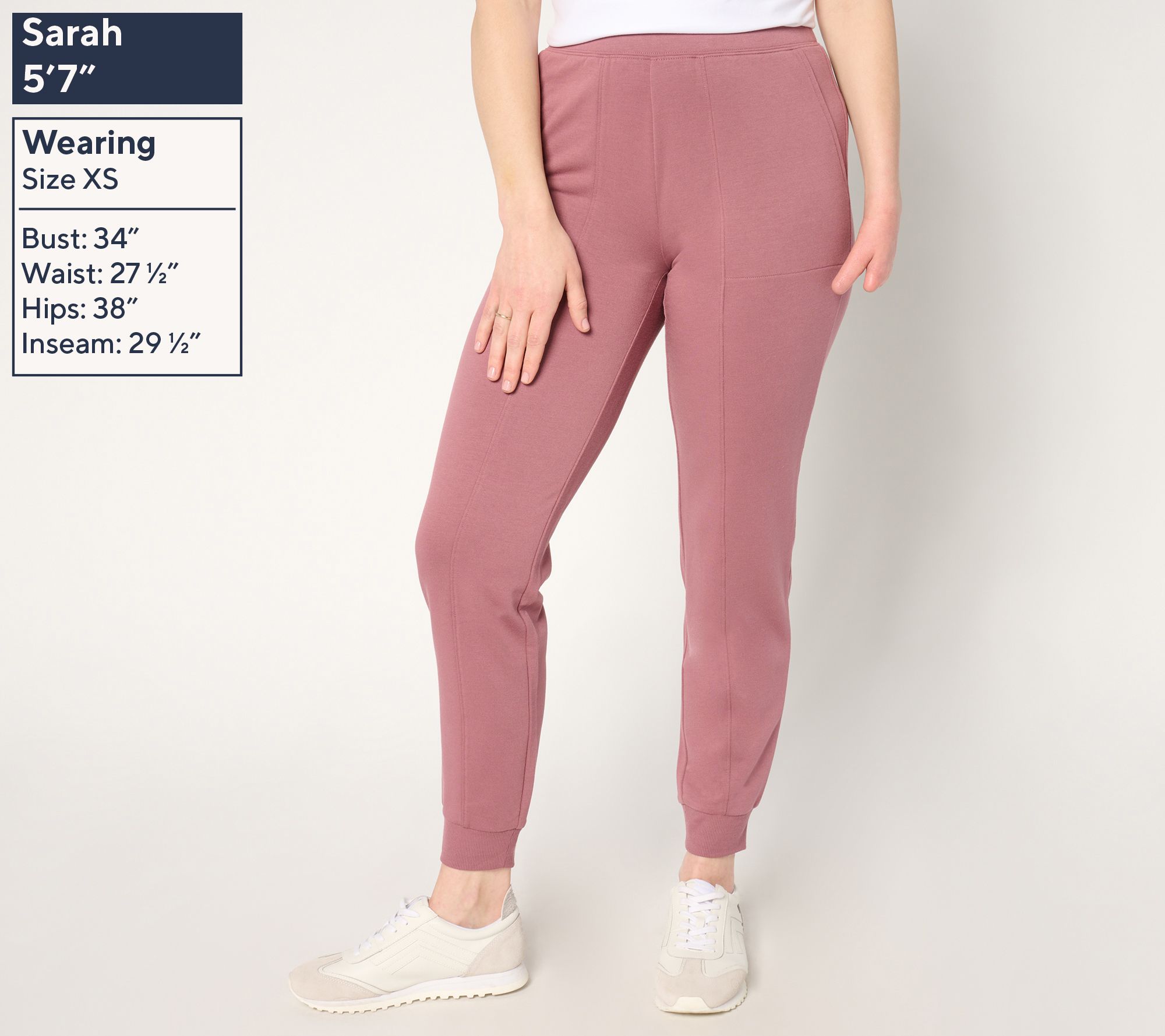 Features: pull-on style, elastic waistband, front slash pockets, rib folded cuffs, center front leg seam detail