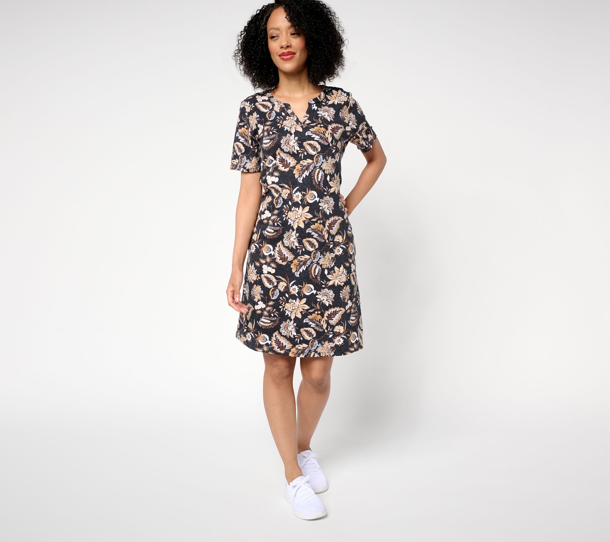 Casual weekends and active afternoons get a boost of comfort from this printed French terry dress. The split V-neckline and short sleeves keep your style relaxed, while on-seam pockets bring function for everything from park strolls to sidewalk cafes. From Denim & Co.® Fashions.