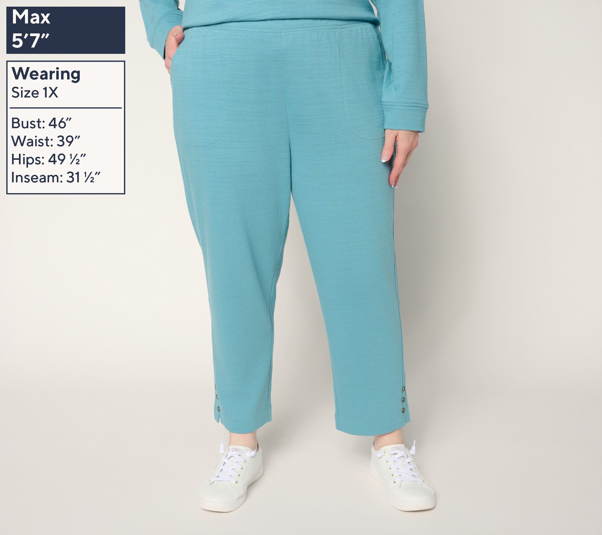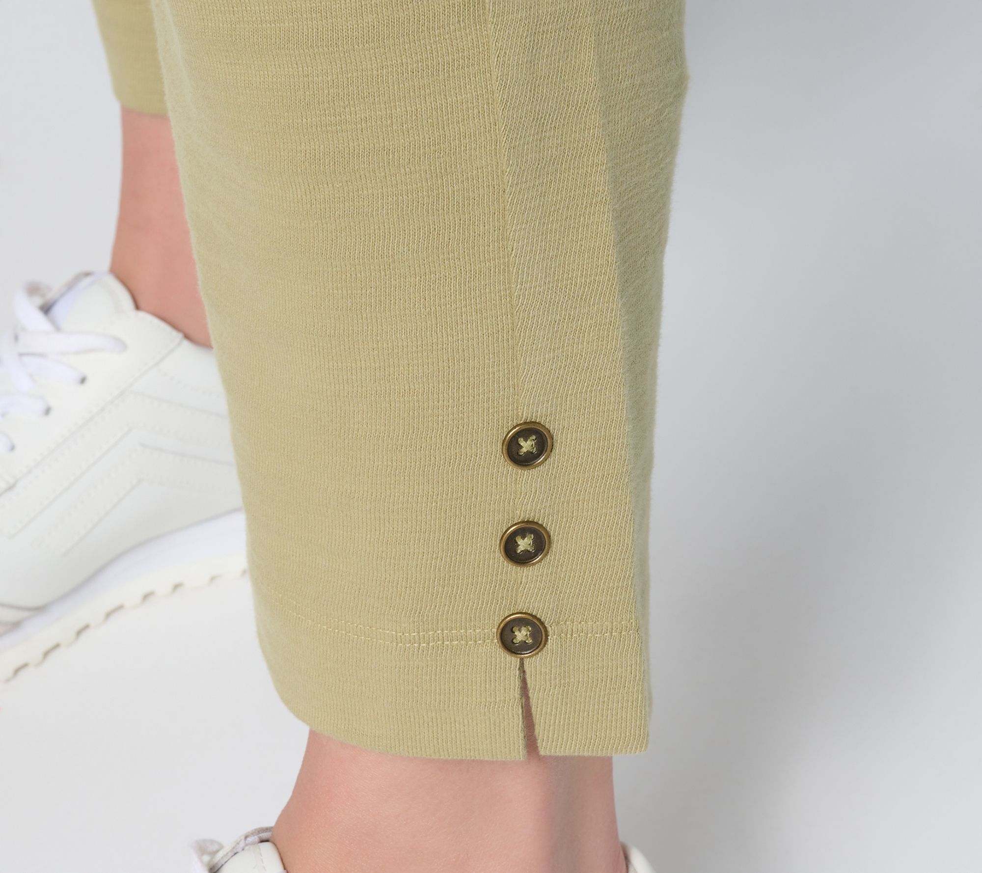 • Features: pull-on style, elastic waistband, front slash pockets, forward side seam with slit, non-functional button detail at hem, crop length