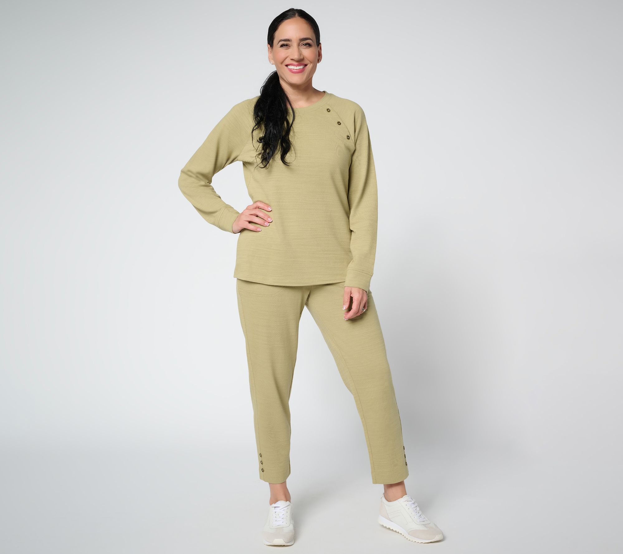 Active lifestyle need put-together looks that can keep pace. Offering a pull-on style and easy straight leg, these textured all-cotton crops offer fuss-free comfort along with button detail at the leg hem to keep your look cute. So, whether you're up for some playground time with the grands or all in for fall pickleball, you've got the perfect pant for all of it. From Denim & Co.® Fashions.
