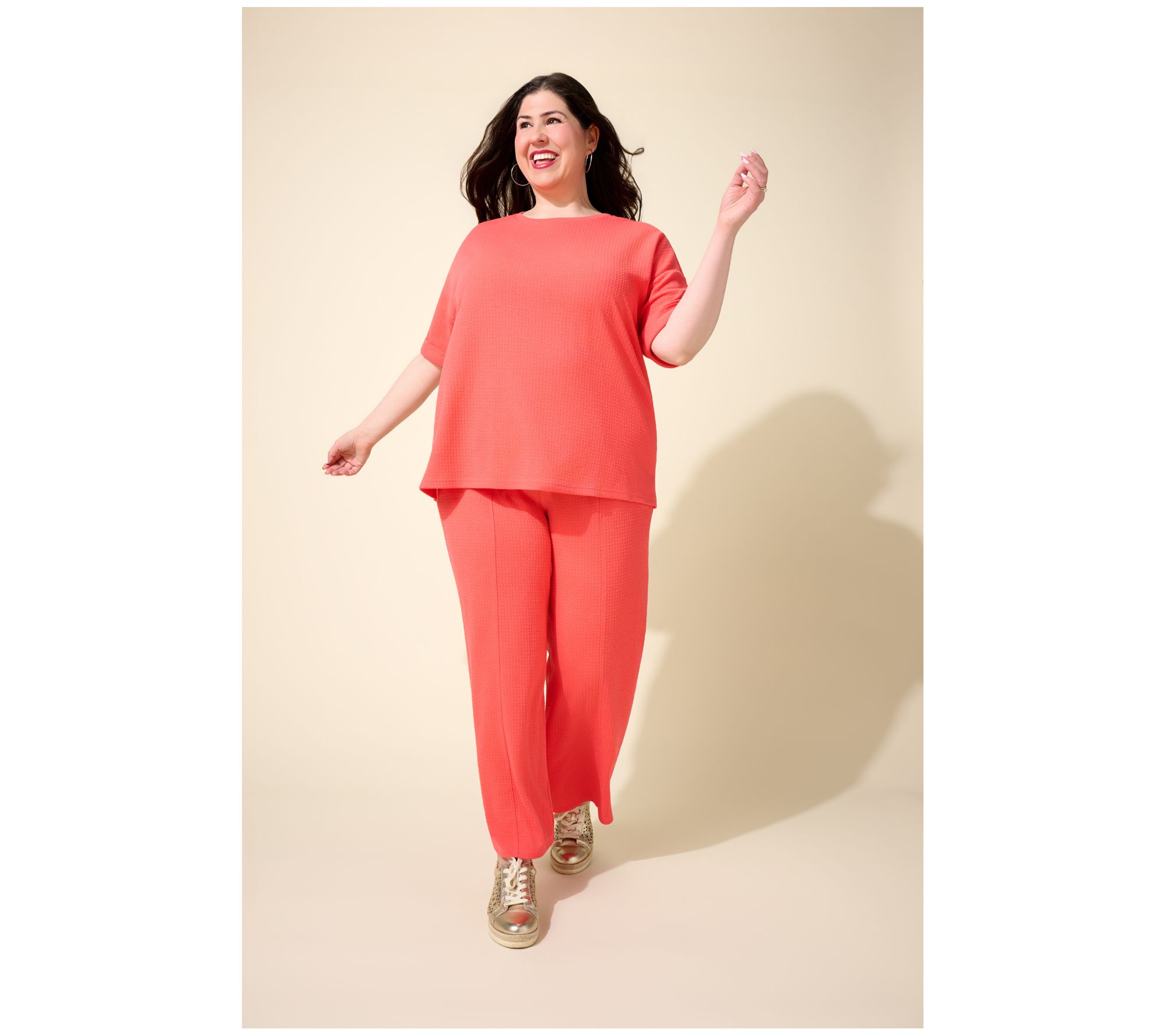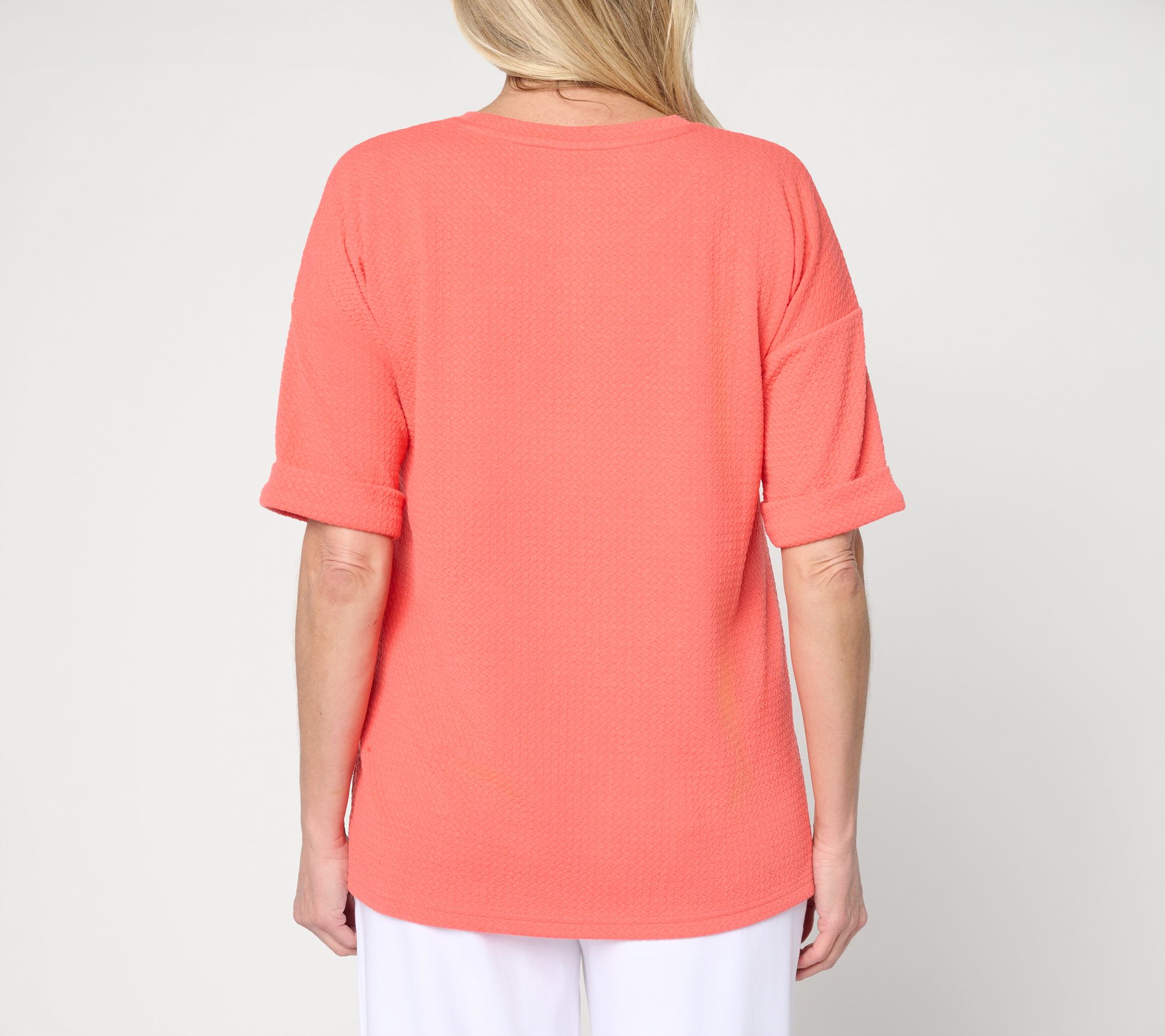 An everyday favorite in the making, this textured jacquard top is fashioned with a drop shoulder, elbow-length sleeves, and rolled and tacked cuffs. Angled slits provide ease of movement. From Denim & Co.® Fashions.