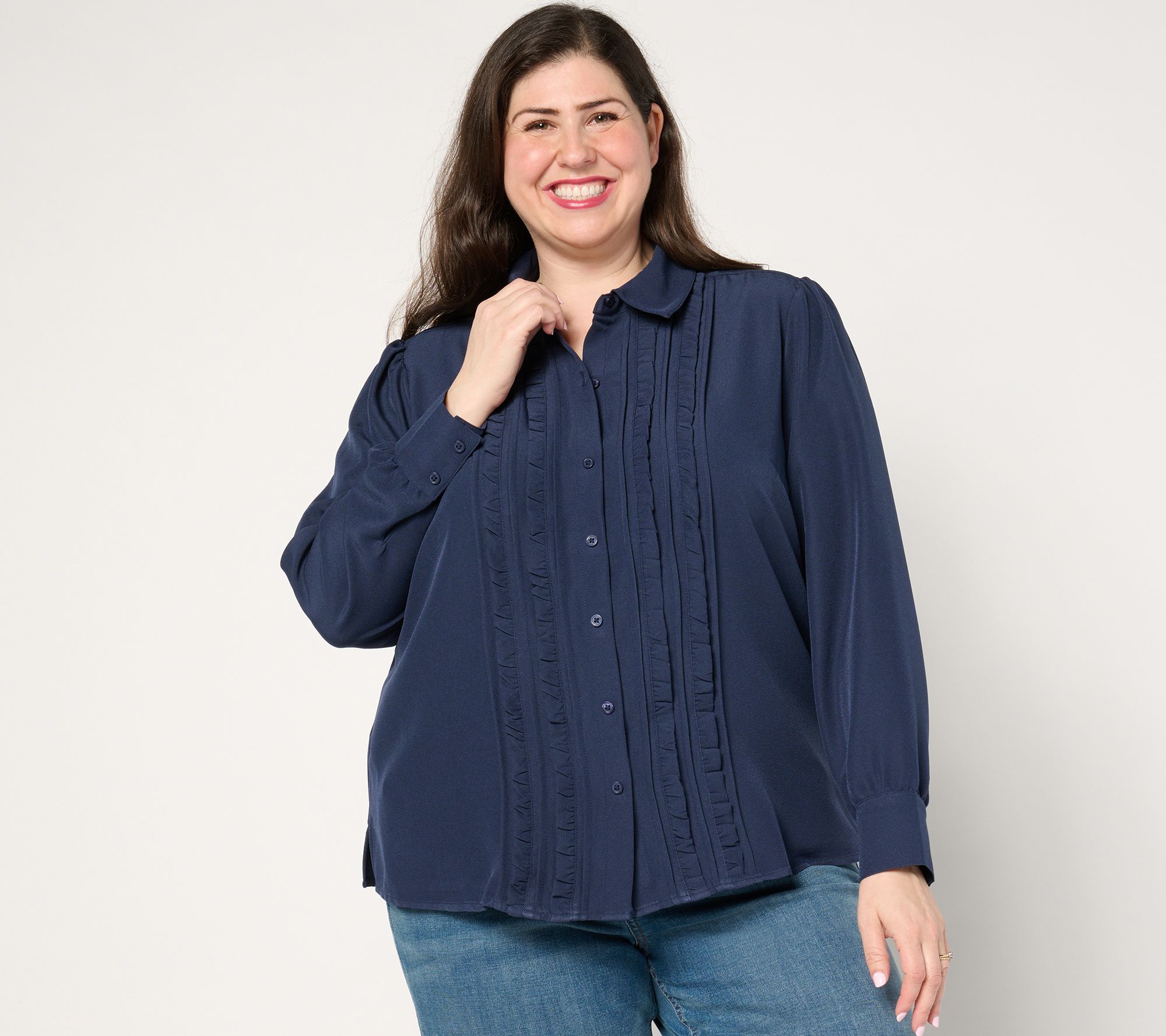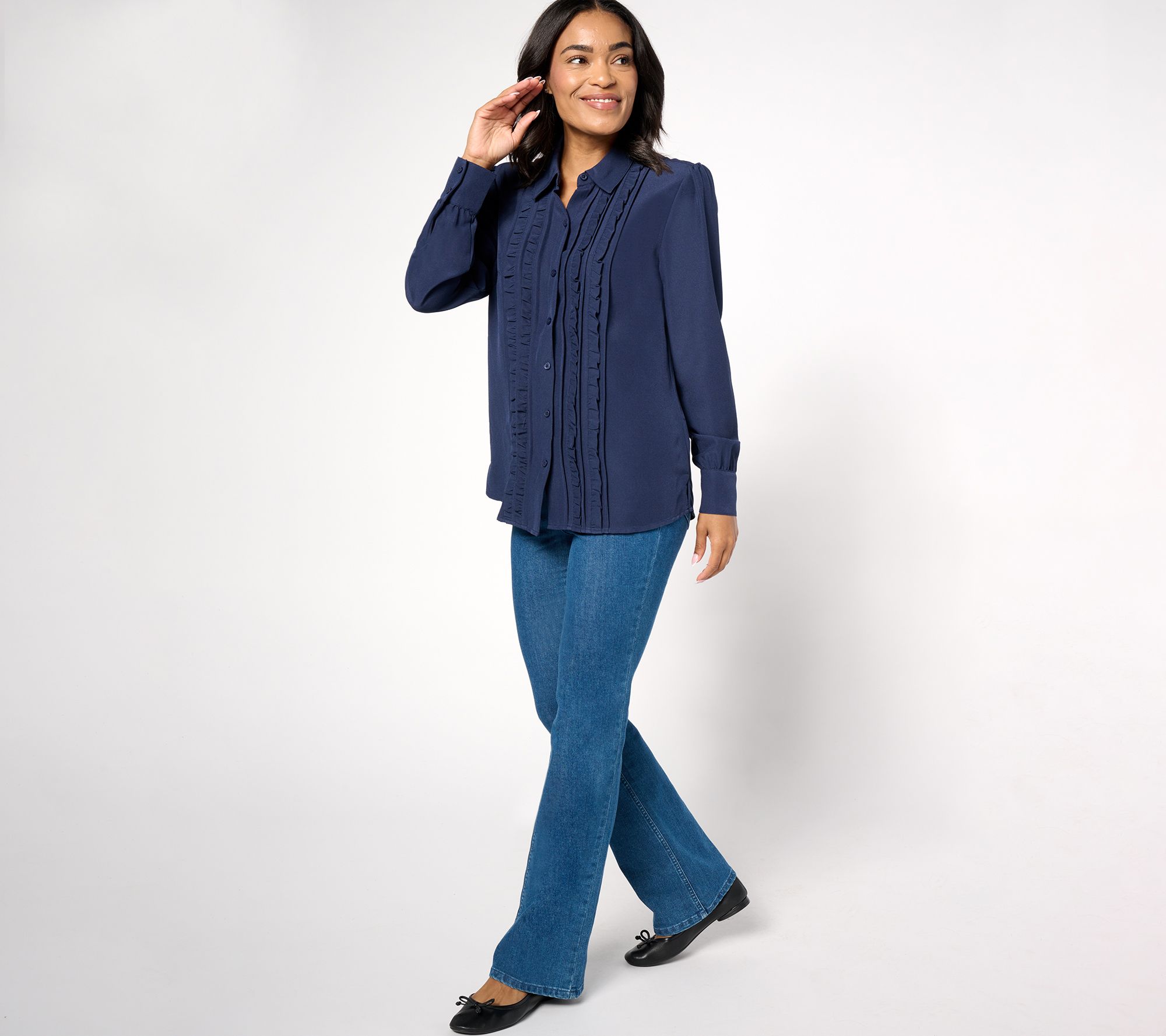 Savor the sweetness of spending time with friends, attending a performance, or spreading your work wings dressed in this charmingly ruffled button-front top. A magnetic front closure adds ease to your get-ready routine. From Denim & Co.® Fashions.