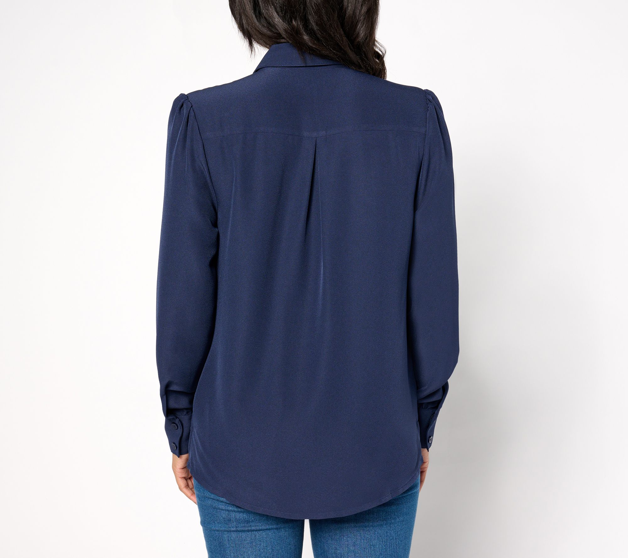 • Features: ruffled front, puff sleeves, collar, shirred cuffs, side slits, shirttail hem