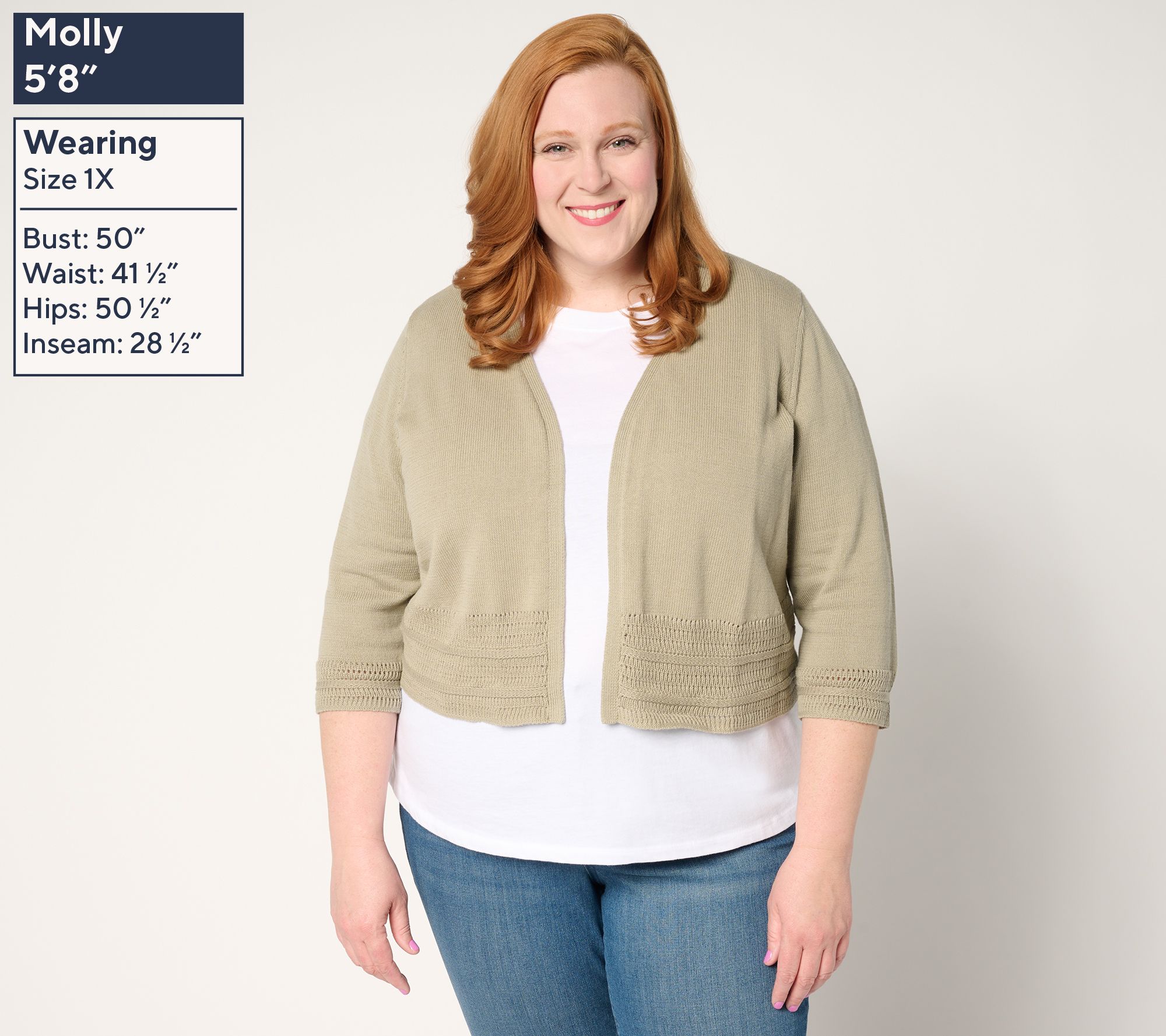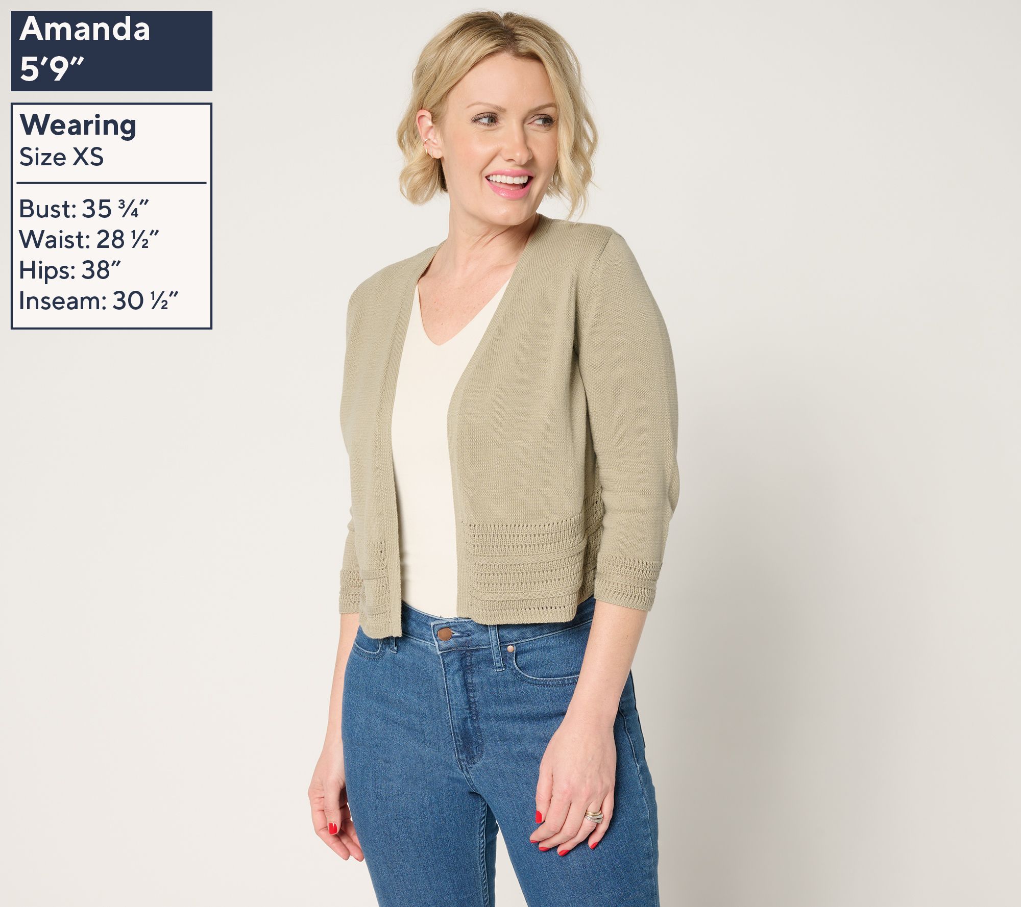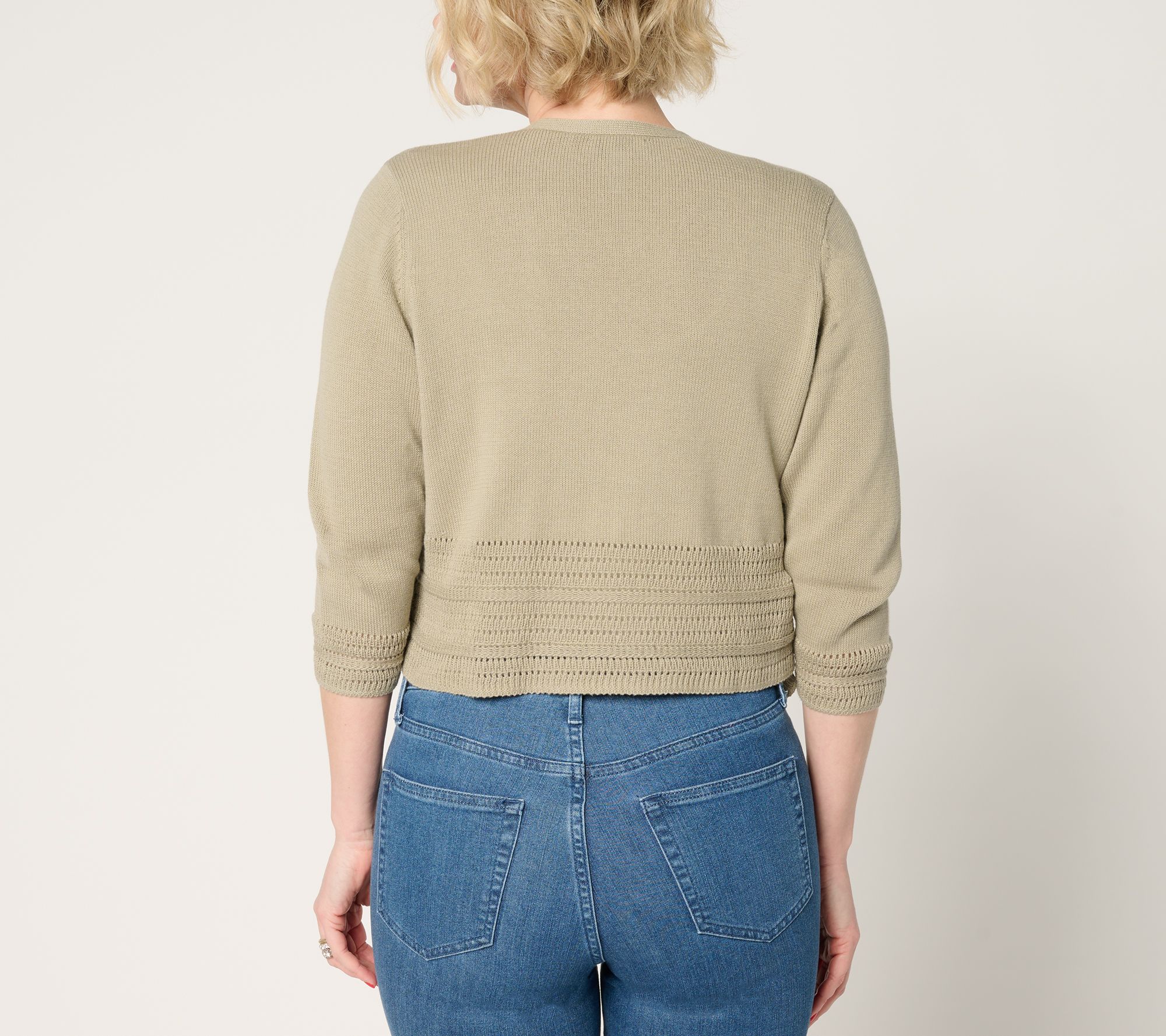 • Features: open front, set-in 3/4-length sleeves, fully-fashioned armholes, pointelle stitch hem