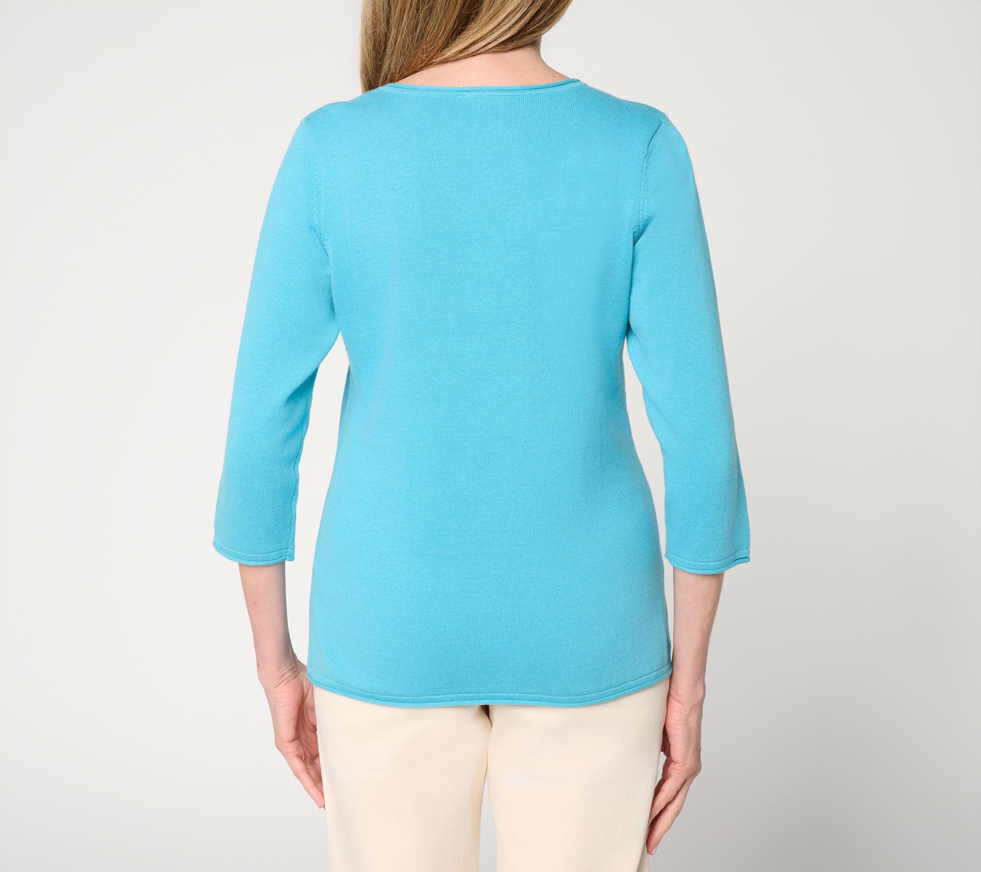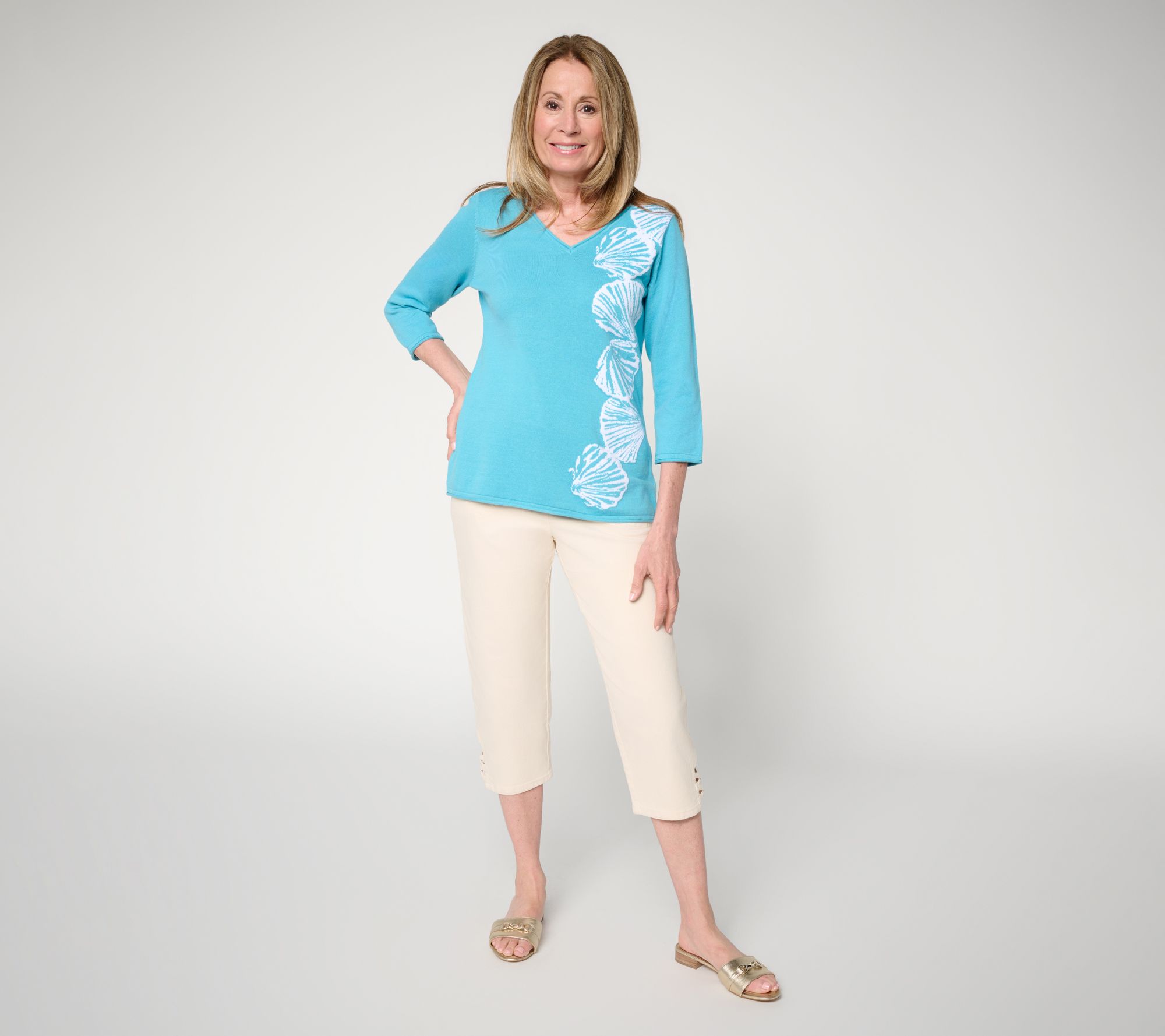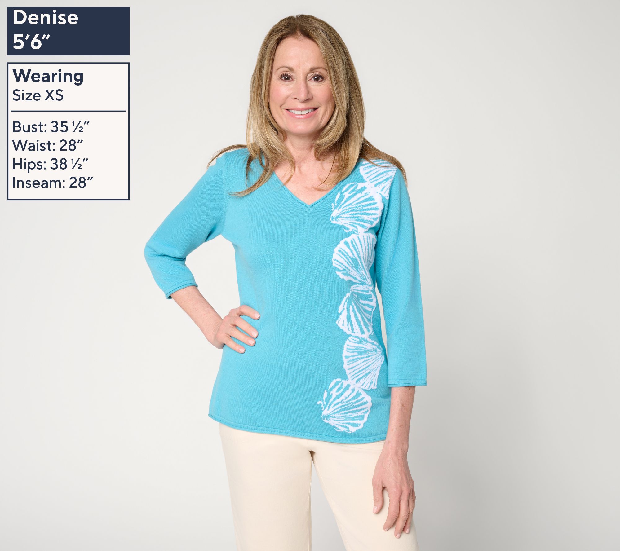 Denim & Co. Beach 3/4 Sleeve V-Neck Sweater w/ Shell Motif