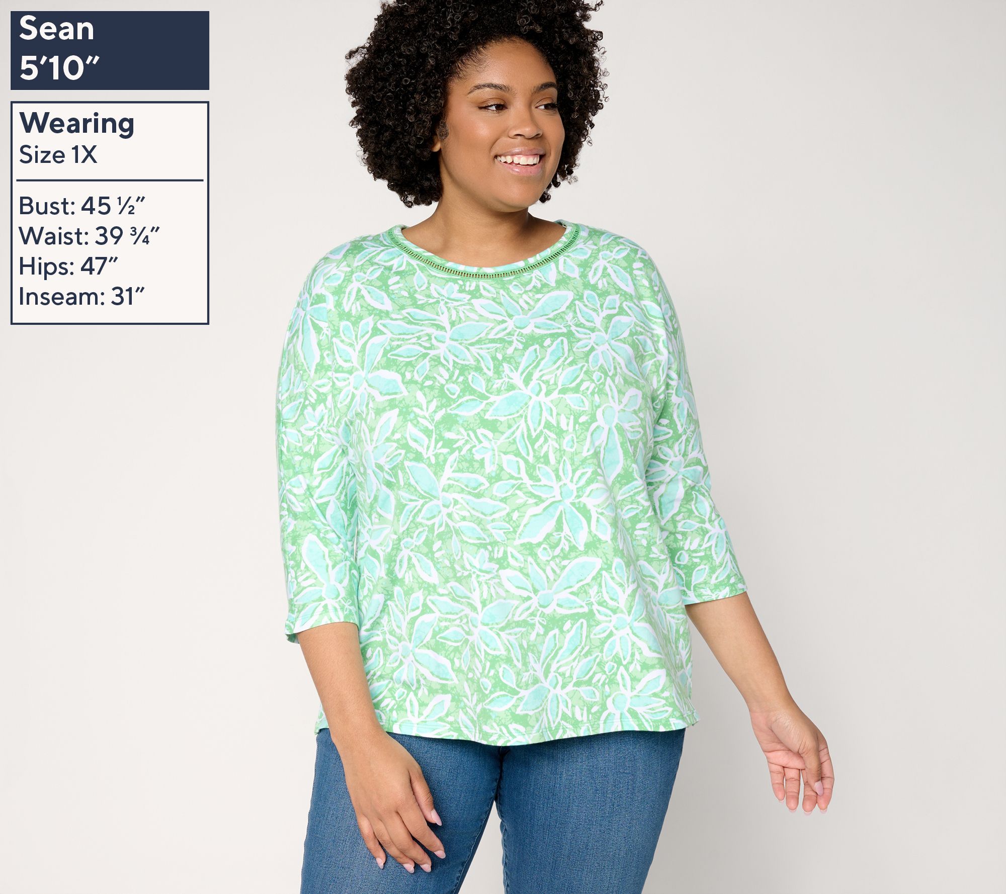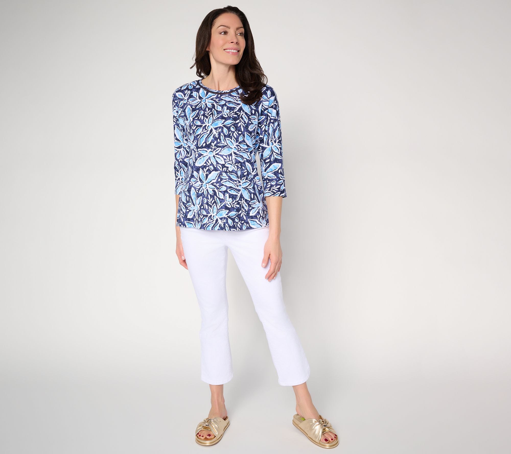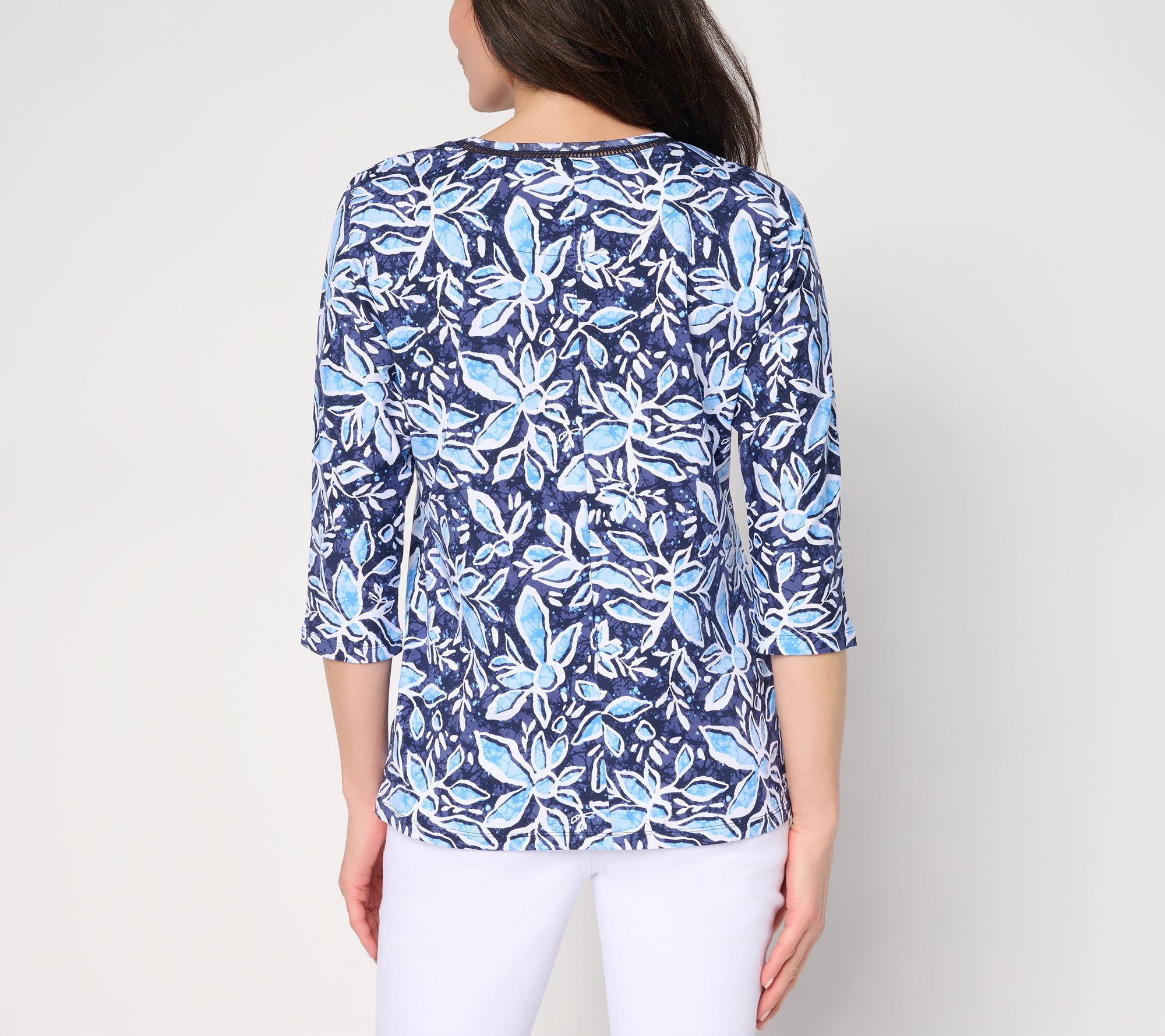 Sunny strolls, family picnics, or afternoons by the boardwalk -- this floral-printed jersey top brings cheerful style to whatever your day holds. Soft knit fabric, pretty ladder lace details, and 3/4-length sleeves keep you comfortable and stylish from morning to night. From Denim & Co.® Fashions.